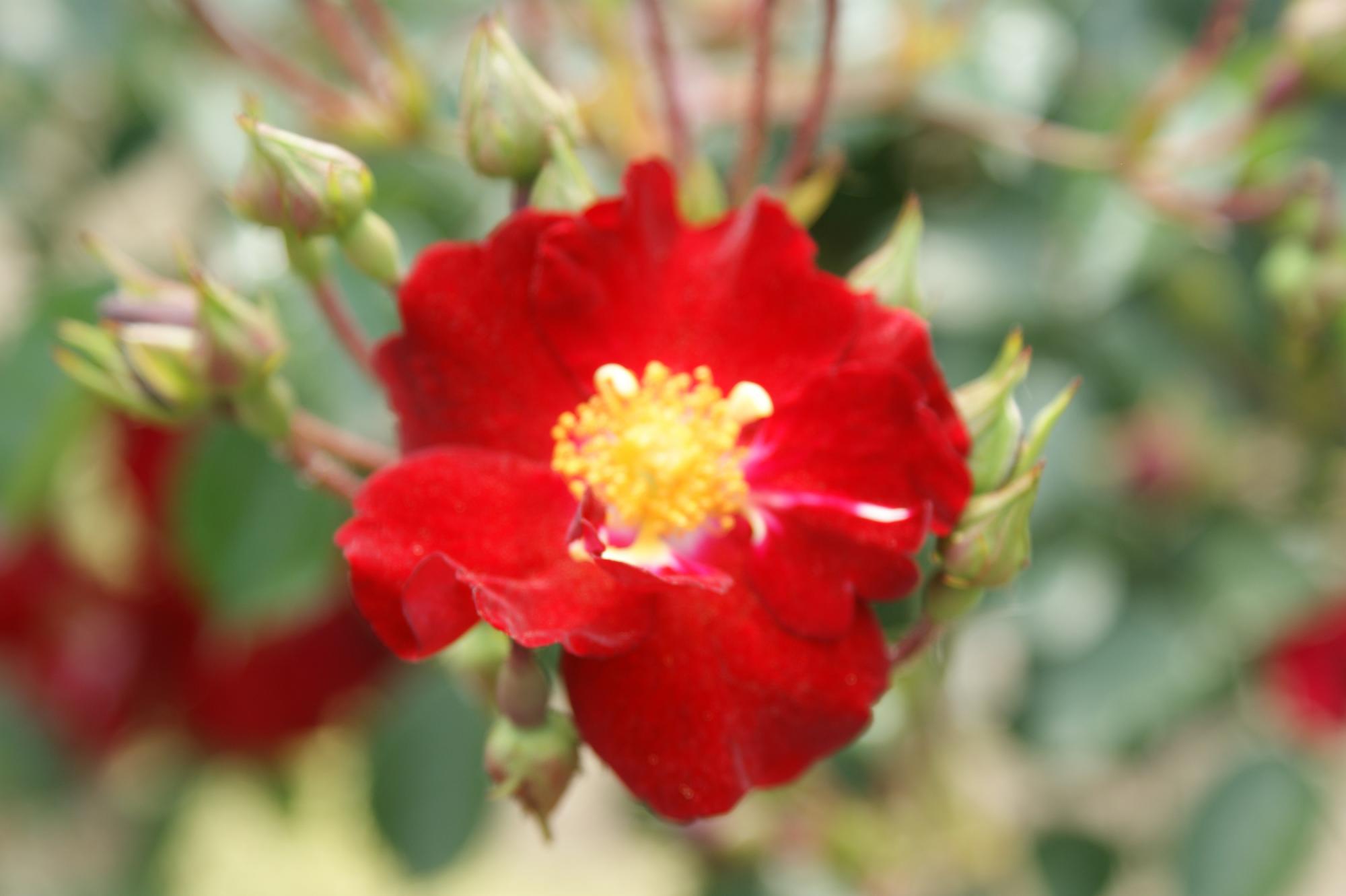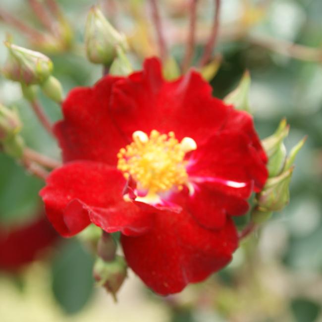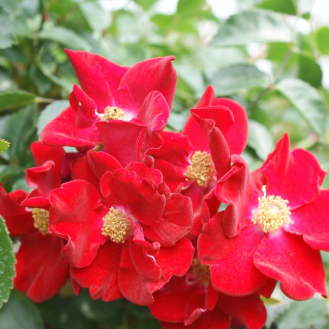 Een enkelvoudige donkerrode bloem met opvallende gele meeldraden. Alcantara is een zeer gezonde roos met donkergroene glanzende bladeren. Deze makkelijke bloeier behoud tijdens zijn bloei zijn donkerrode kleur.