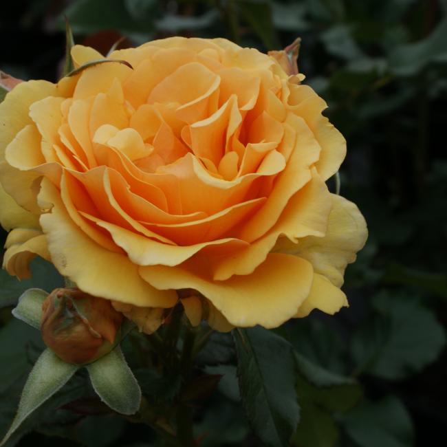Diepe ambergele gekleurde roos met goedgevulde bloemen die helder geel verkleuren tijdens de bloei waardoor een illuminatie effect ontstaat. Opvallend gezond ogend loof welke tijdens de groei van bronsgroen verkleurd naar een glanzende donkergroene kleur. Een heesterroos welke breed uitgroeit.