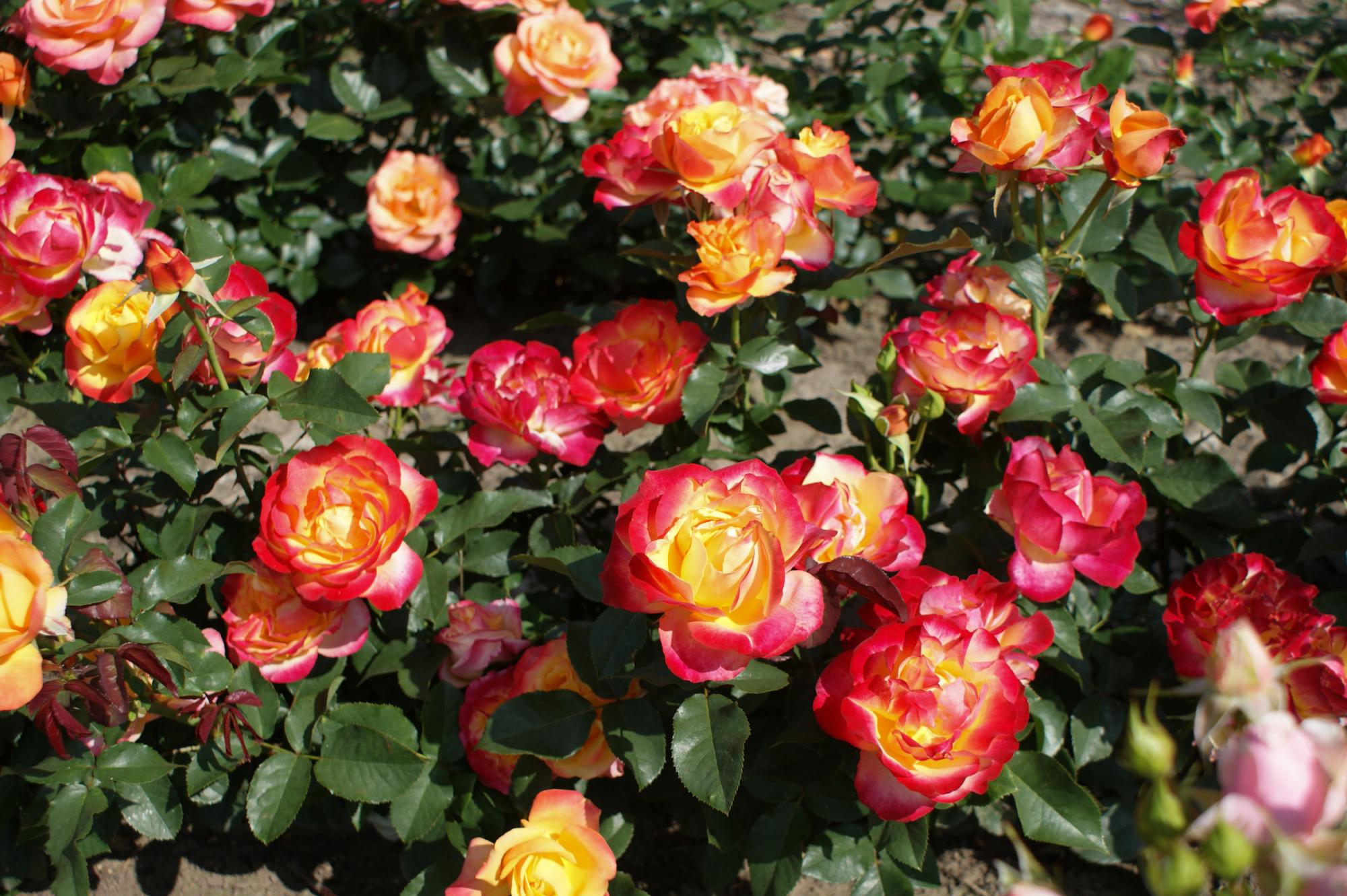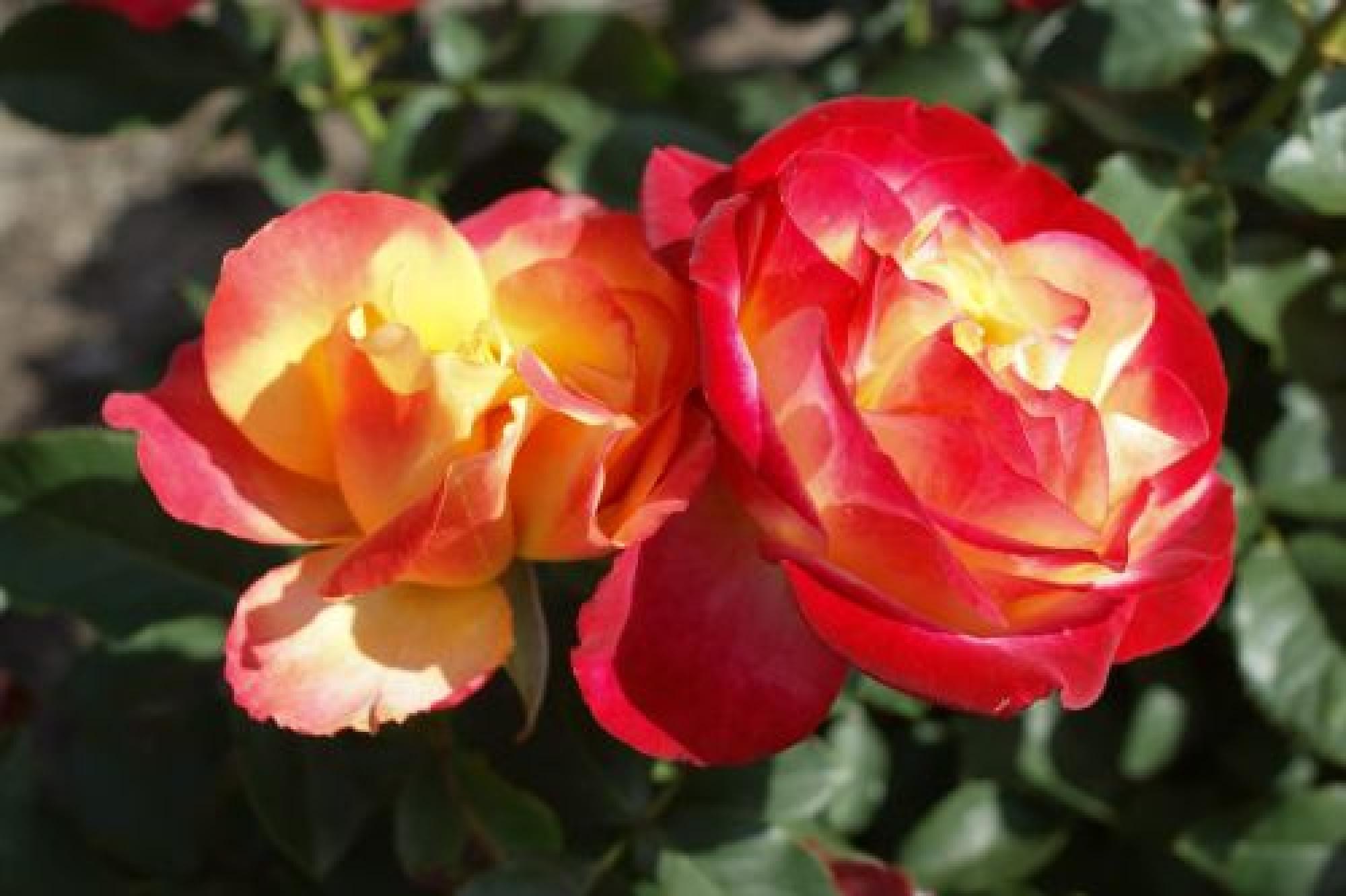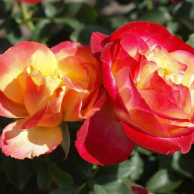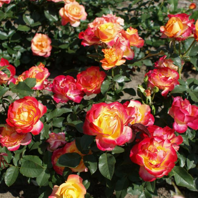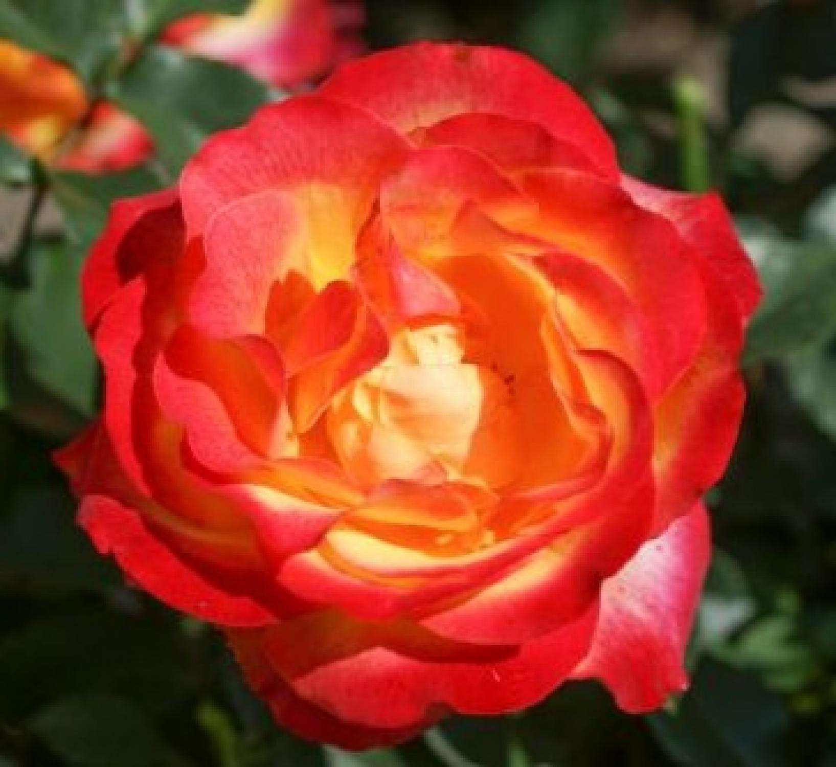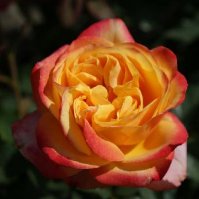 Deze roos is meerkleurig, goud/geel in het hart en de randen zijn oranje/rood. Prachtig dik gevuld. Mooi glanzend donkergroen blad.