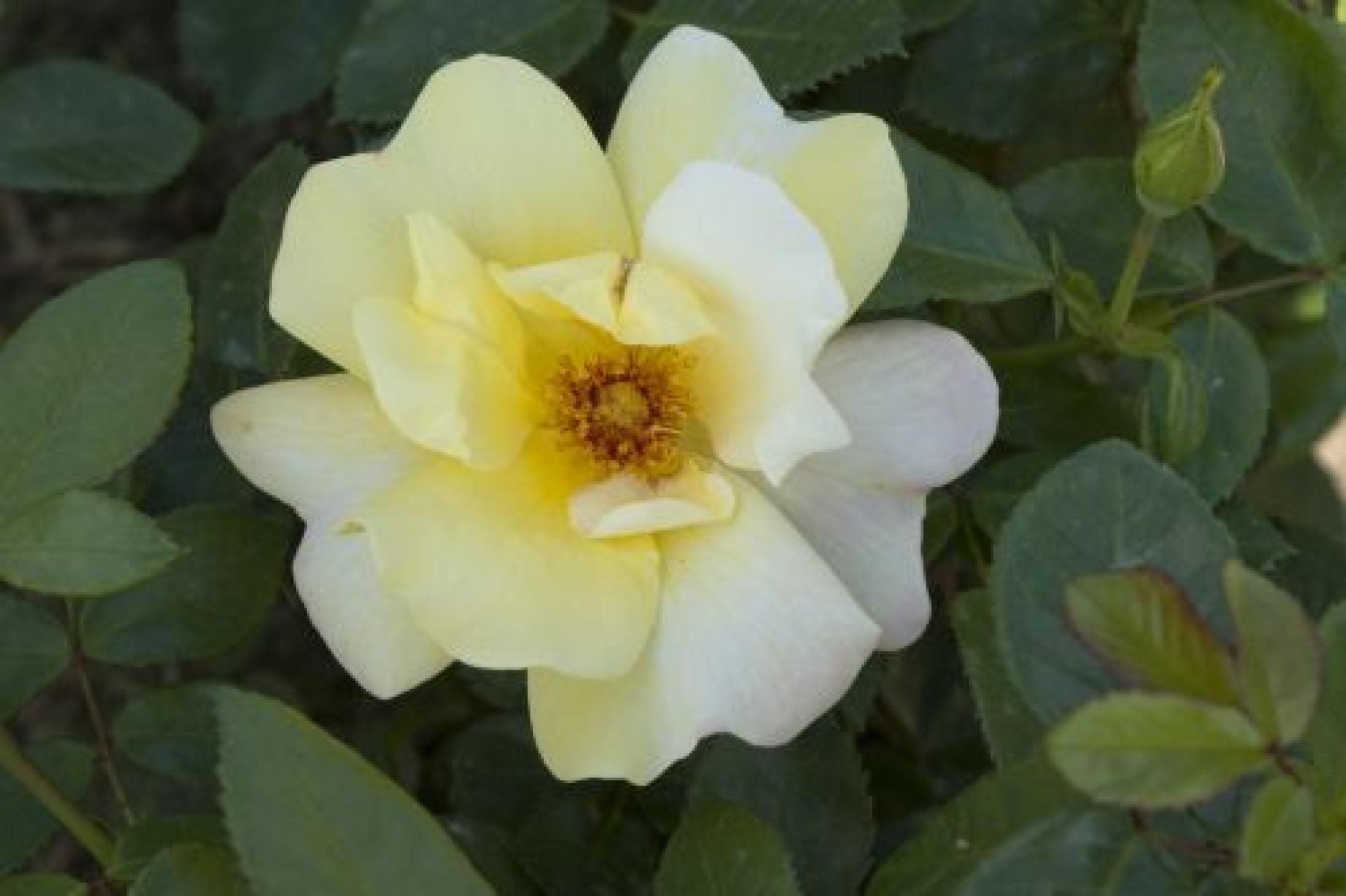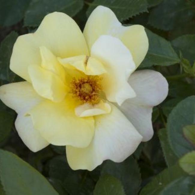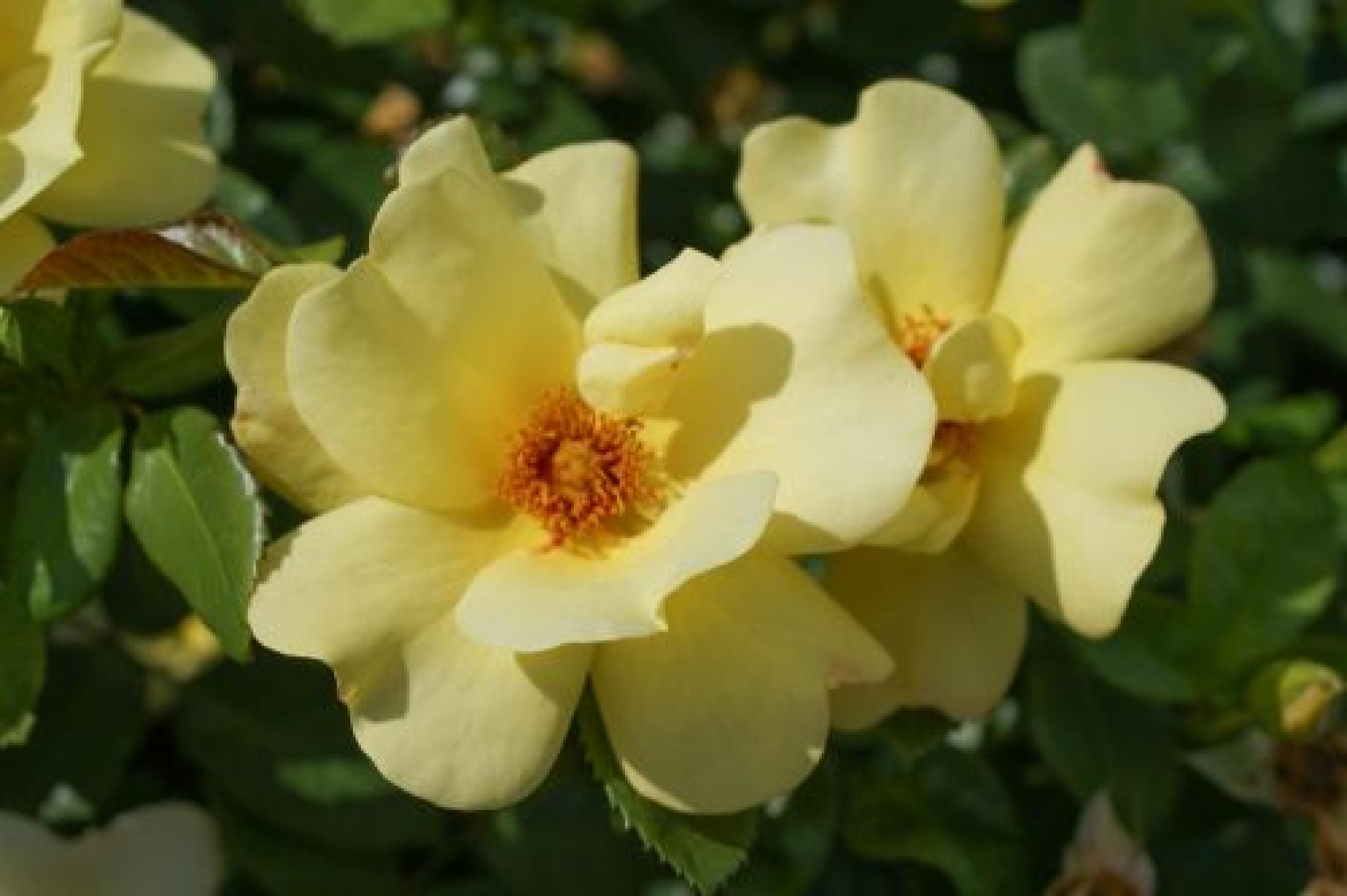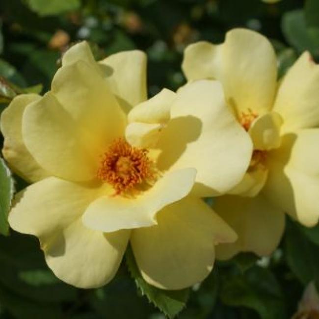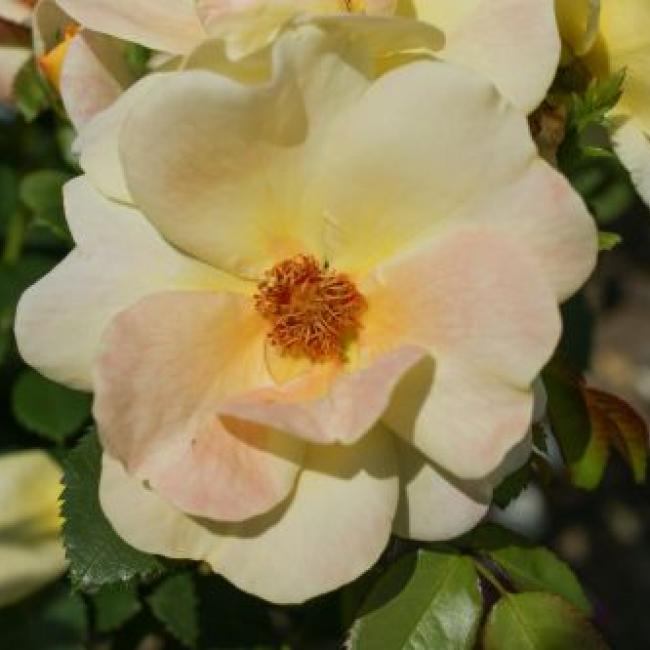 Laagblijvende heesterroos met opvallend grote enkelvoudige bloemen. De meeldraden zijn duidelijk zichtbaar. Deze roos bloeit met trossen in een kleur van gele tot licht gele bloemen. Het bijzondere is dat de bloem naar verloop iets een roze gloed krijgt, prachtig! Groeit compact het heeft een mooi gezond donkergroen glanzend blad.