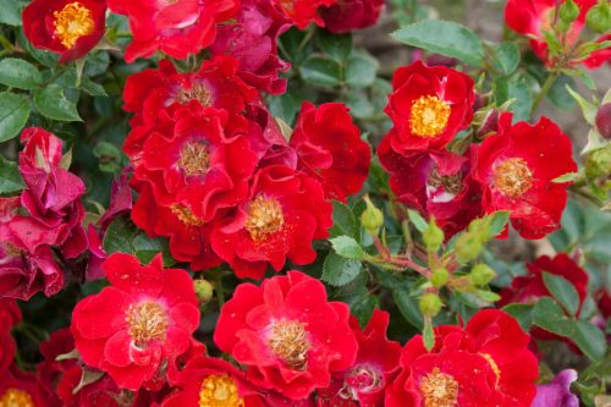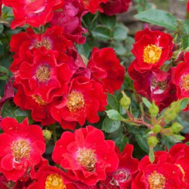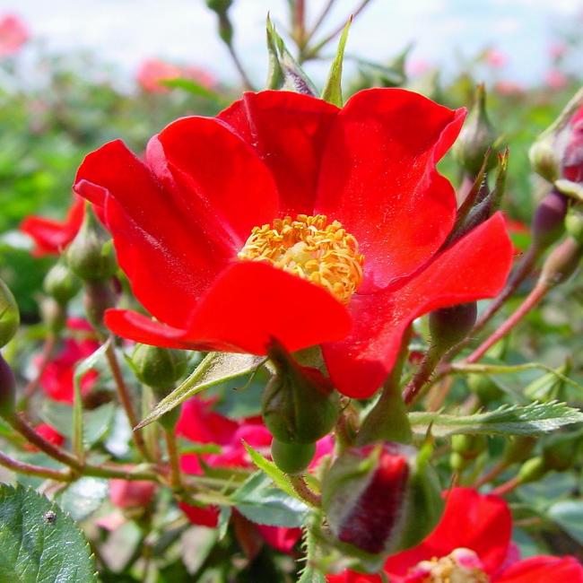 Een laagblijvende breedgroeiende bodembedekker met enkelvoudige lichtgevende bloedrode roosjes, De meeldraden zijn goed zichbaar. Het is een rijke bloeier met mooi donkergroen blad. Zeer gezond en dankbaar. Een aanrader!