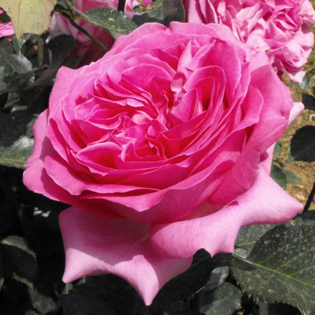 Zeer sterk geurende roos met fuchsia-roze betoverende bloemen. Mooi dik gevuld en ziet er een beetje old fashion uit met zijn grote donkergroene glanzende bladeren. Het is een gezonde roos die goed solitair aangeplant kan worden maar ook mooi tot zijn recht komt in een perk. Is prima geschikt als snij roos.