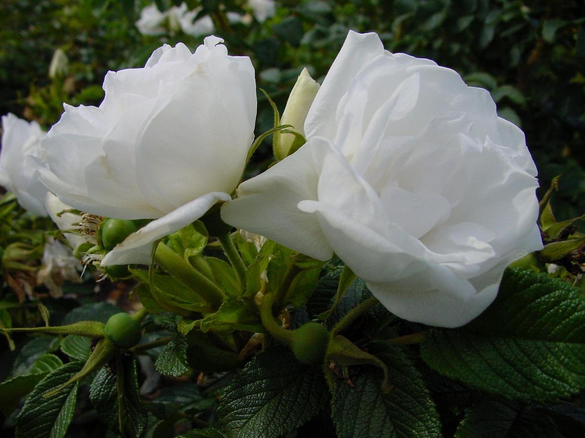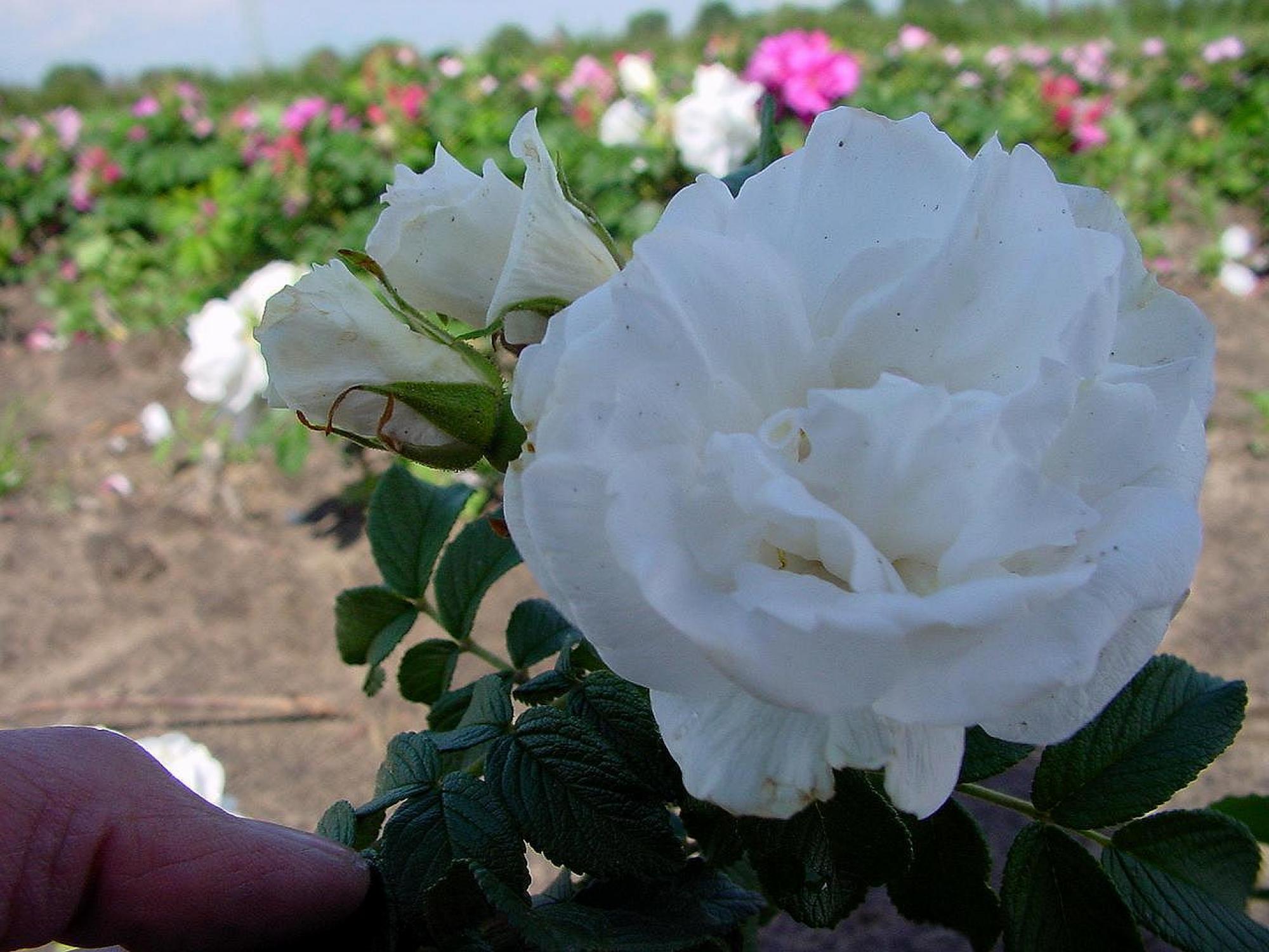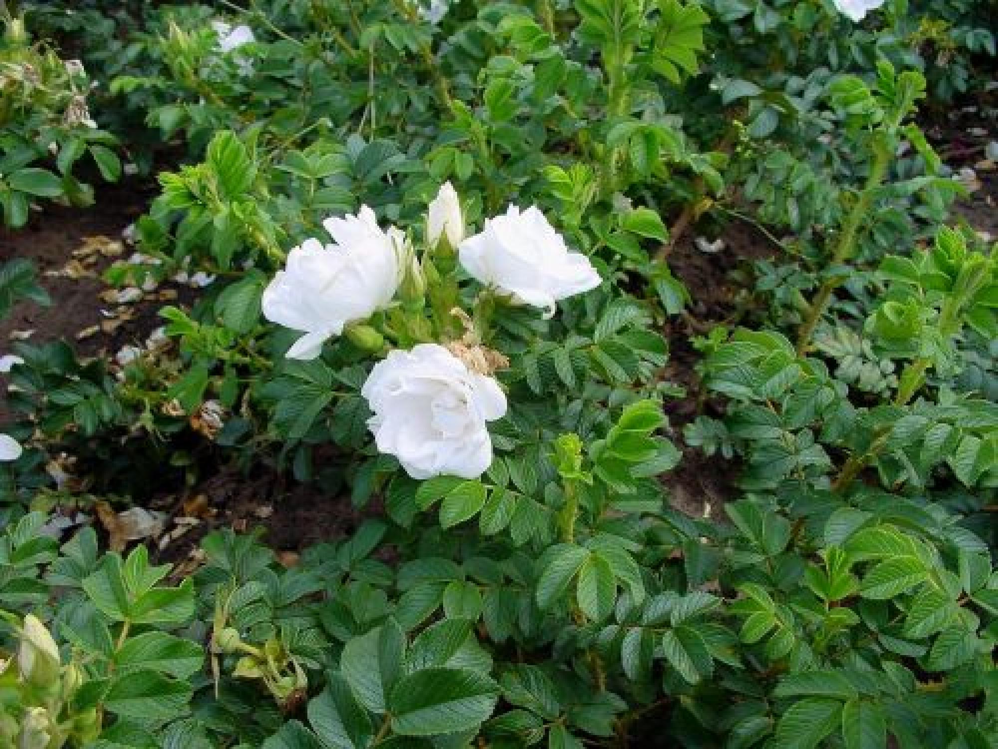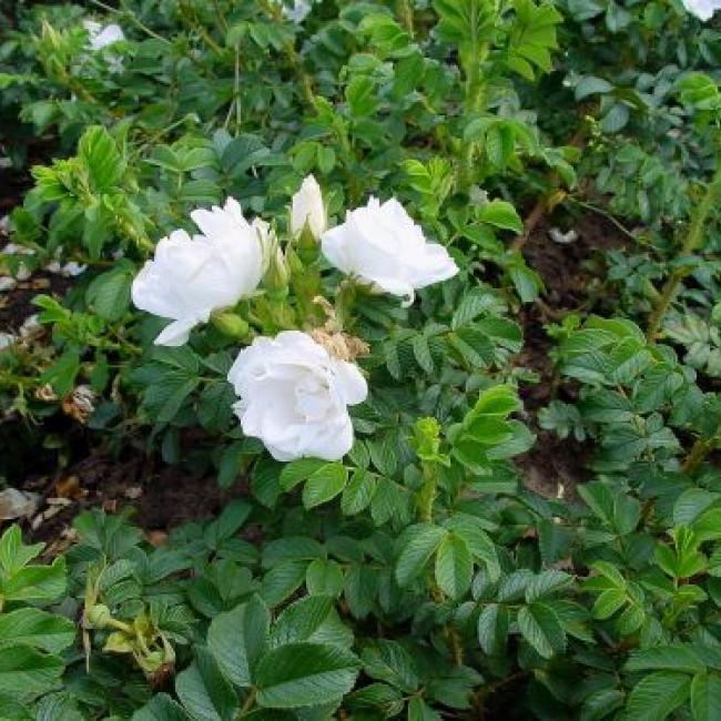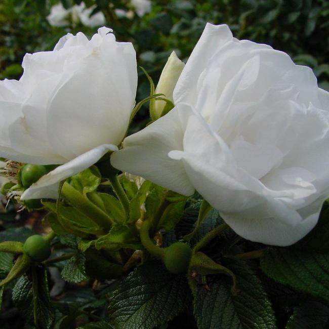 Deze roos valt onder de ´Rugosa“ soorten. De duinrozen. Dat kenmerkt zich meteen met sterk geurend, semi enkelvoudige bloemen, stekelig hout en generfde bladeren. Met als kers op de taart: prachtige dikke bottels in de herfst. Deze roos heeft opvallend grote bloemen die mooi wit van kleur zijn en donkergroen blad heeft. In de herfst krijgt deze roos opvallend mooi oranje-geel herfst blad en valt dan af.