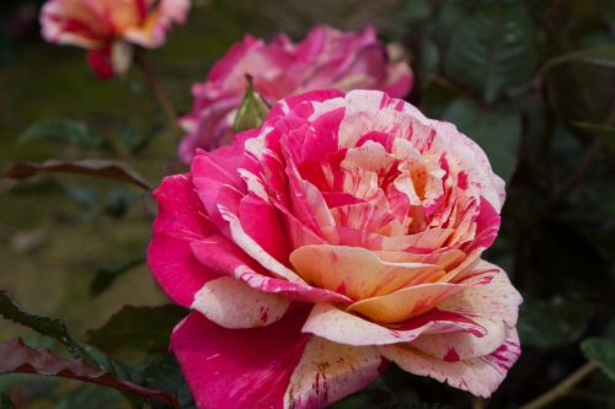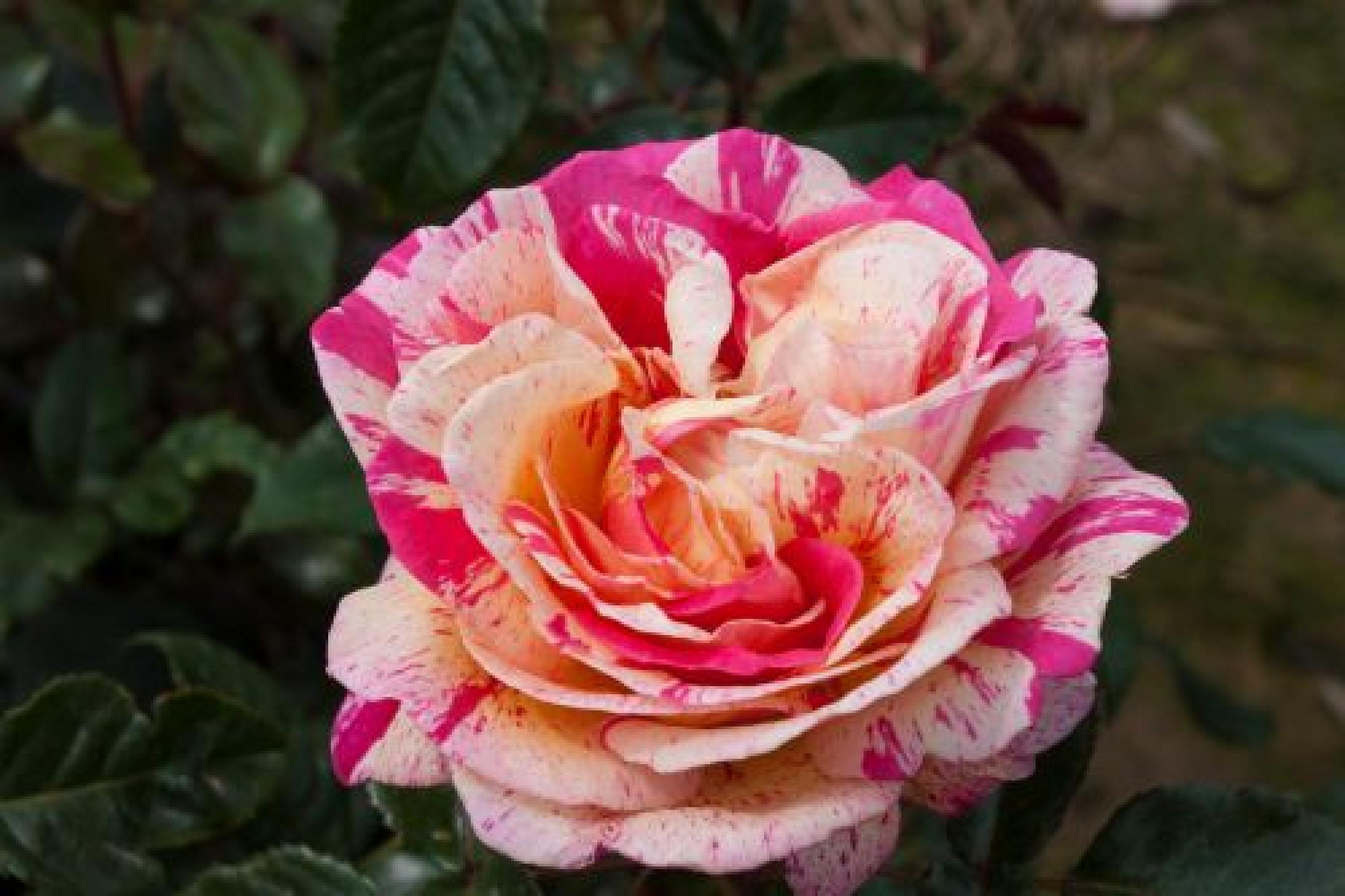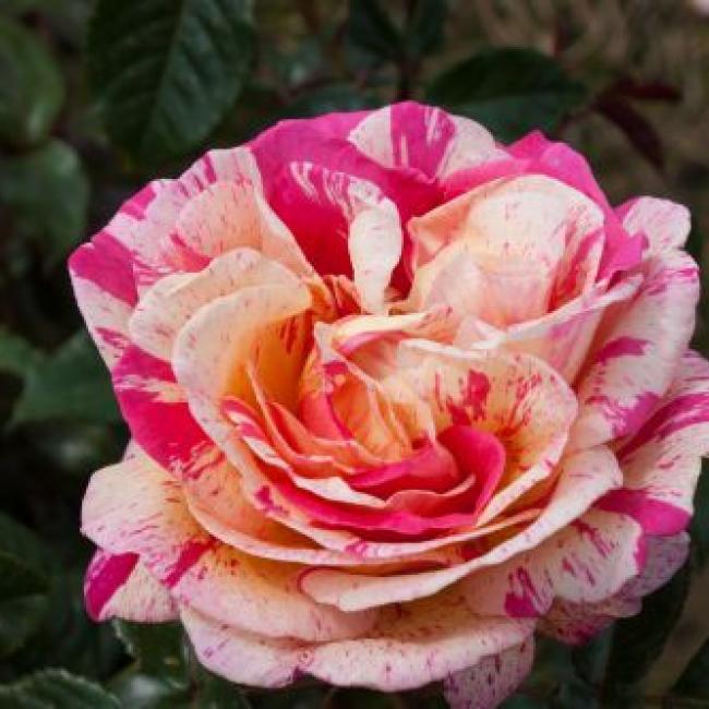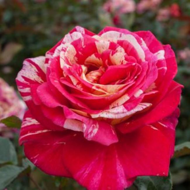 Deze robuuste roos heeft niet alleen een zeer bijzondere bloemkleur maar ook de sterke rozengeur maakt hem tot een goede keus in elke beplanting. Erg grote rood met witte strepen en een volle bloem. De donkergroene bladeren zijn groot, glanzend en leerachtig. Dit uit Frankrijk afkomstig soort is door zijn weliger groei geschikt om wat verder weg in de border te planten. Het is ook een zeer bijzondere roos voor in de vaas.