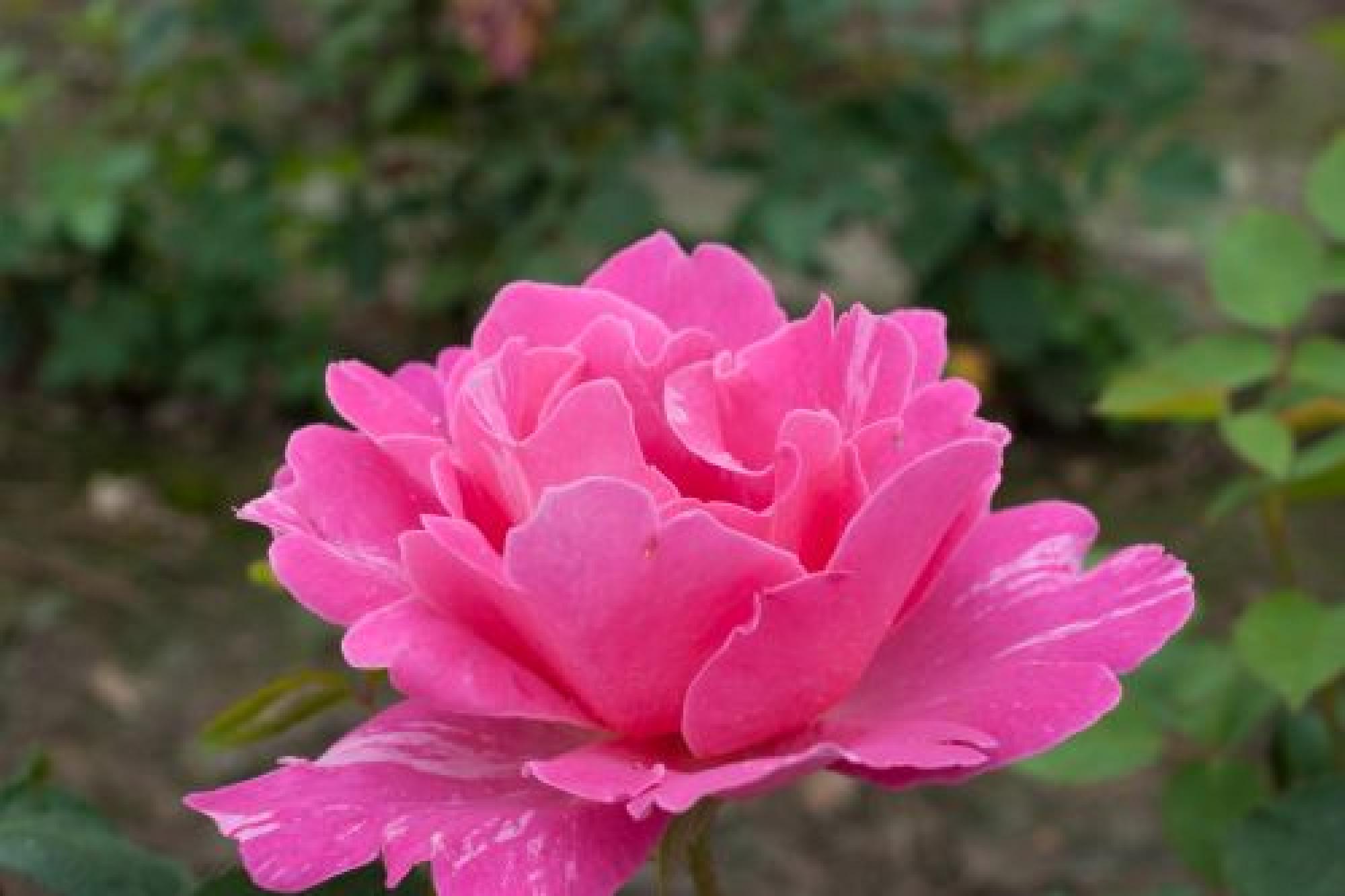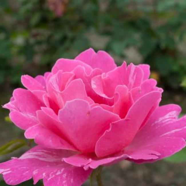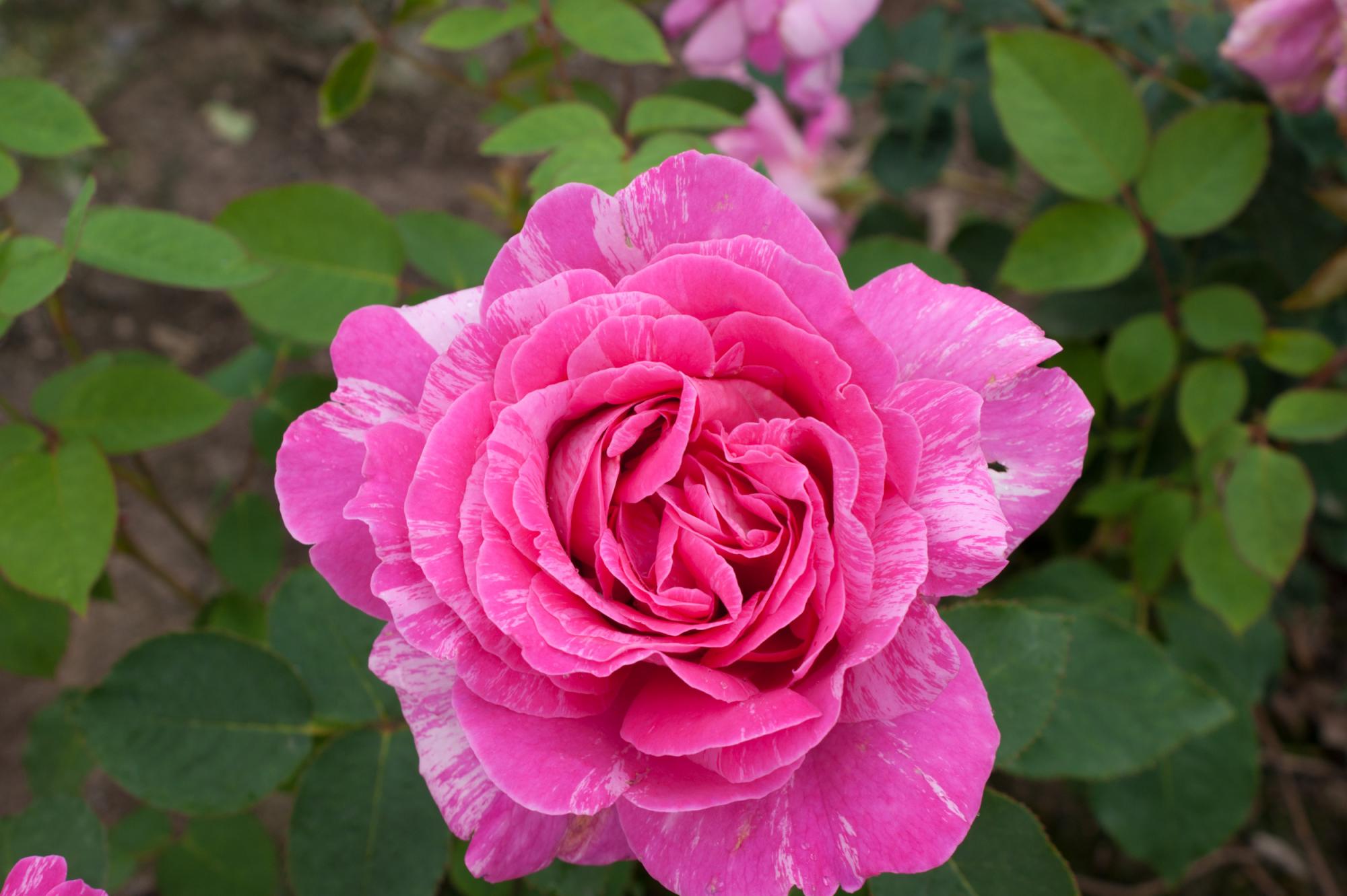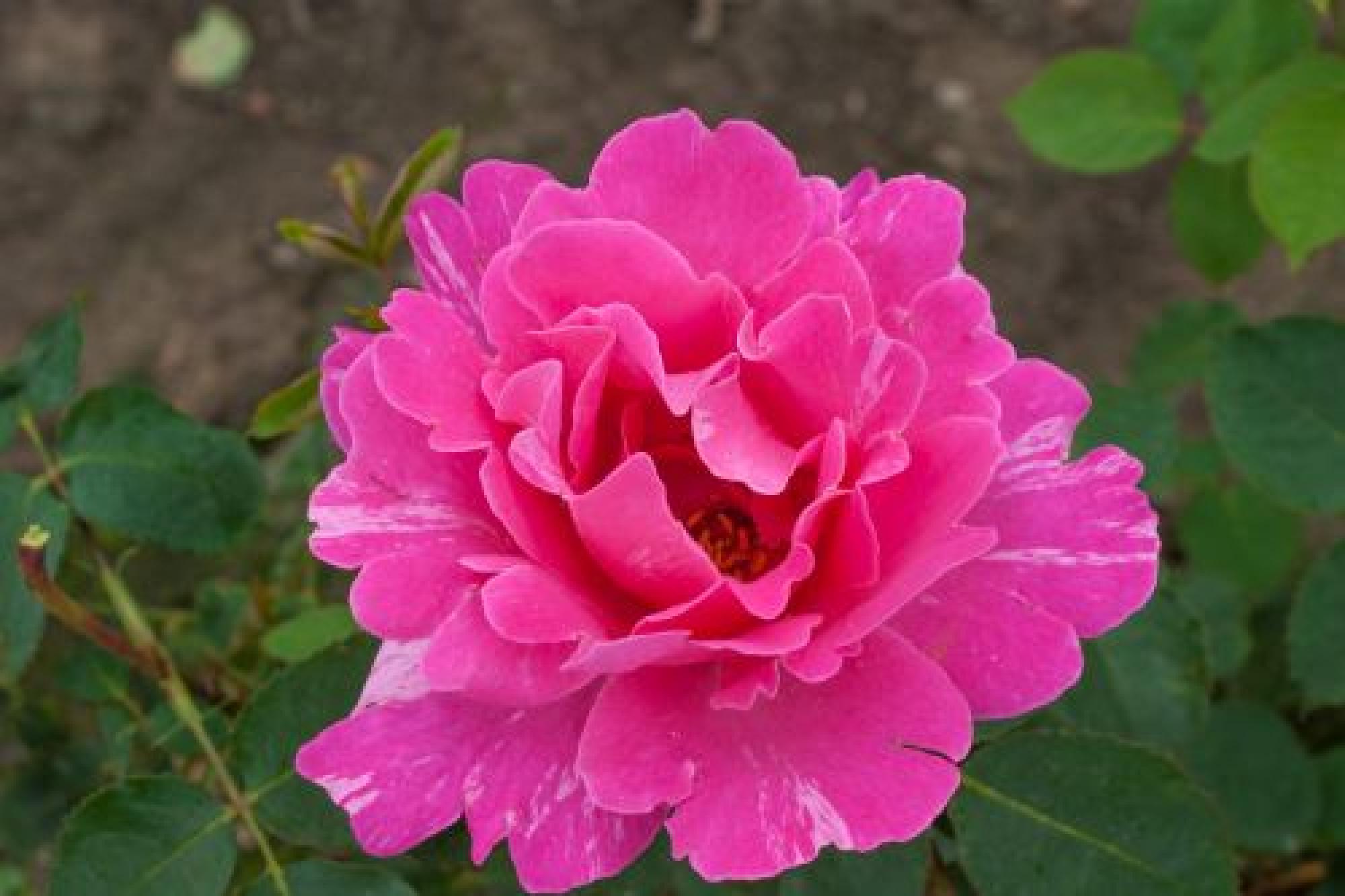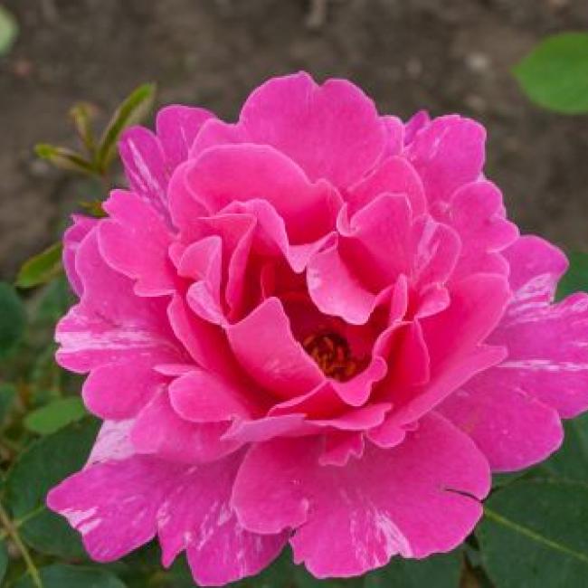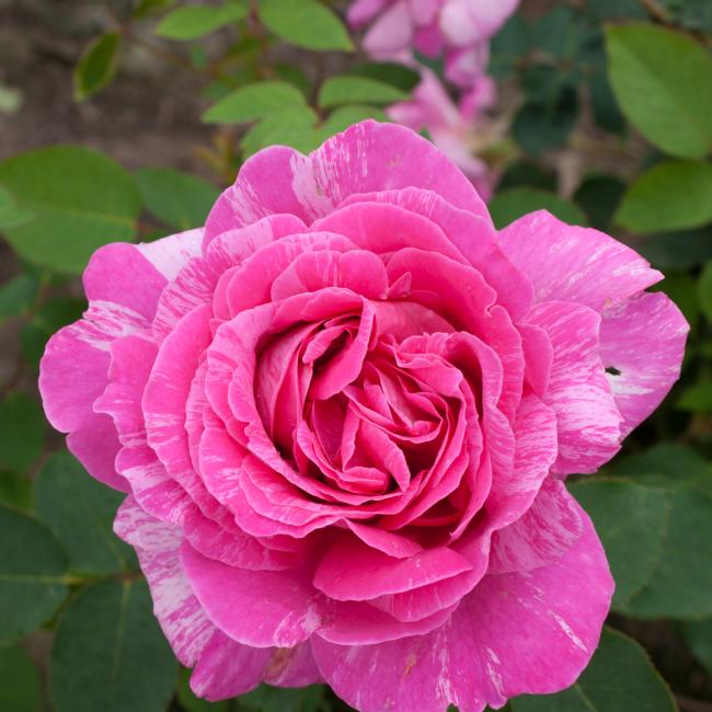 Roze met wit gestreepte grootbloemige roos. Het is een opvallende verschijning die ook nog eens een heerlijke geur heeft.