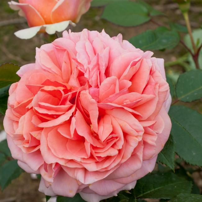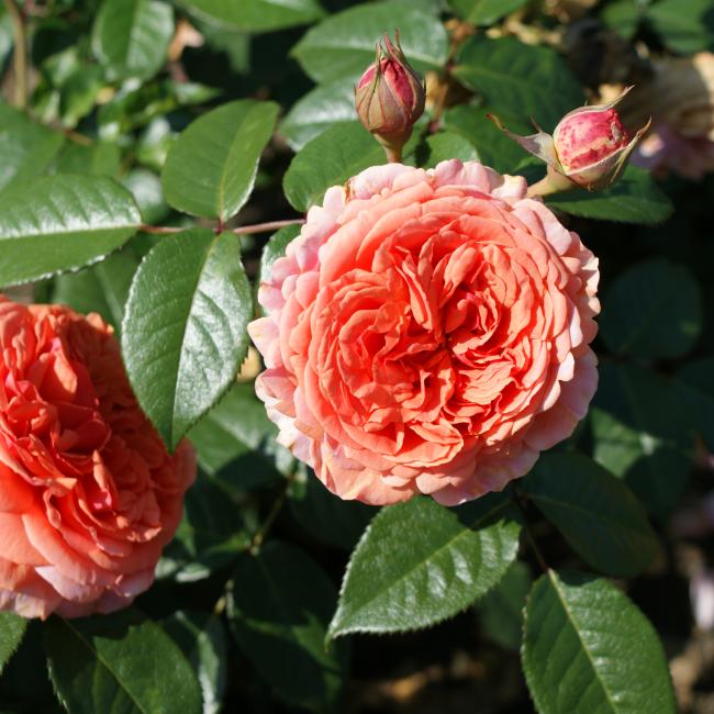 Robuust groeiende roos met een glanzend donker blad en met prachtige oranje/roze, geurende schaalvormige bloemen. Een plaatje! Ziet er een beetje Engels uit, maar is een gezonde en dankbare bloeier.