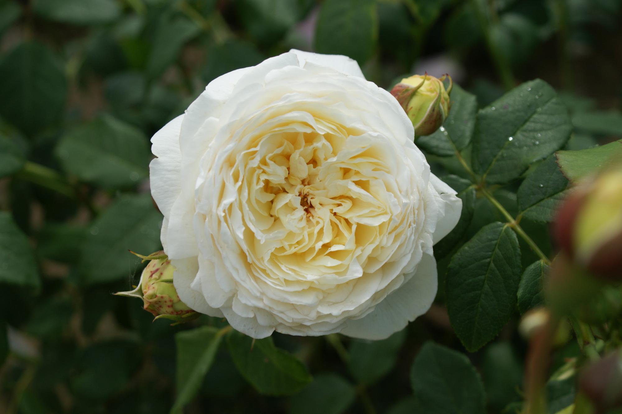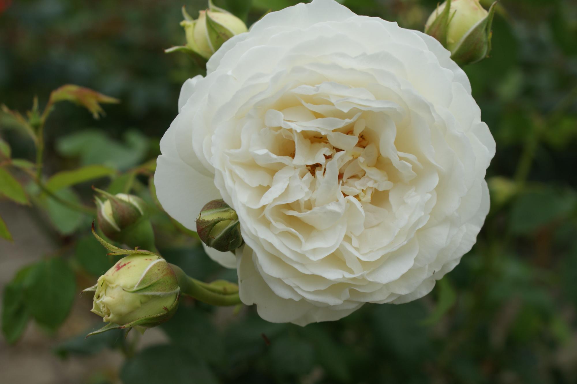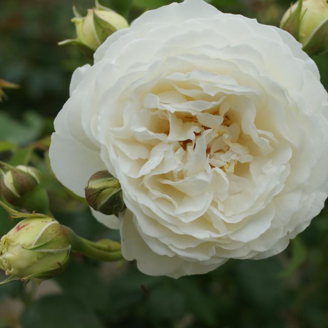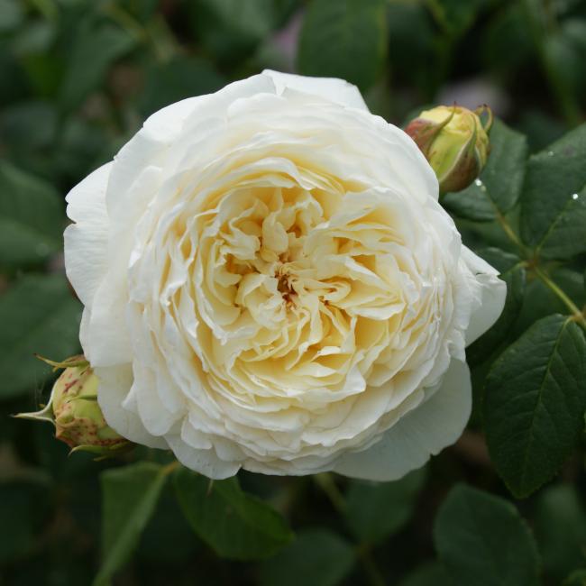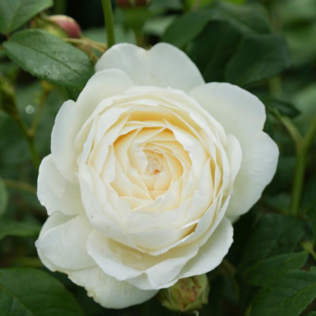 Witte tot crème witte komvormige dik gevulde roosjes. De dikke rozetten zijn opvallend net als de sterke vanille geur.