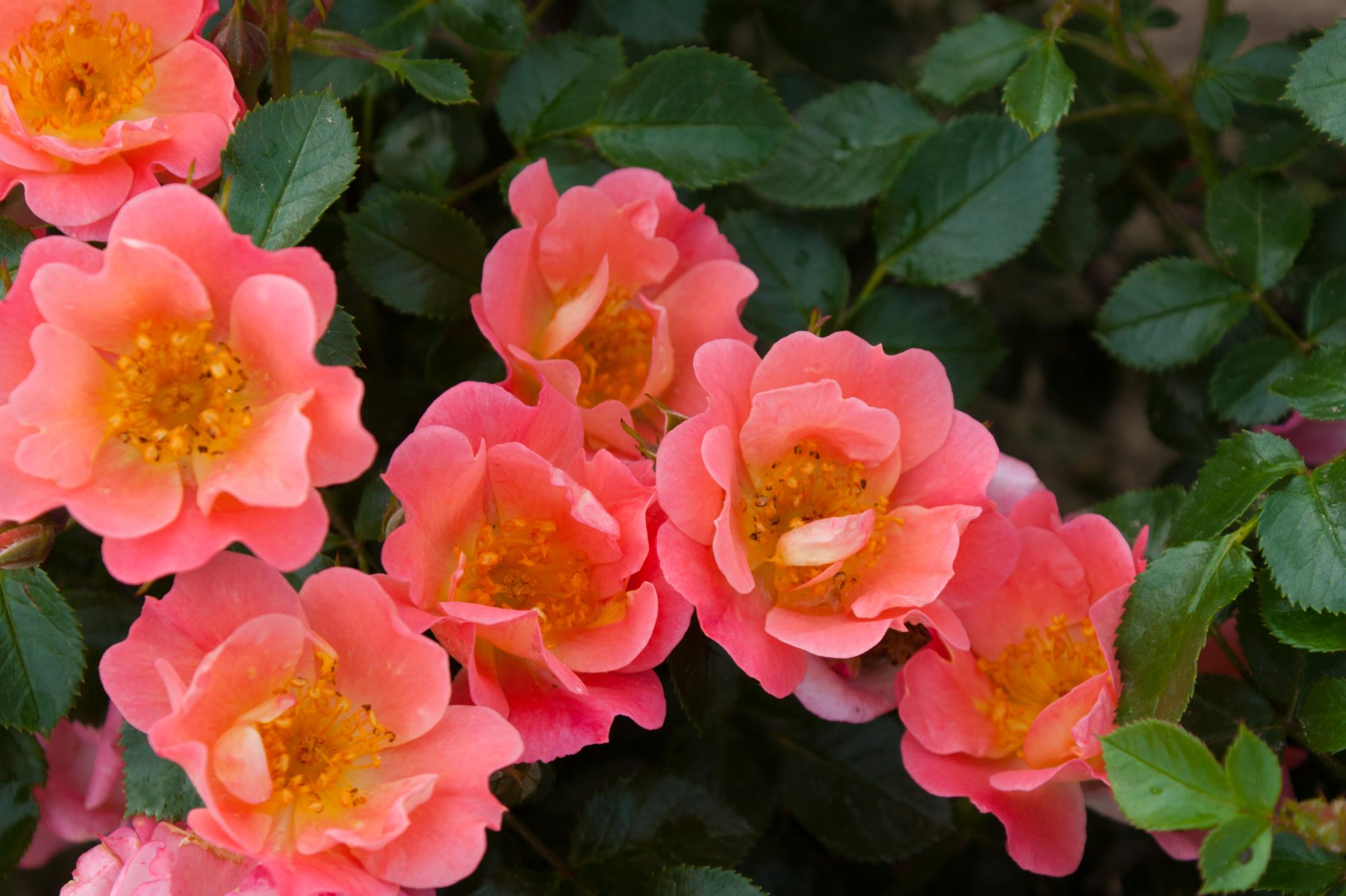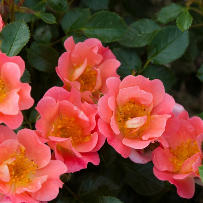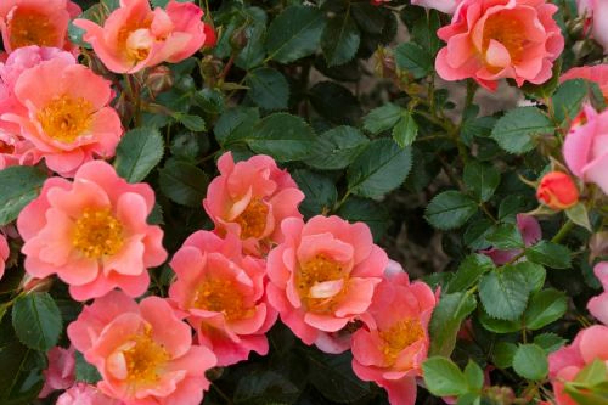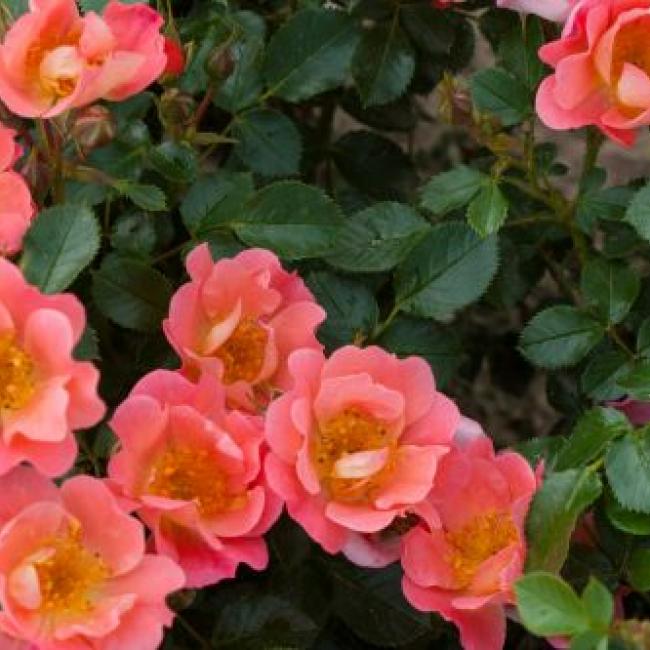 Zeer dankbaar roosje met enkelvoudige bloemen. De bloemen zijn zalmoranje/roze van kleur en de gele meeldraden zijn goed zichtbaar. Dit lieflijke roosje blijft de hele zomer uitbundig bloeien, en zoals op de foto zichtbaar is, zie je dat de bloemen na verloop zachter van kleur worden. Deze roos is ook erg gezond, de bladeren zijn donkergroen en glanzend. Een absolute topper!
