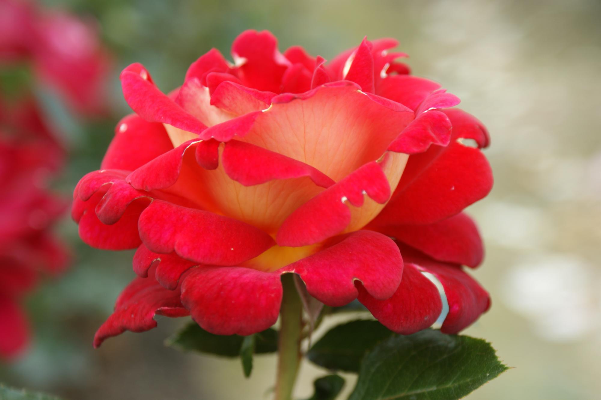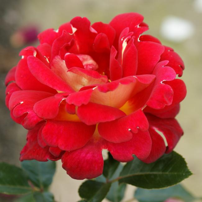 Dik gevulde intens rode bloemenblaadjes die aan de achterkant geel zijn. De bloemblaadjes zijn ook nog iets gekarteld. Zeer bijzonder! Deze roos maakt opvallend lange bloemstelen met zeer glanzend donkergroen en gezond blad. Hiermee ook erg geschikt als snijroos.