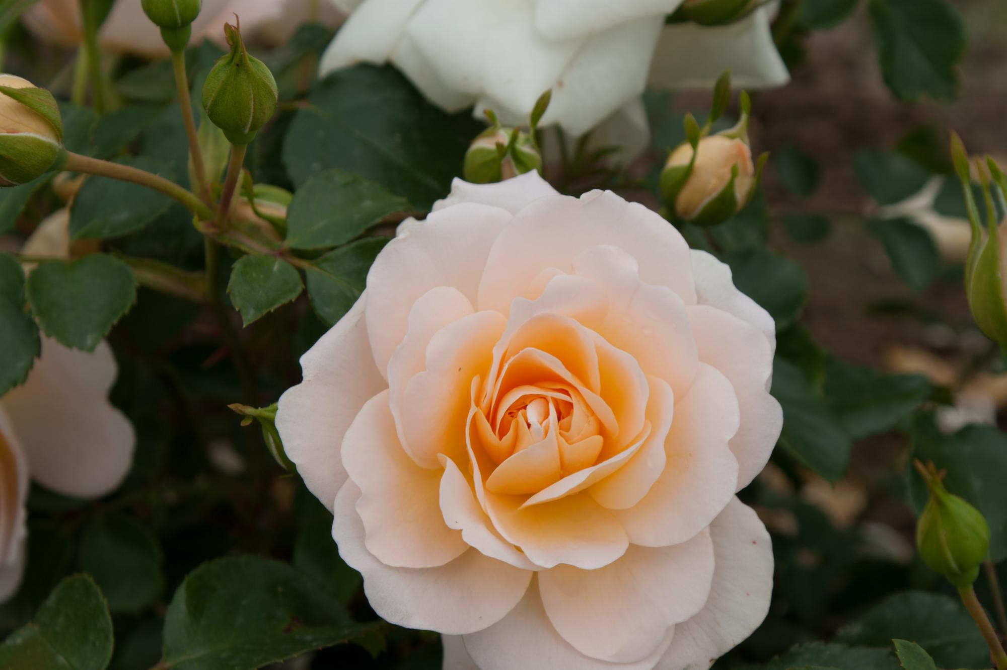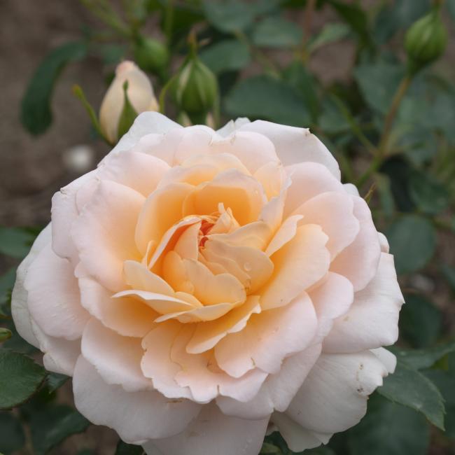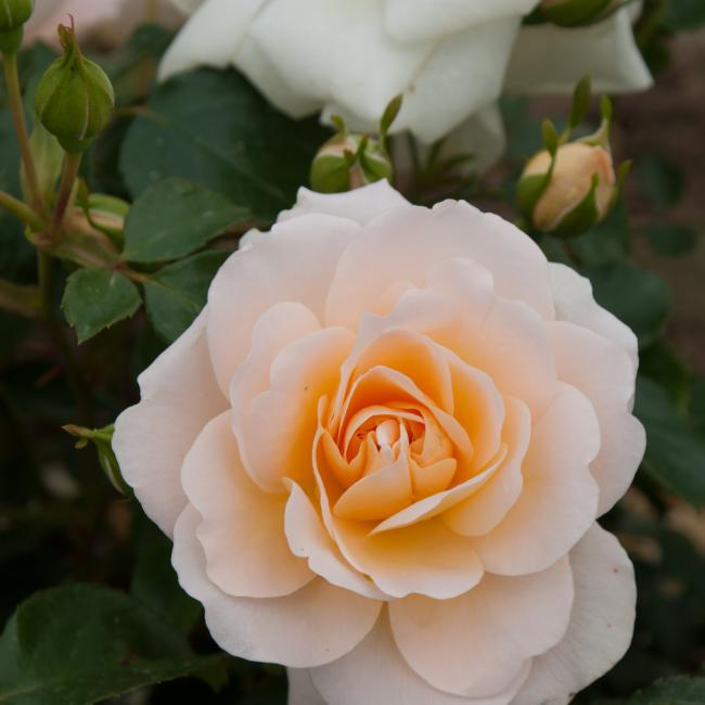 Ronde goed gevulde middelgrote, Abrikoos kleurige, schattige bloemen. Bossig compacte groei. Glanzend middelgroen blad. Ziet er een beetje old fashion uit. Is gezond en iets geurend.