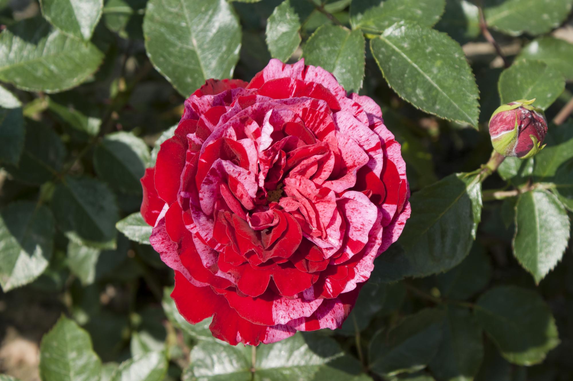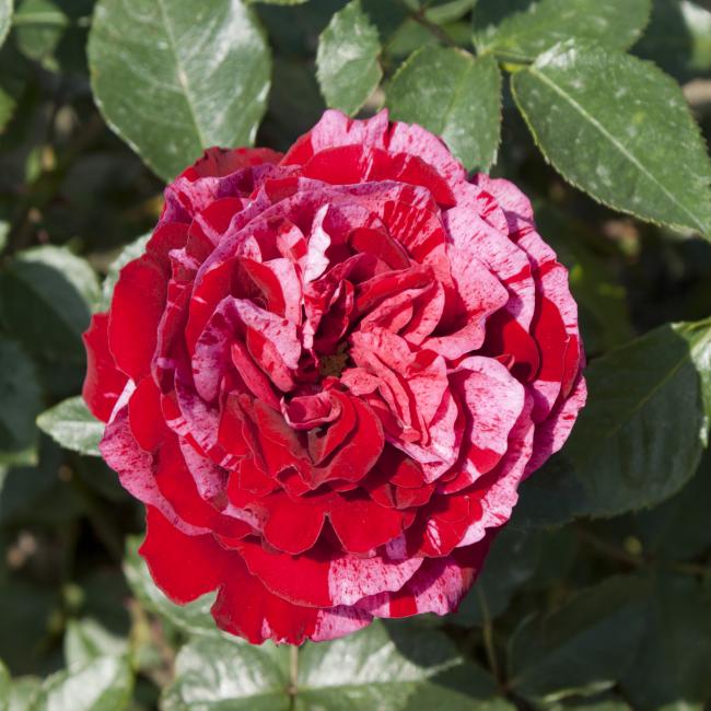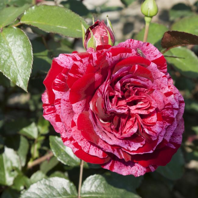 Donkerrode, gevulde bloemen met roze strepen en iets wit/roze vlekken. Zeer bijzondere en dankbare roos. Bloeit in trosjes en heeft een korte bossige groei. Heeft glanzend donkergroen blad.