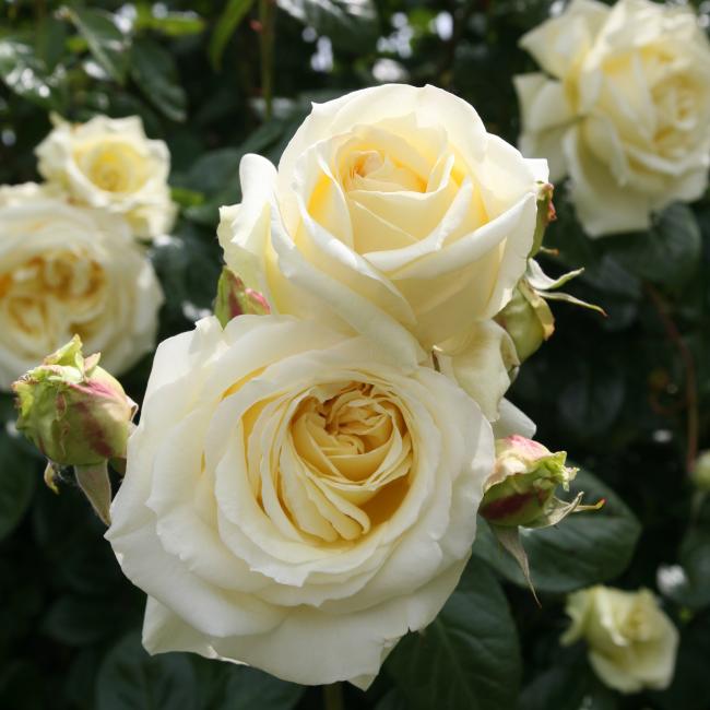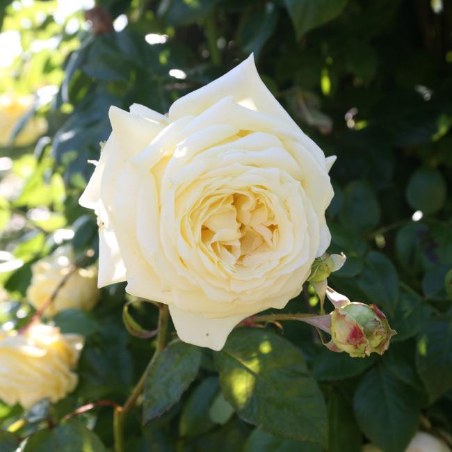 Een groen getinte ivoorkleurige klimroos met grote dichtgevulde bloemen. De bloemen bloeien de gehele zomer en zijn iets geurend. De plant heeft mooie glanzende donkergroene bladeren en heeft een sterke groeiwijze.