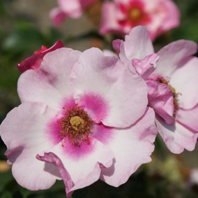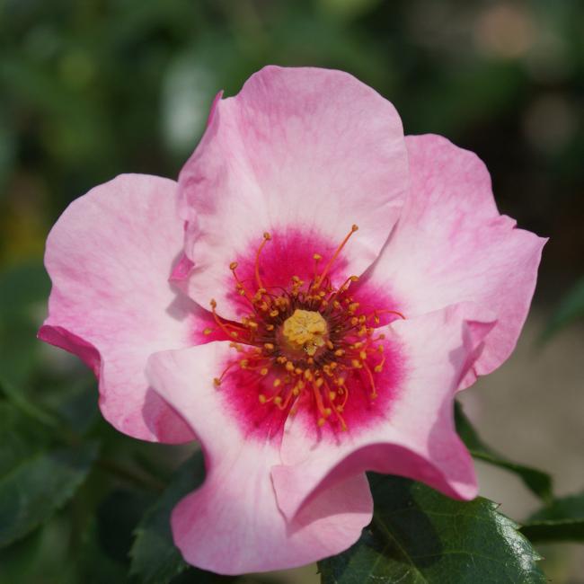 Deze roos is eigenlijk licht roze kleurig maar heeft een roze, rood hart. De gele meeldraden zijn zichtbaar. Een echte nieuwigheid. Deze roos groeit bossig, is compact en heeft leerachtig gezond blad.