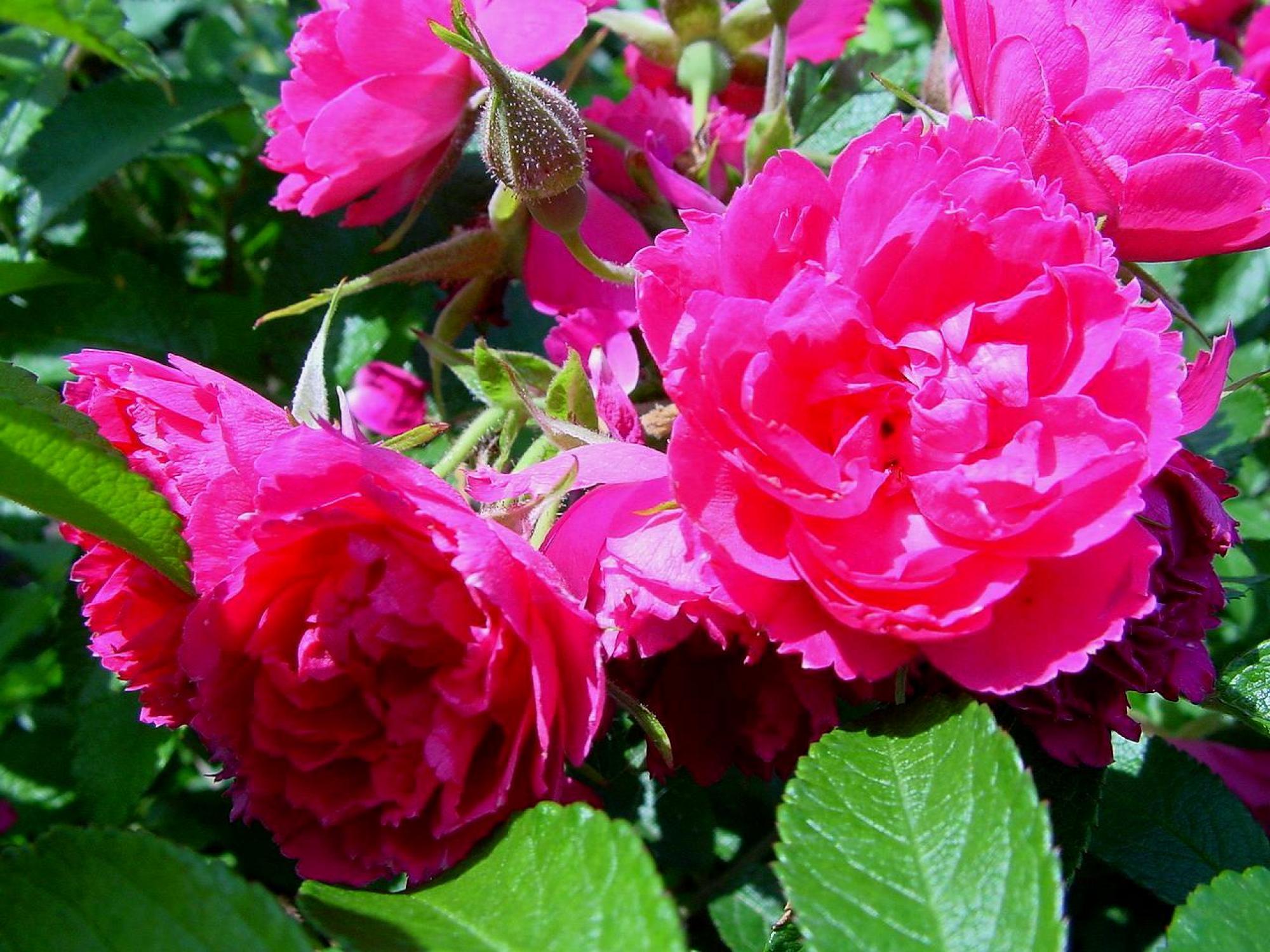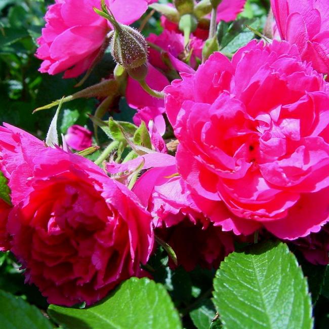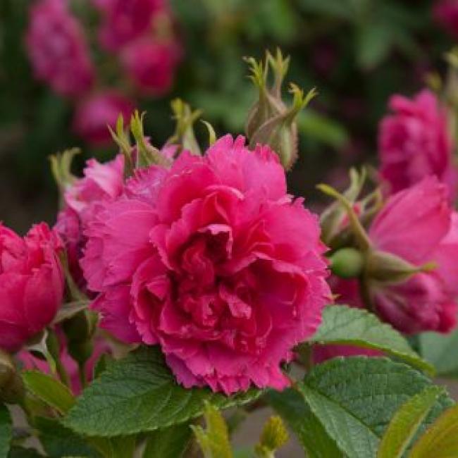 Kleine gevulde roos, met gezaagde bloemblaadjes. Donkergroen leerachtig blad en veel stekels op de stelen. Hij kan in de schaduw. Heeft een rijke bloei in de zomer.