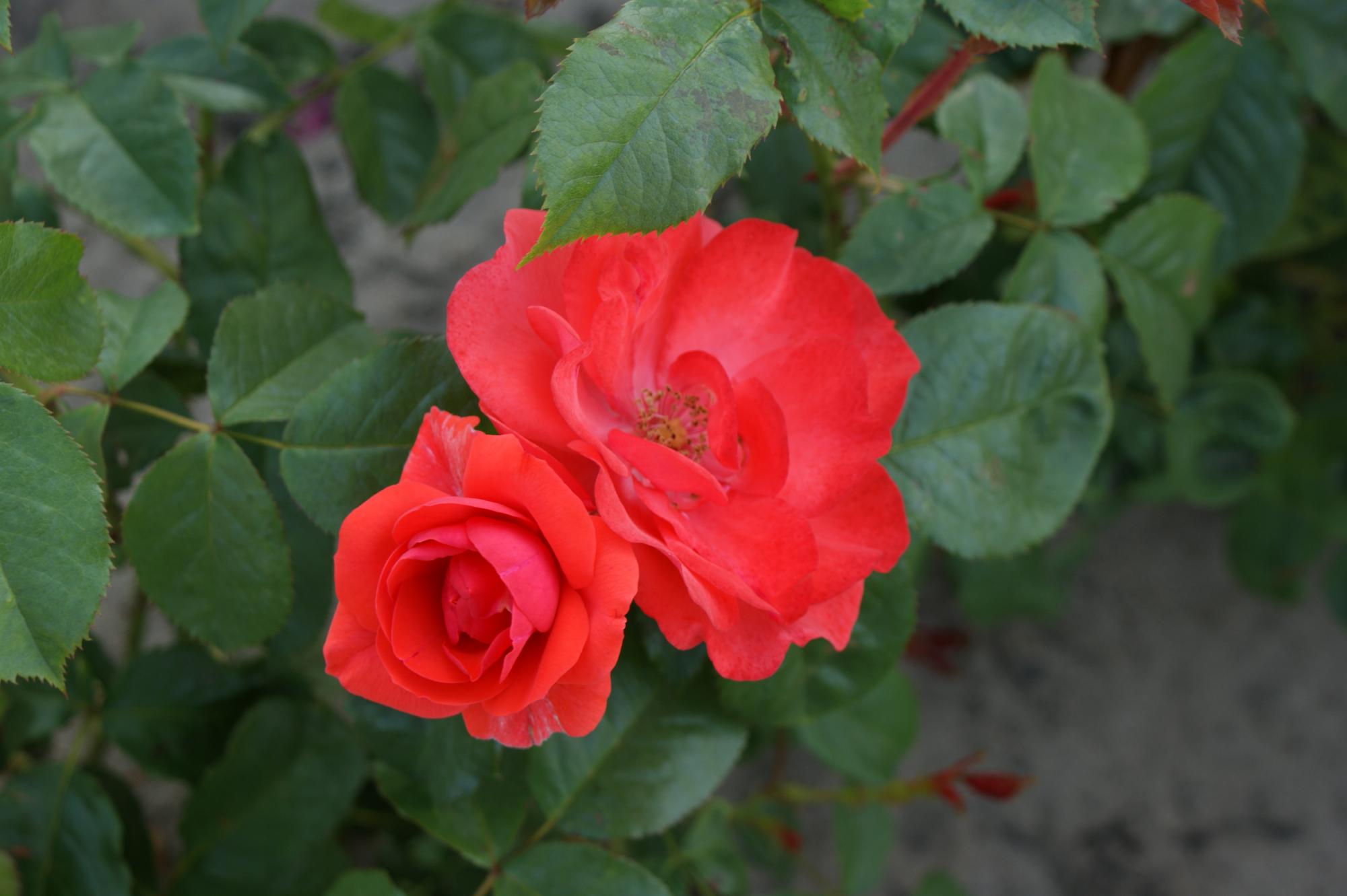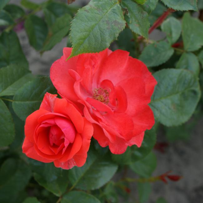 Halfgevulde knal oranje bloemen. Bloeien in trosjes aan een bossige roos. Heeft mooi glanzend blad en is goed geschikt als sollitair, maar ook als haagje of perkroos.