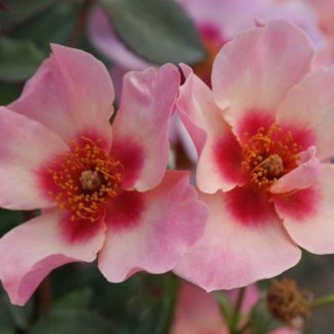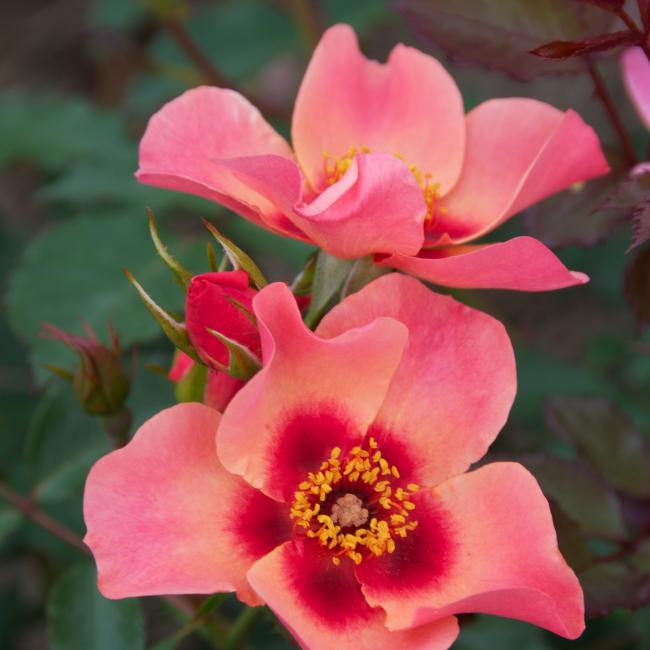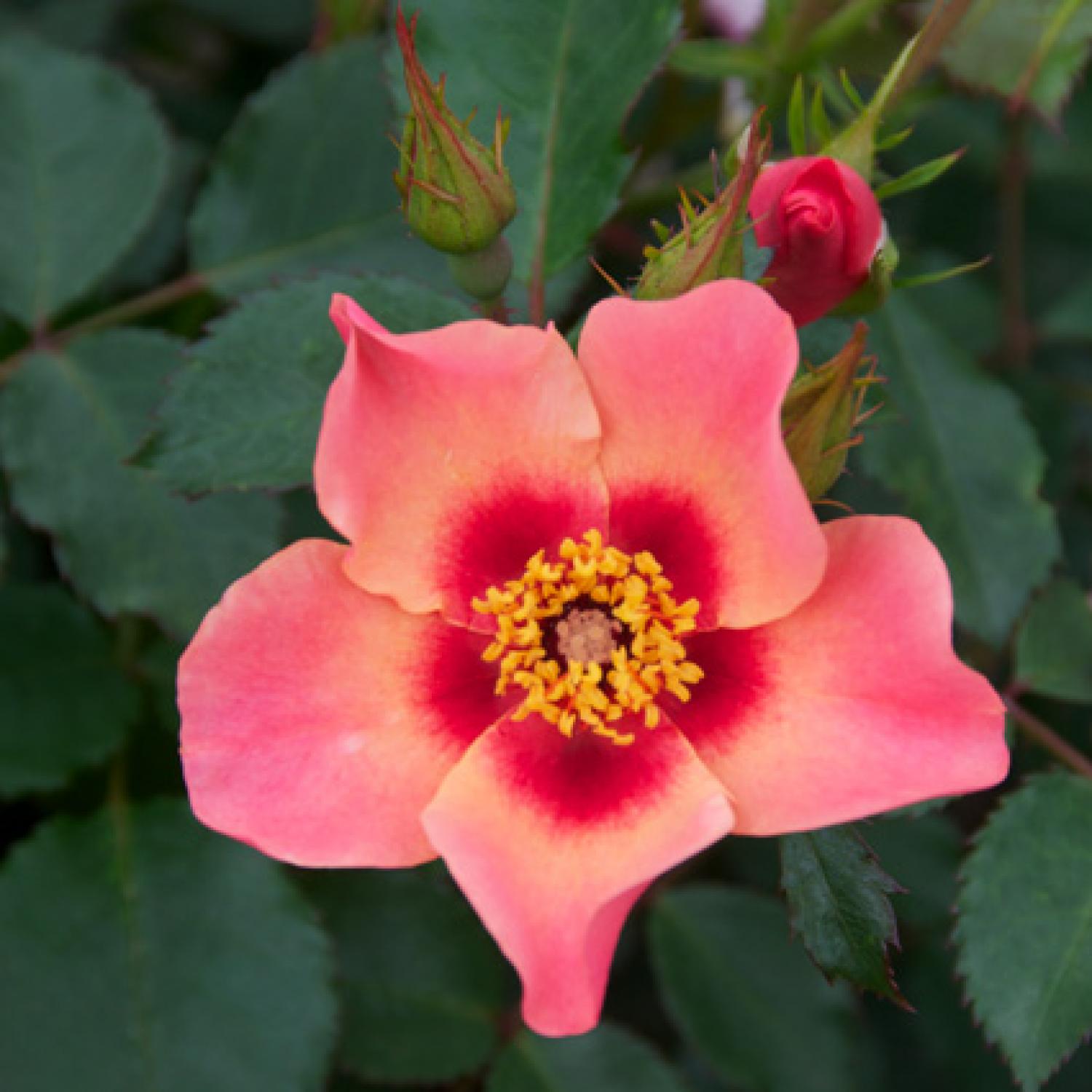 Zalm roze bloemen die overlopen naar abrikoos. Ze hebben een donkerrood hart dat verloopt naar lavendel. De gele meeldraden zijn zichtbaar. Een echte nieuwigheid. Deze roos groeit bossig, is compact en heeft leerachtig gezond blad.