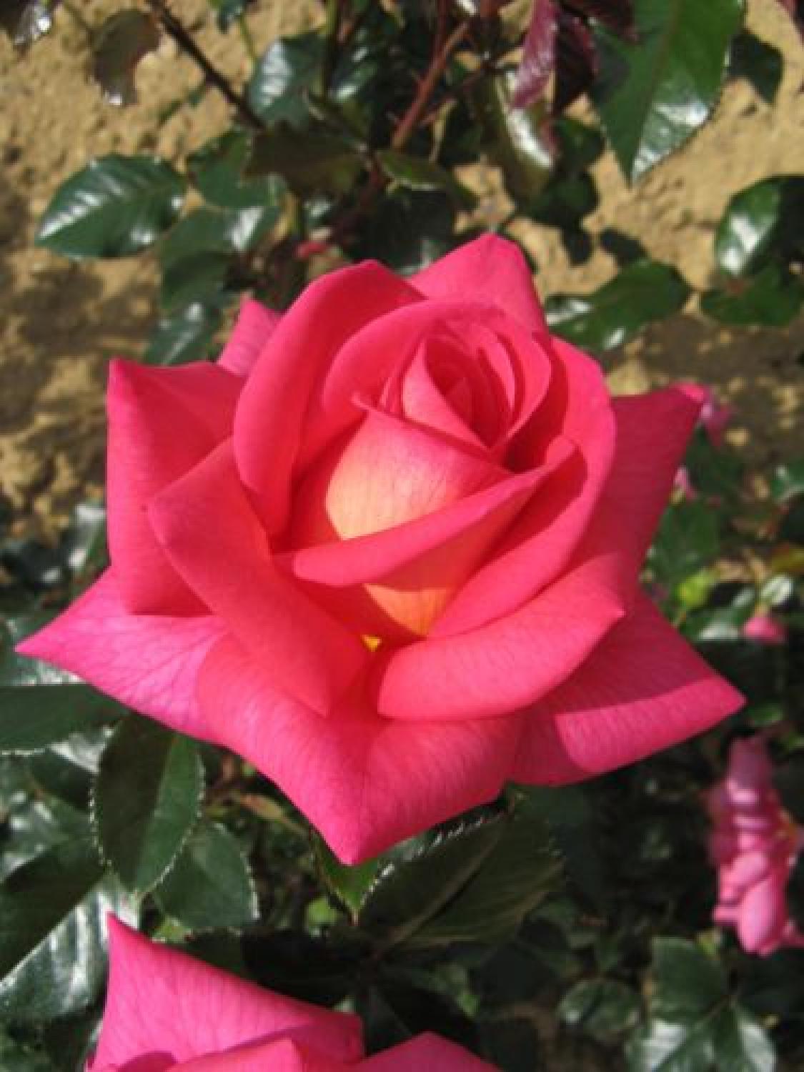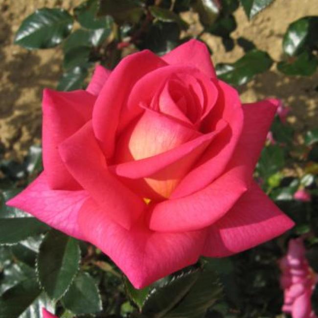 Deze roos heeft grote donker roze klassiek gevulde bloemen met geel kleurige achterzijde van de bloemblaadjes. Een bossige roos met glanzend donkergroen zeer gezond blad. De roos bloeit op de lange stelen en is daarmee zeer geschikt als snijroos.