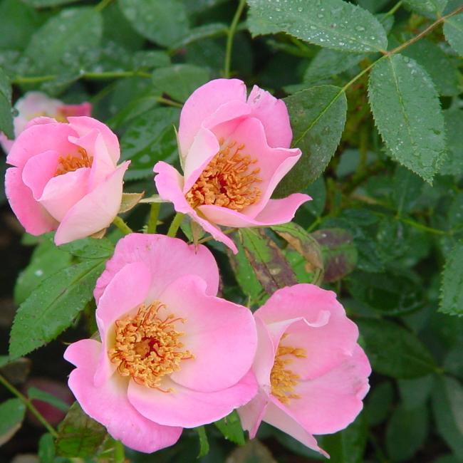 Een hoge heesterroos. Een van de vroegst bloeiende rozen. Zwaar aangezet met roze-rood en met opvallende meeldraden. Enkelvoudige bloemen. Donkergroen blad. Winterharde roos, mag op arme grond en kan een beetje schaduw verdragen. Een sterk geurende roos.