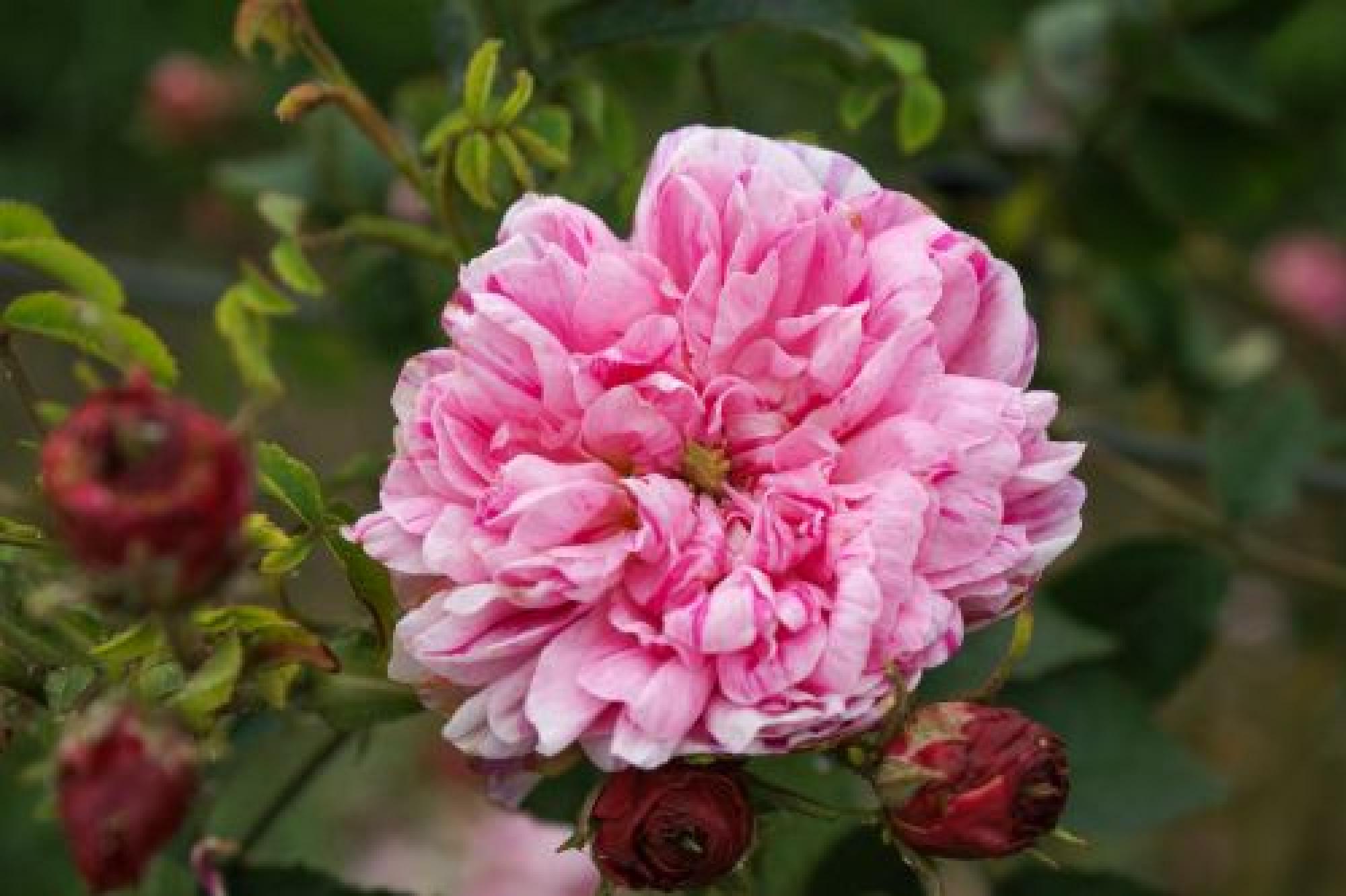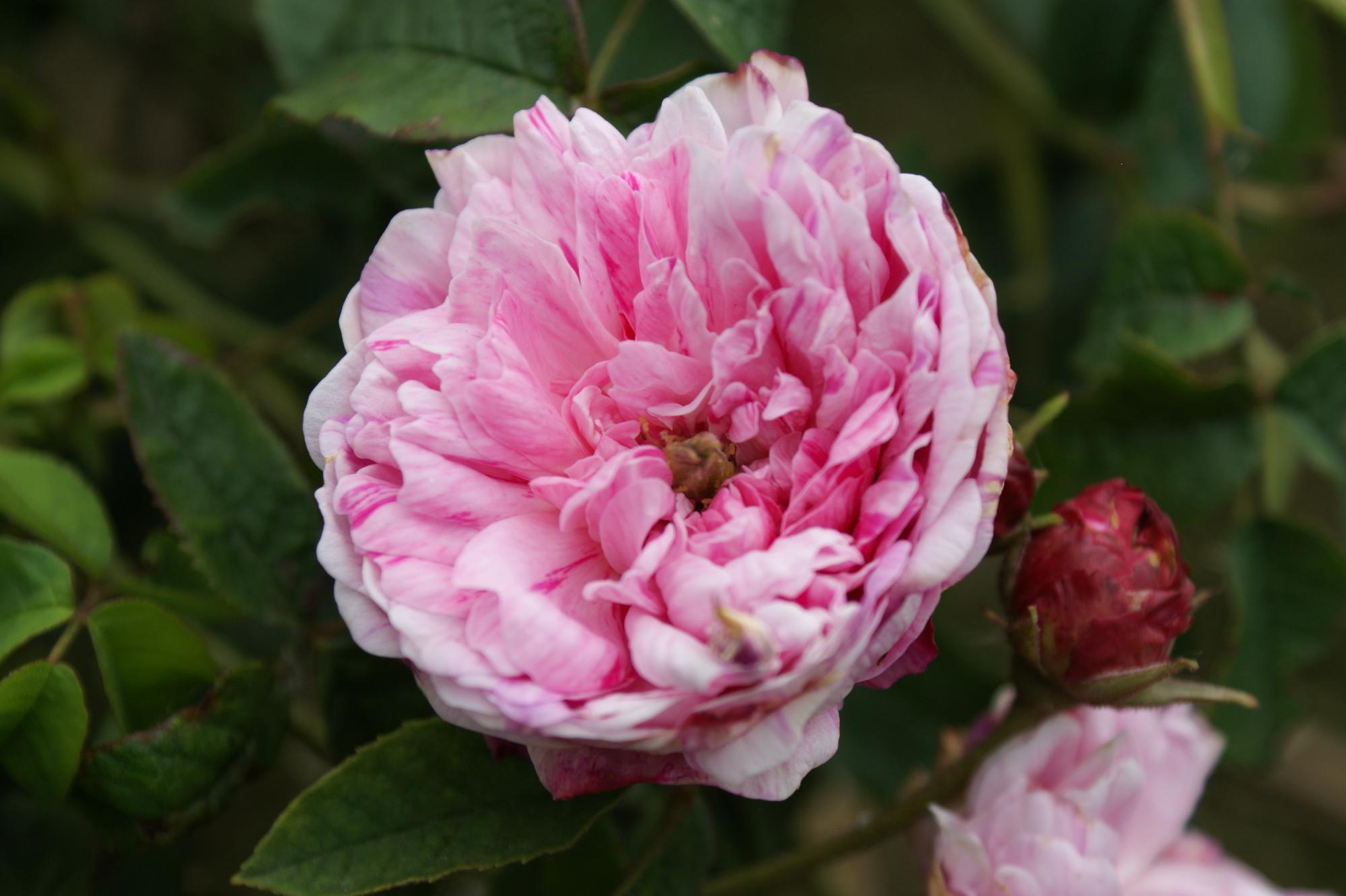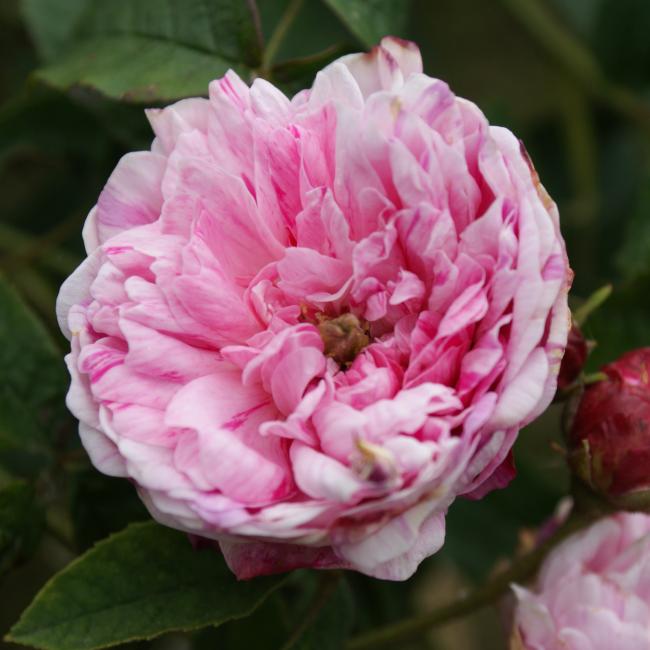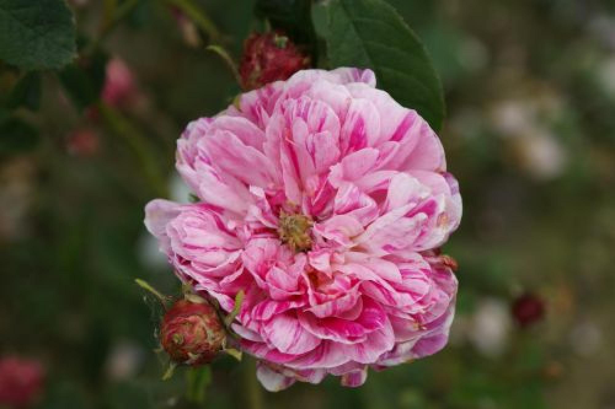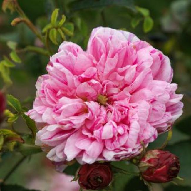 donkerrode bloemen met lichtroze- witte strepen. Deze roos bloeit 1 keer per jaar in het voorjaar of zomer. Groeit bossig en heeft lichtgroen dof blad.