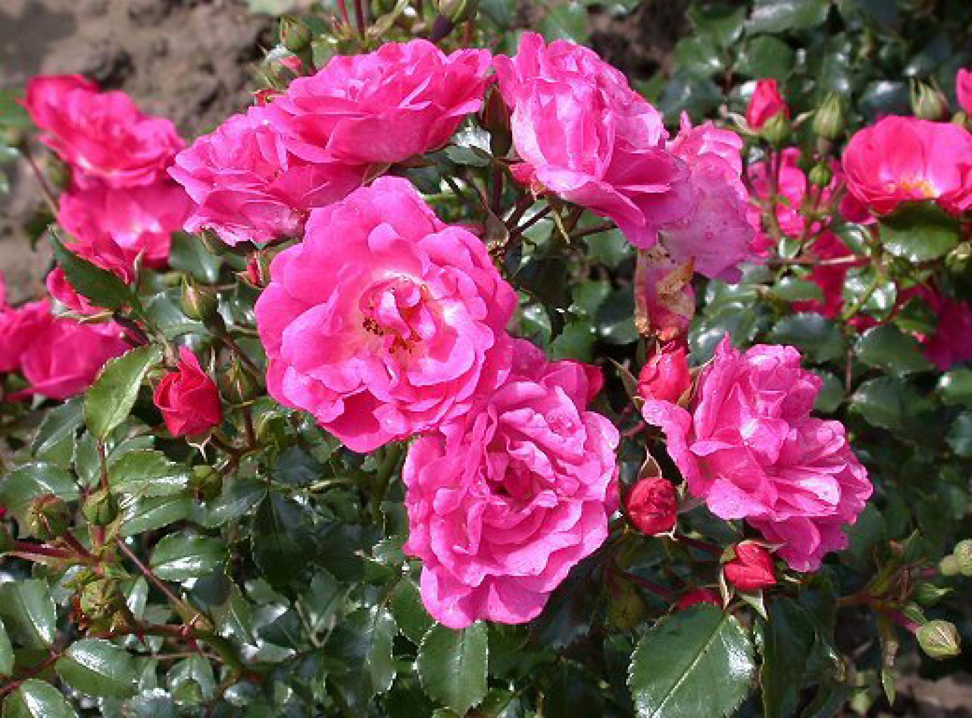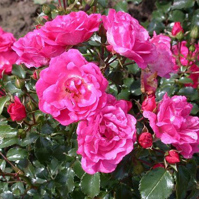Een donkerroze licht gevulde bloem die in grote trossen bij elkaar staan. Met mooie zeer gezonde donker groen bladeren die  dicht op elkaar staan. De hoogte is tussen de 40 en 60 cm en hij groeit tot 1 meter breed uit. Deze doorbloeide roos is een van de gezondste bodembedekkers. Hij kan ook zeer goed verwerkt worden in hanging basket voor het terras of balkon.