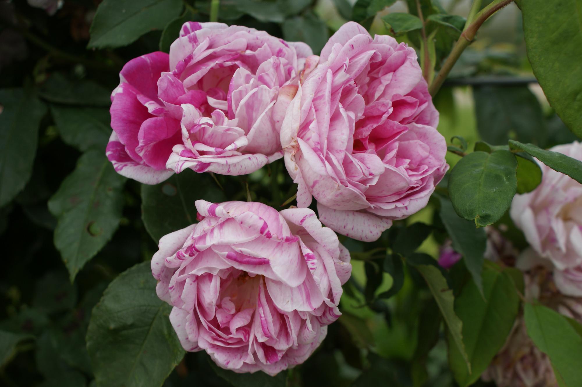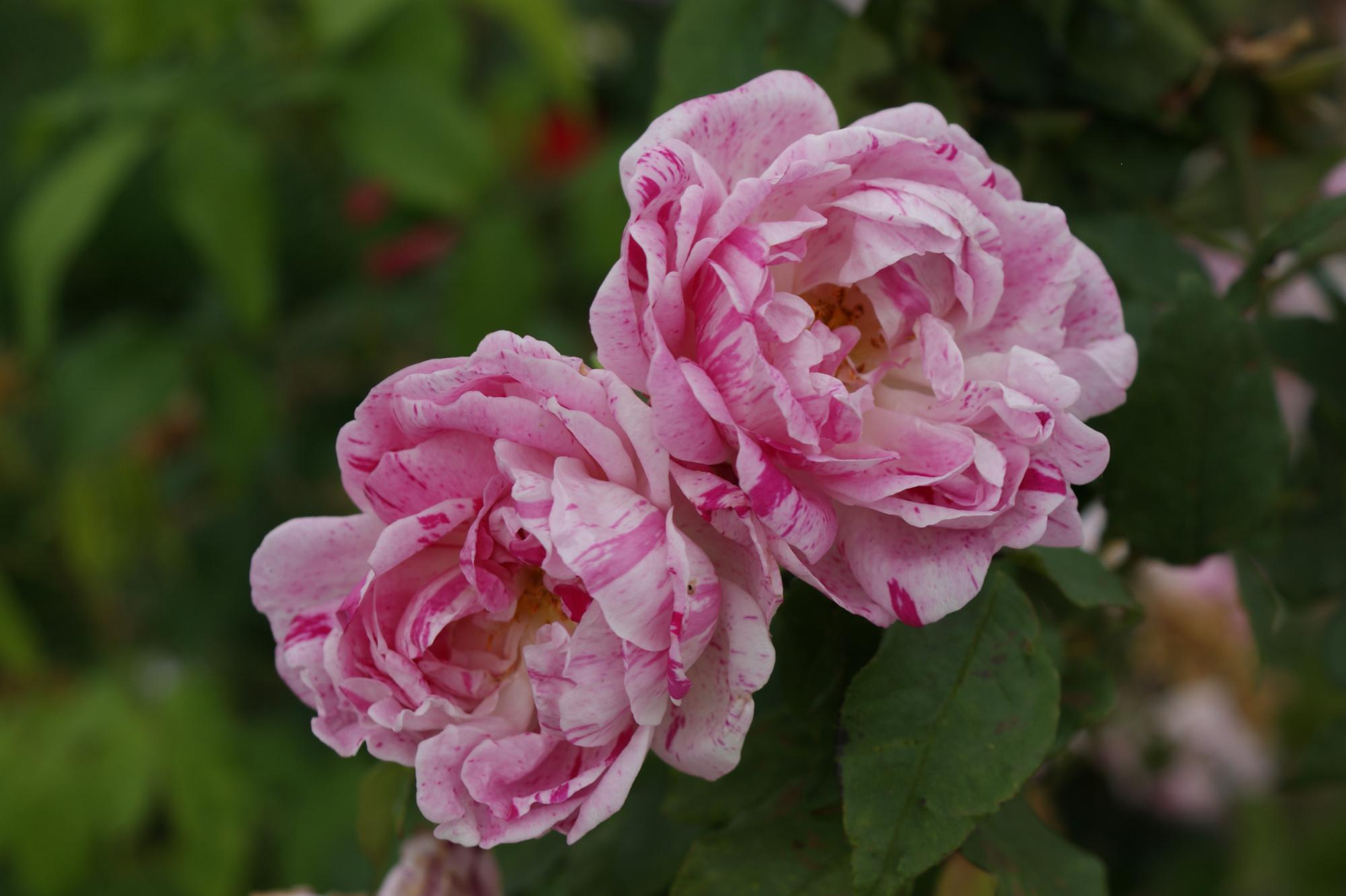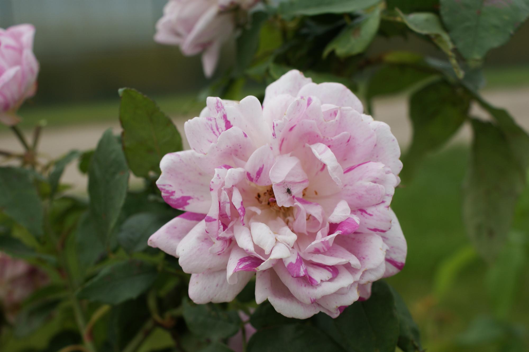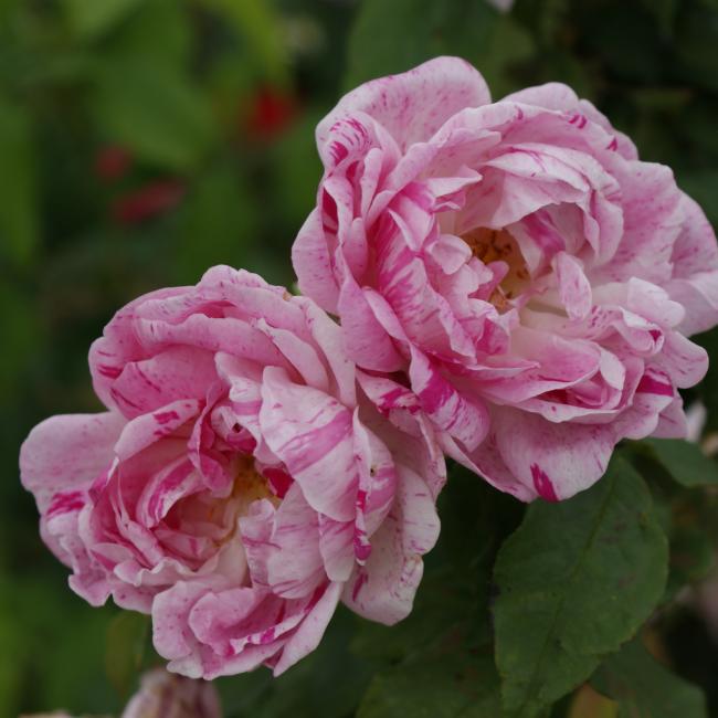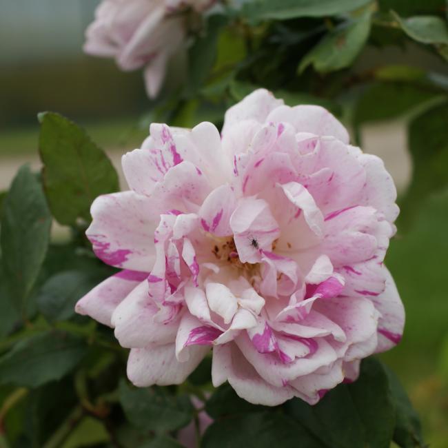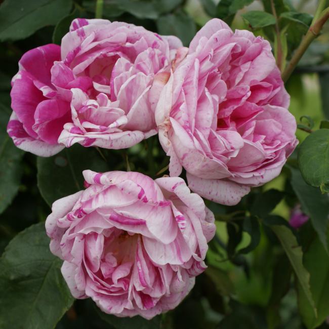 Deze bourbon roos heeft licht roze bloemen met paarse strepen. Erg opvallend! Komvormige, gekwartierde bloemen. Deze roos is erg sterk geurend.