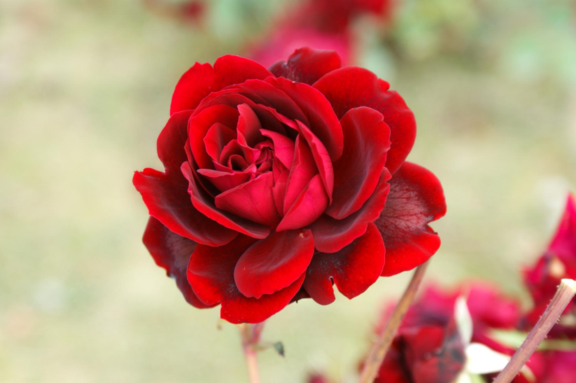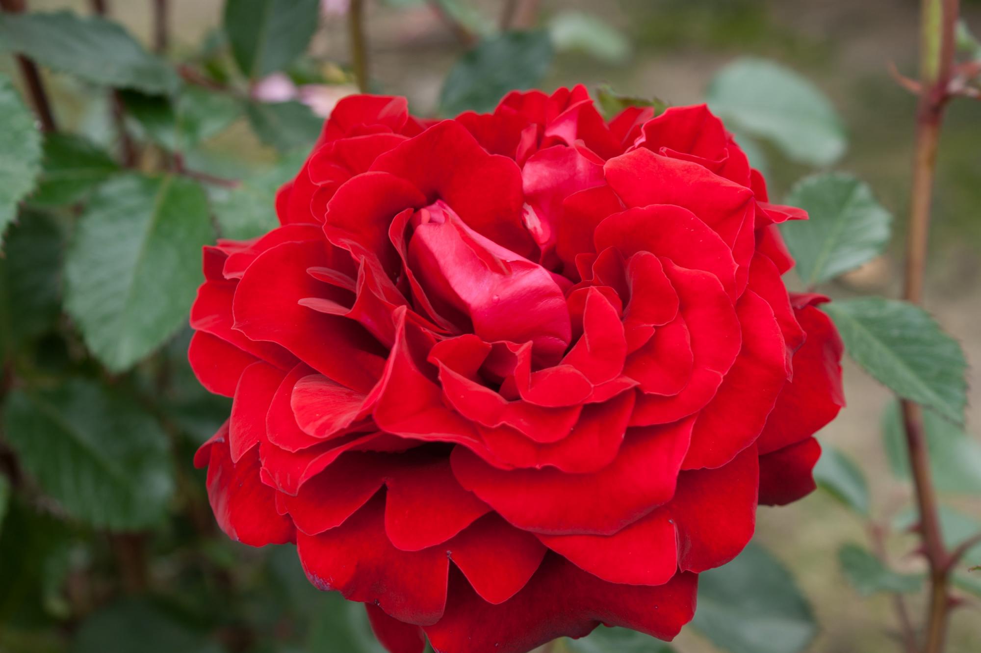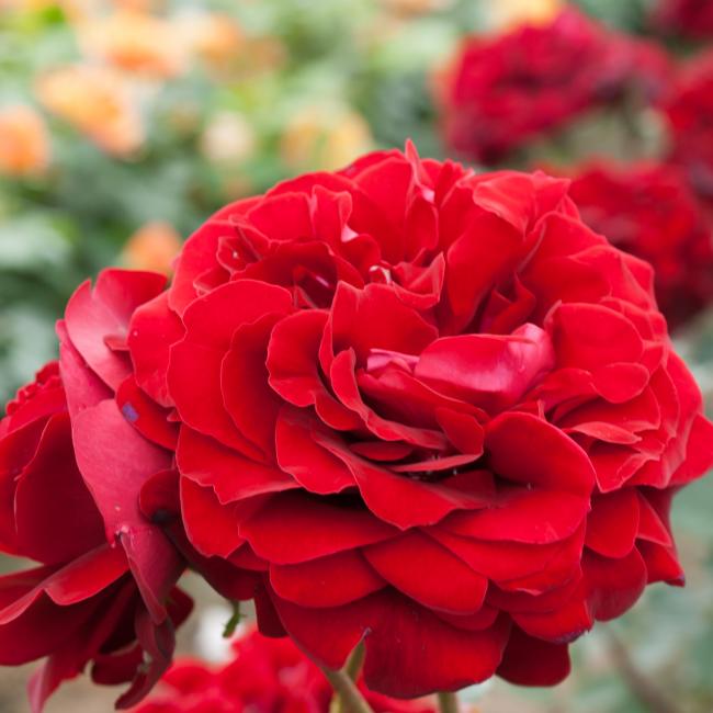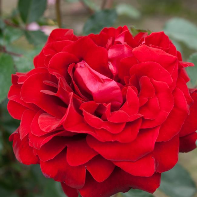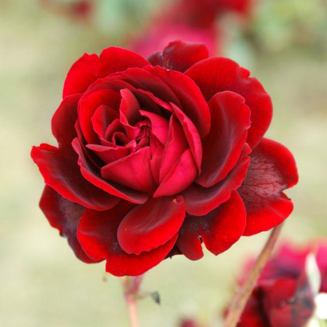 Een heesterroos met trossen donkerrode dik gevulde rozen. Heeft een typische oude rozen geur.