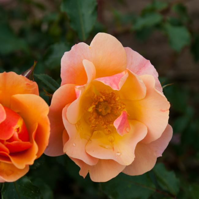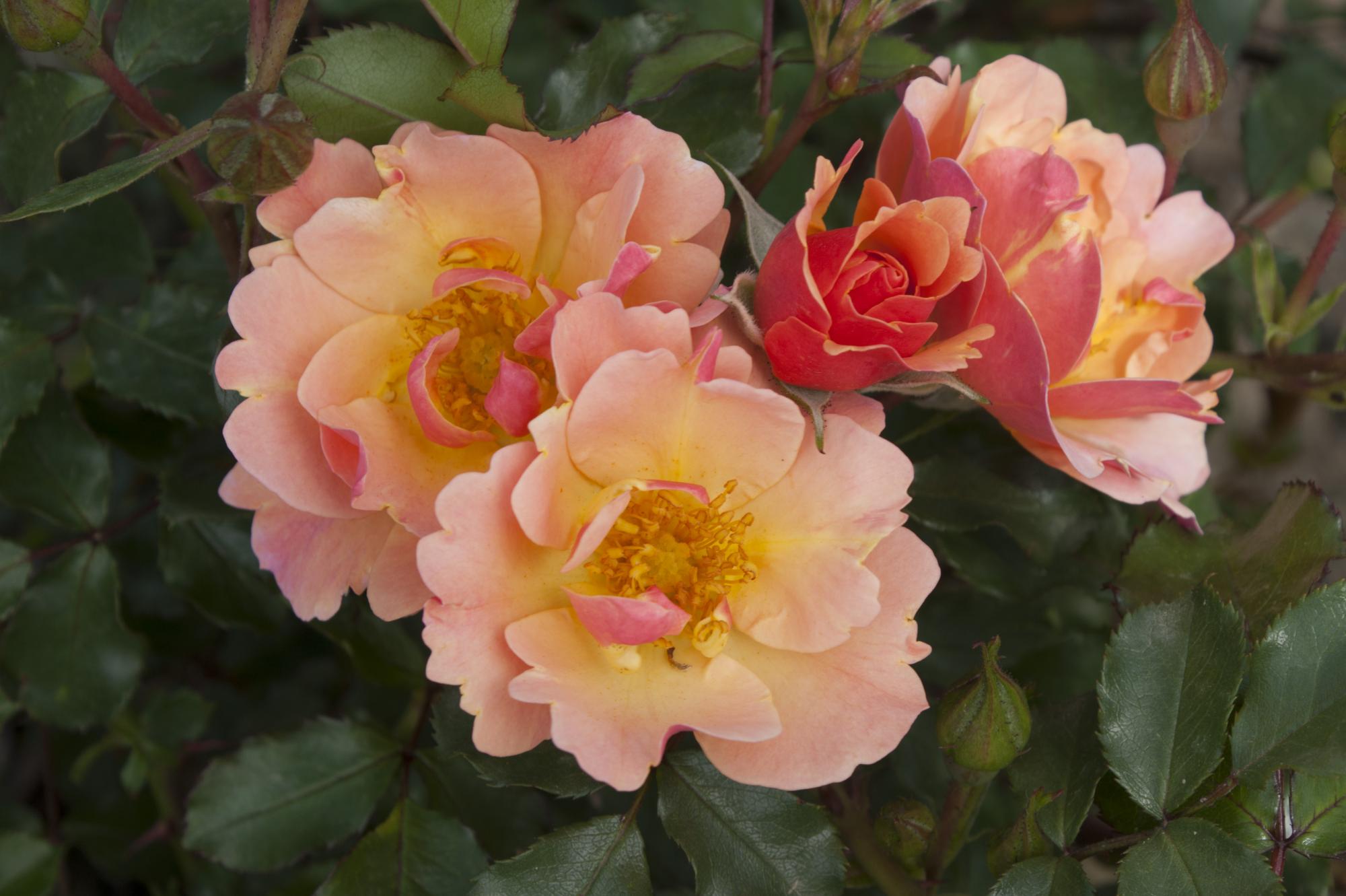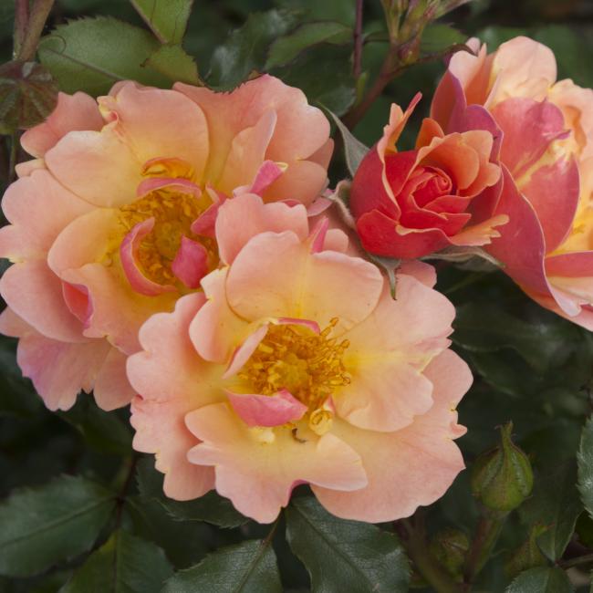 Deze roos bloeit met koper, Orange bloemen met perzik kleurige randjes. De bloemen zijn middel groot en enkelvoudig. De meeldraden zijn duidelijk zichtbaar. Het is een opvallend gezonde roos met glanzend donkergroen blad. Een absolute aanrader!