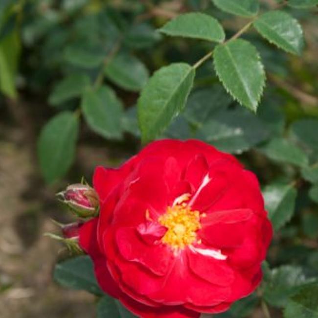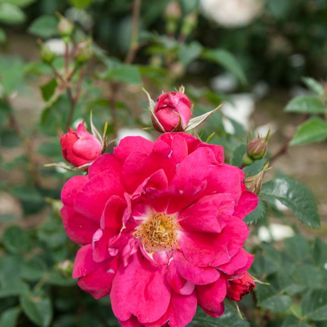 Een roos met halfgevulde bloemen, rijkbloeiend en zeer sterk. De meeldraden zijn duidelijk zichtbaar. Goed regen- en ziekteresistent. Uitermate geschikt voor hagen. Is absoluut de ideale roos, erg gezond, mooi glanzend blad en vraagt zeer weinig onderhoud. Als haag of perk roos word deze 150 cm. Als klimroos rijkt hij tot 250 cm