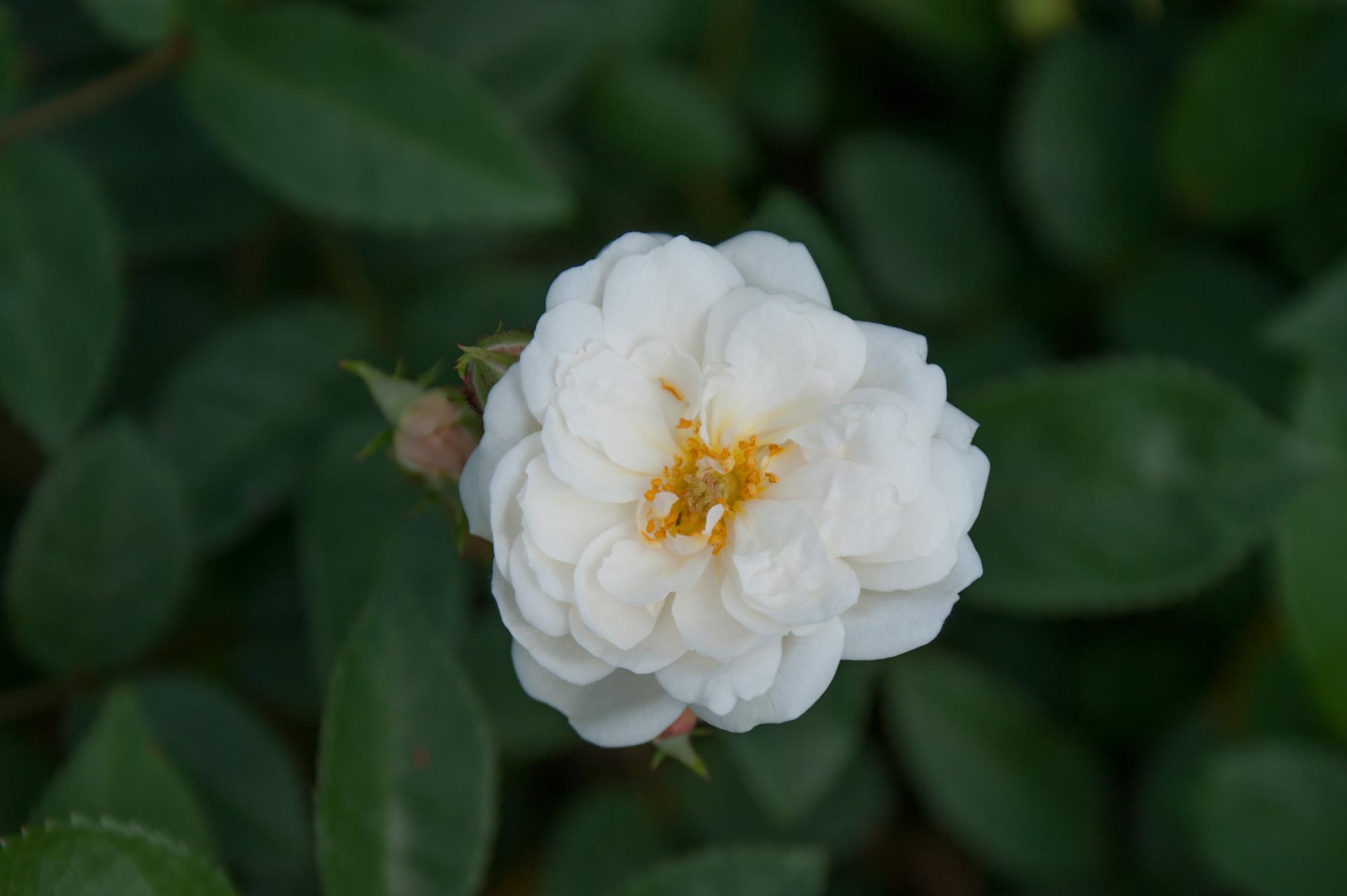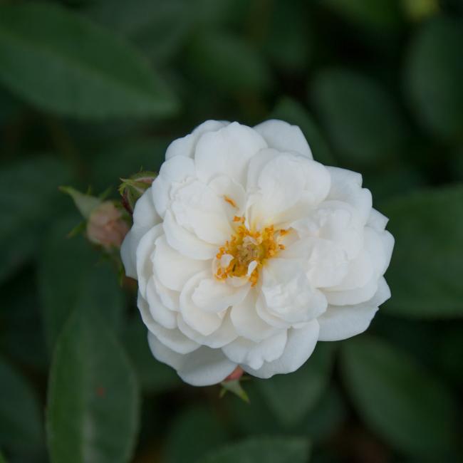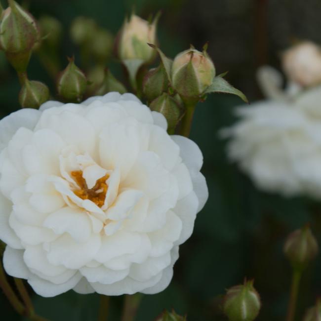 Witte kleine bloemen staan in grote trossen ten overvloed aan deze struik. De roos bossig en kort gedrongen. En daarmee geschikt als potroos of als perkroos.