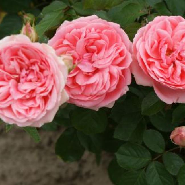 Roze roos met gevulde bloemen die in trossen aan de stelen staan. Een zeer rijkbloeiende roos.