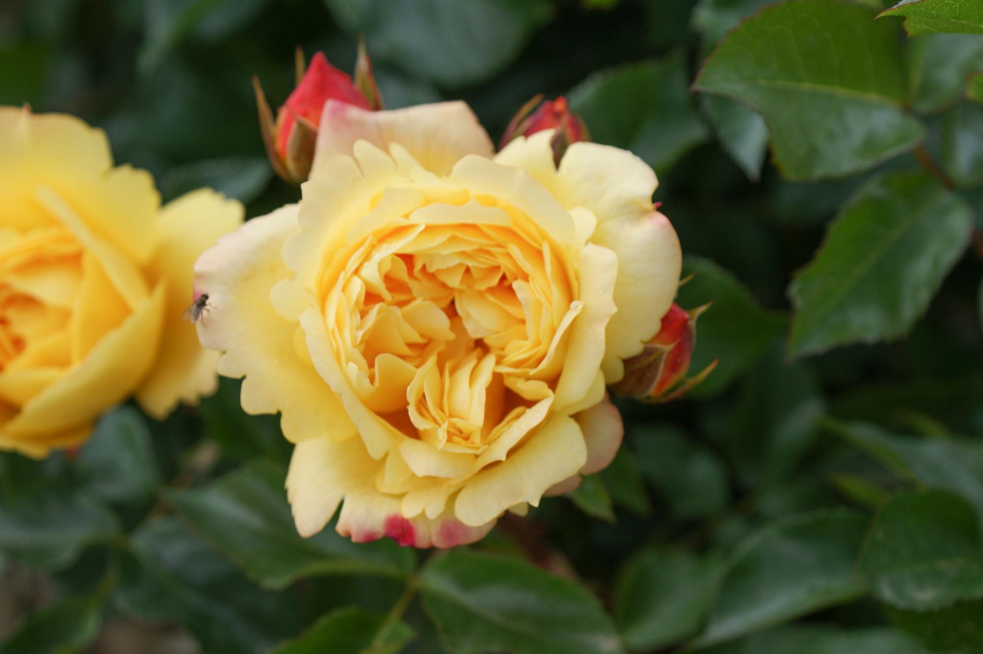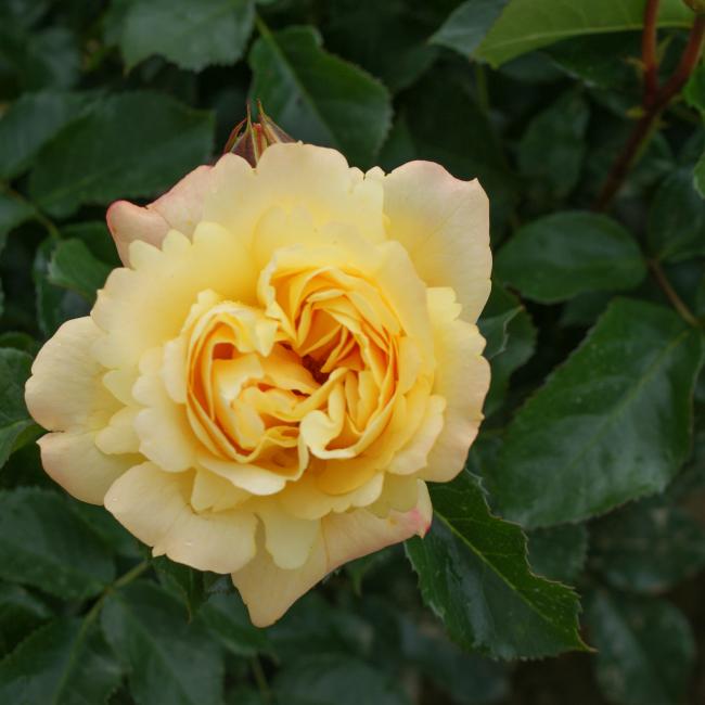 Zeer gezonde roos met gele bloemen die later iets een roze gloed krijgen.