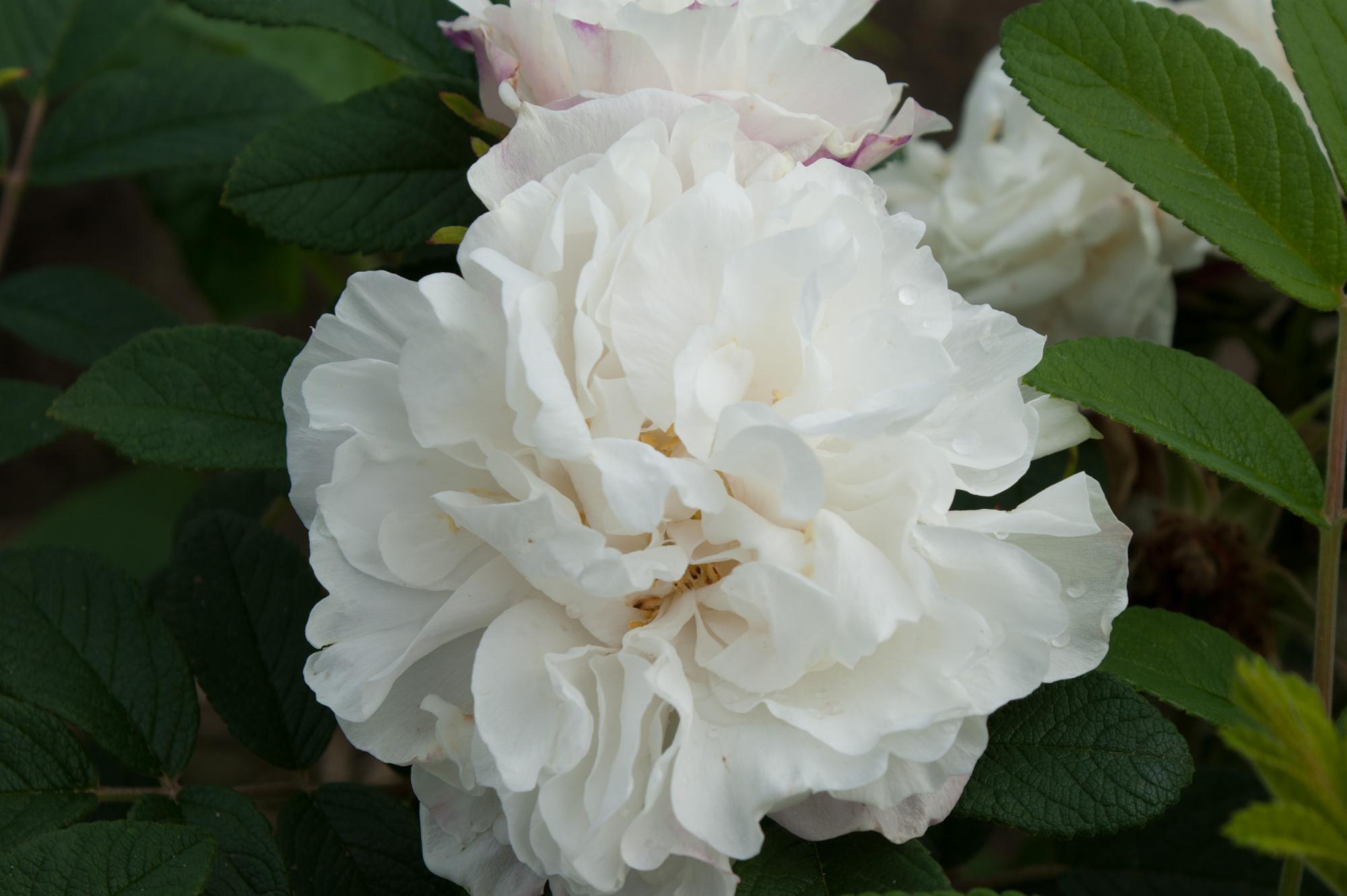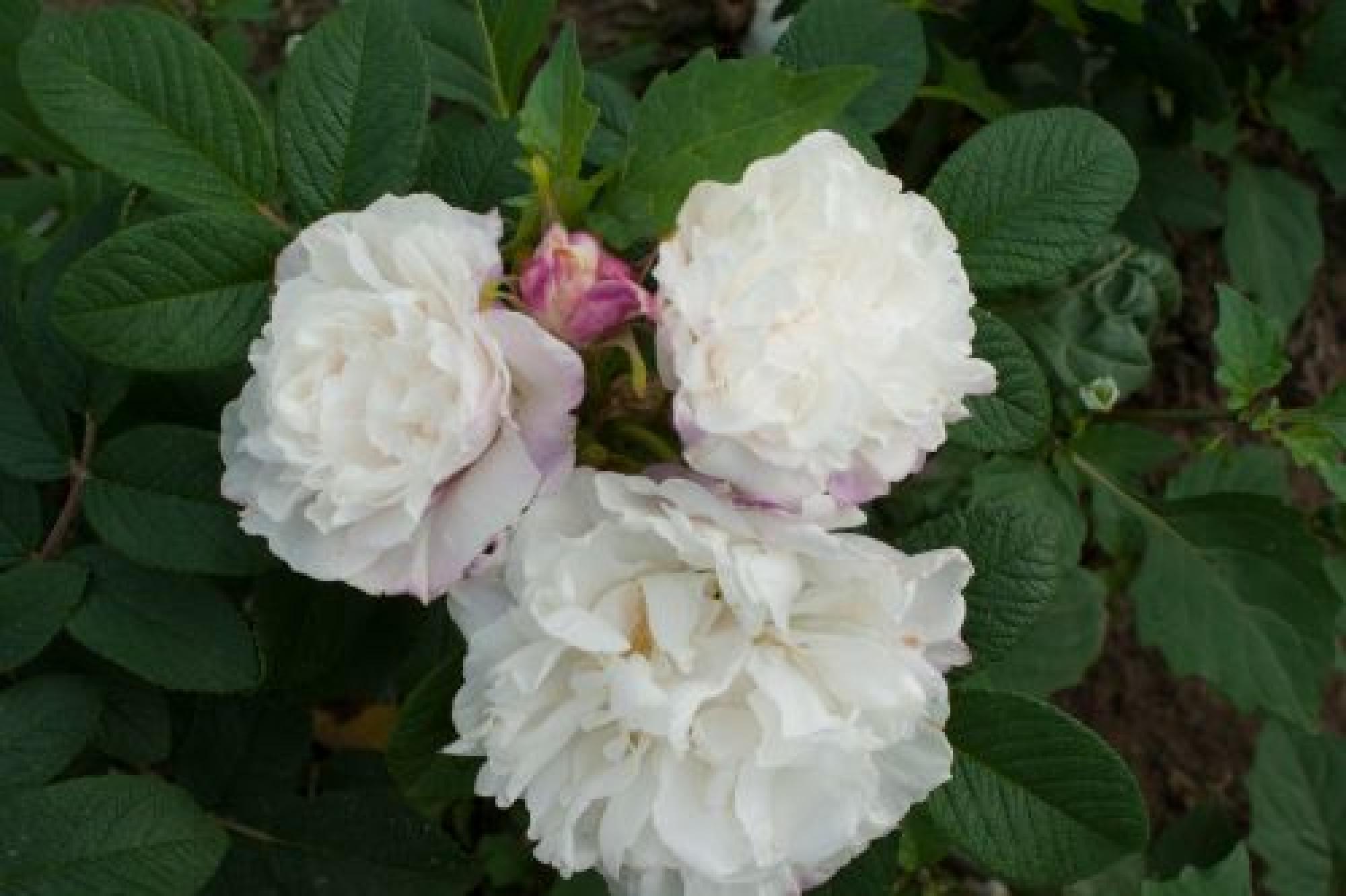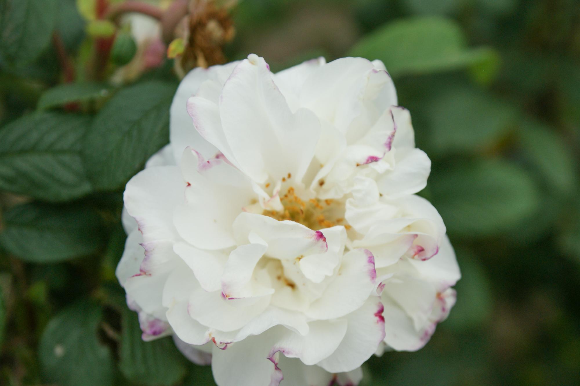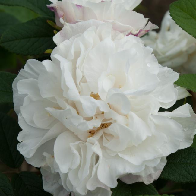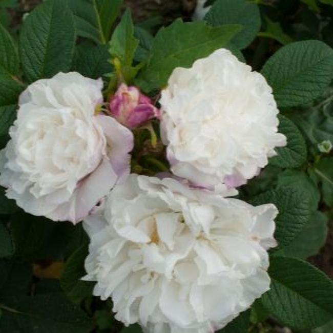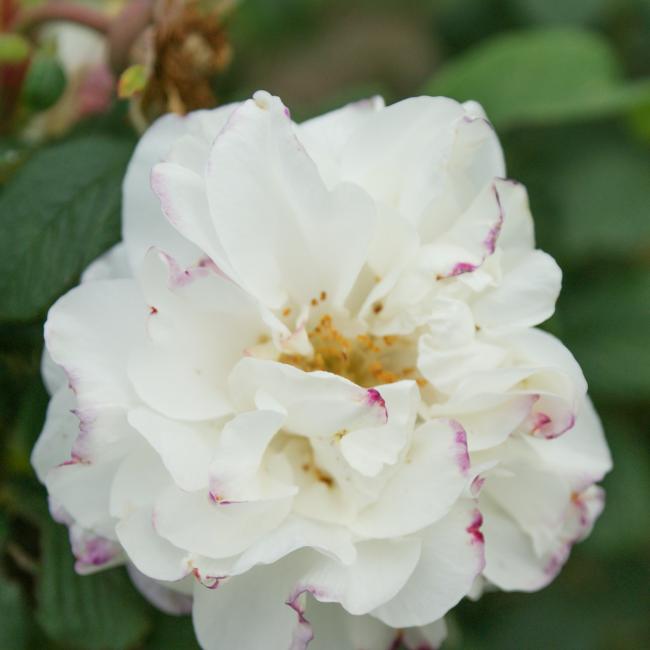 Een heesterroos, van 90cm hoog en 1,5 meter breed. De nieuwe takken buigen over vanaf de basis. Het ruwe blad is grijsgroen en de gevulde, welriekende bloemen zijn crème wit met een warrig hart. De oranjerode bottels hebben soms een ovale vorm. Bloeiperiode is de zomer.