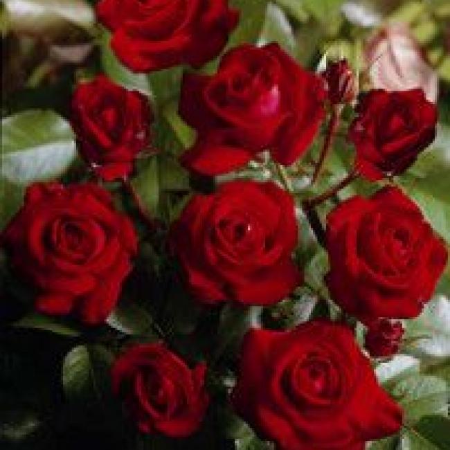 Donker rode, komvormig, gevulde bloemen staan in trossen aan deze rozenstruik. De bloemen zijn middelgroot. Maar bloeit erg uitbundig en is een dankbare roos. Het blad is donkergroen en erg gezond.