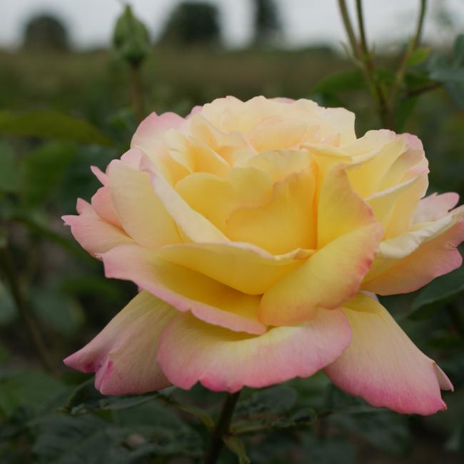 Een van de bekendste edelrozen uit het huis Meilland. Bloeit vanuit de goudgele knoppen tot een mooie bloem met een koperrode rand. Winter harde soort die goed verbloemt.Licht geurend.