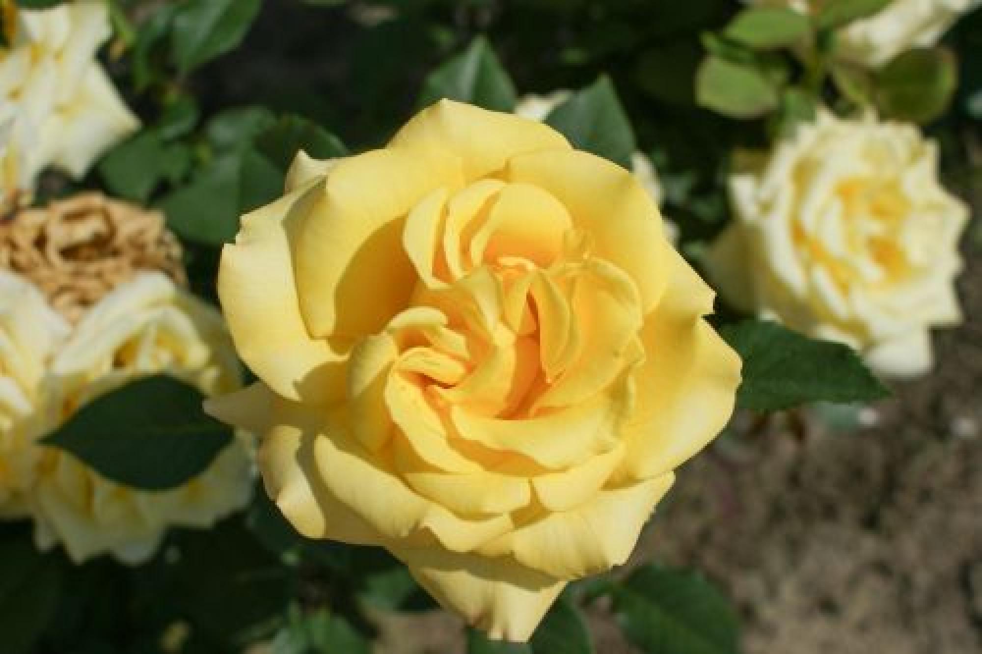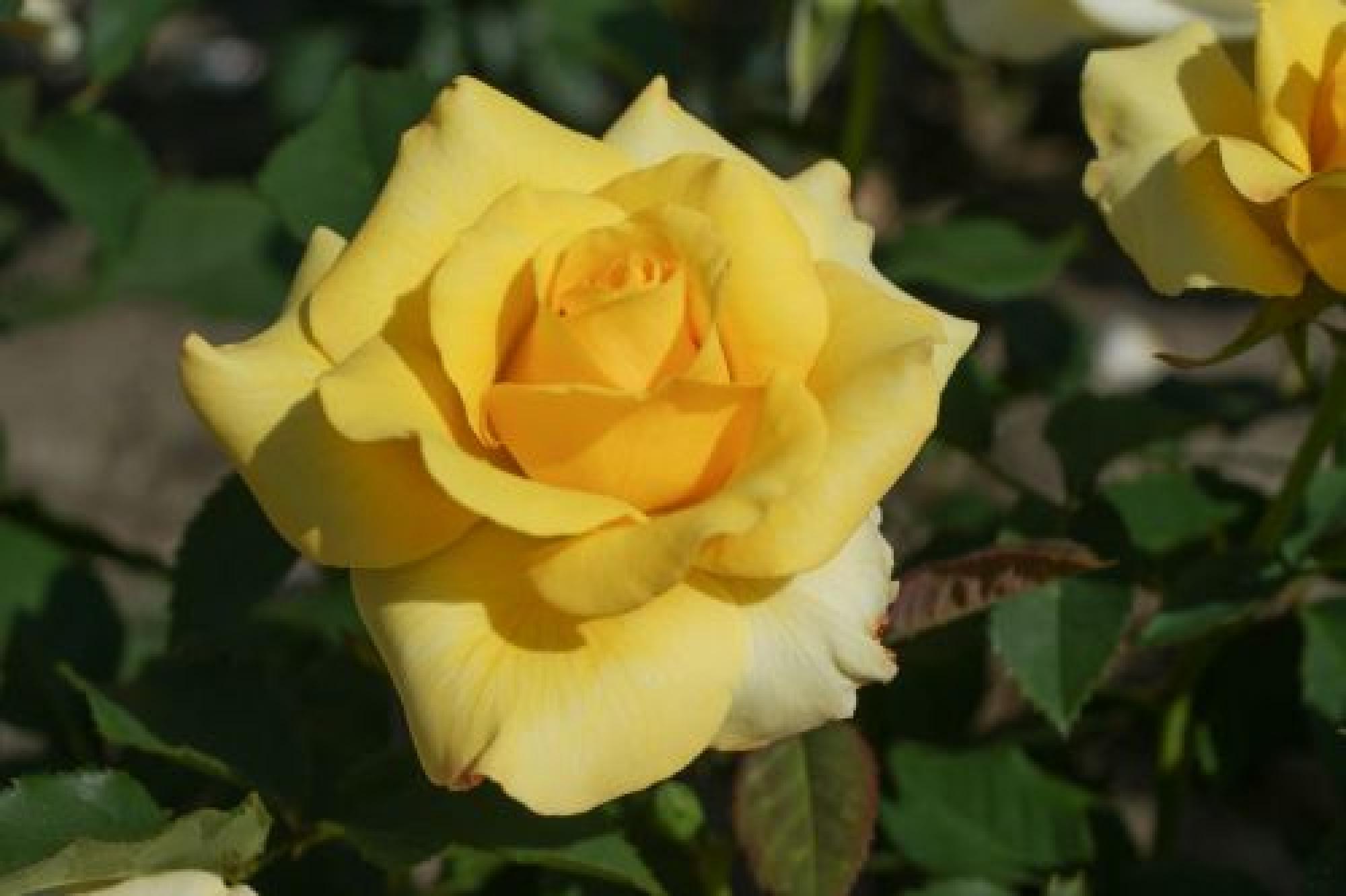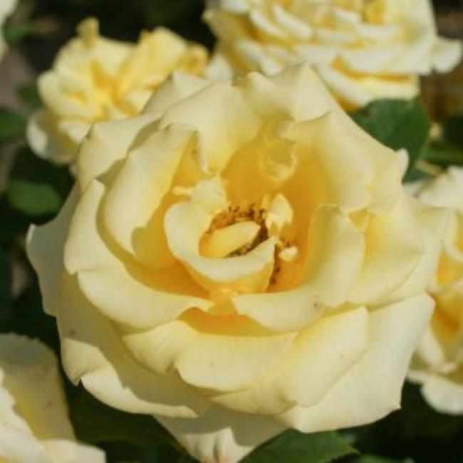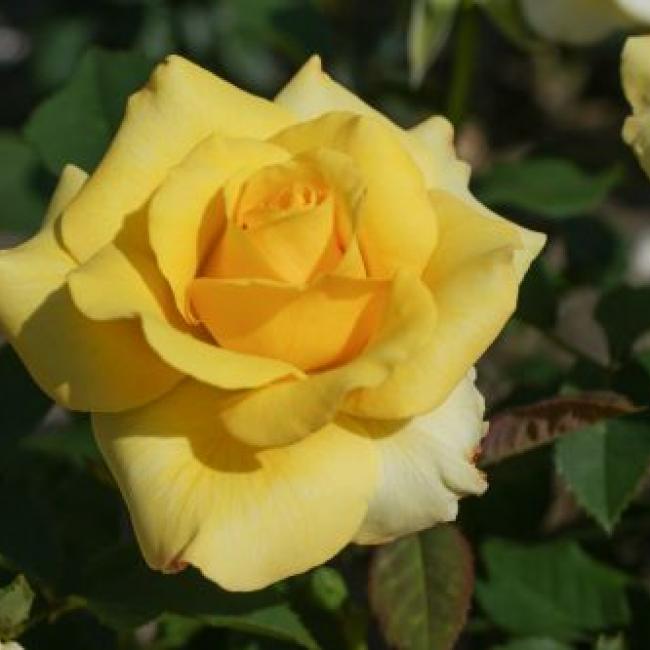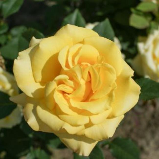 De dikke knoppen worden klassiek gevulde, warm gele bloemen. Bloeit met korte dikke, stevige stelen met ieder 1 dikke bloem erop. De bladeren zijn donkergroen en glanzend. Hiermee is deze roos geschikt voor in pot, maar natuurlijk ook voor in het perk.