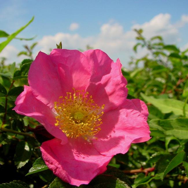 Roze bodembekkende Rugosa. Deze duinroos bloeit 1 keer per jaar in het voorjaar of in de zomer. Is van oorsprong een gezonde roos.