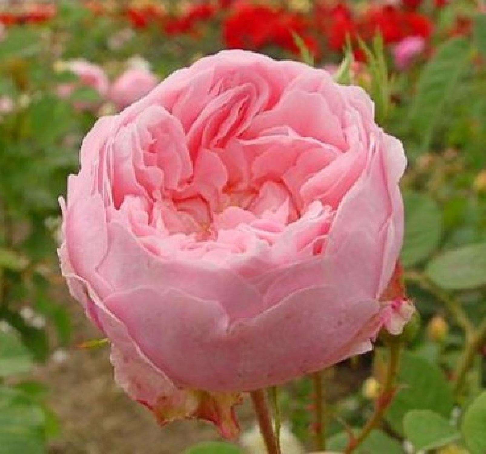Licht roze, dik gevulde ouderwetse bloemvorm. Prachtig! Typische oude rozen geur. Bloeit in trossen.