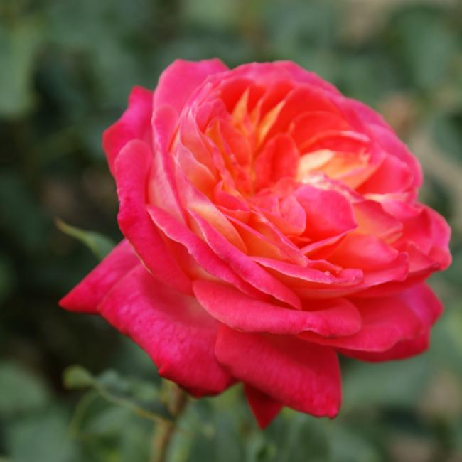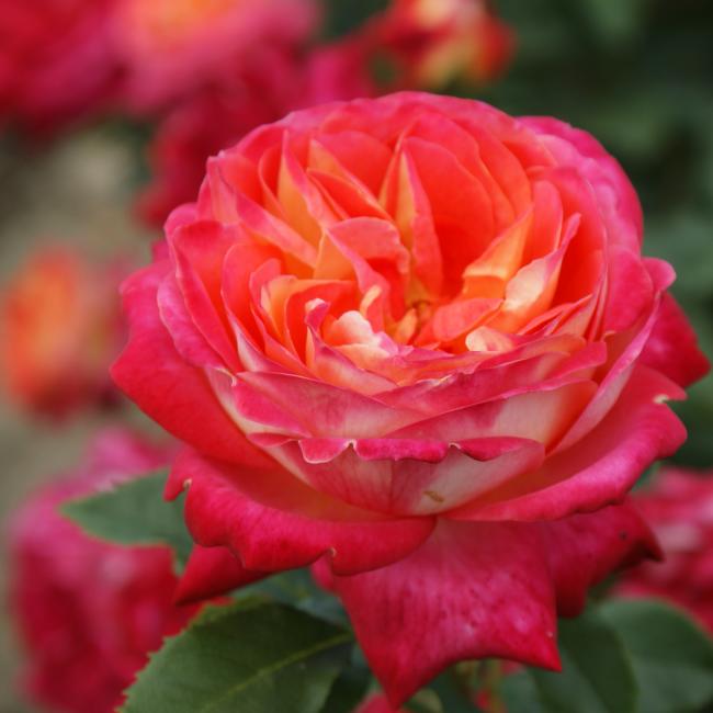 Deze roos is een trosroos, maar dan een met grotere bloemen. Ook wel een grootbloemige trosroos genoemd. De bloemen zijn Oranje - roze van kleur en de achterkant van de bloemblaadjes zijn geel. Deze roos is bossig en groeit rechtopgaand.