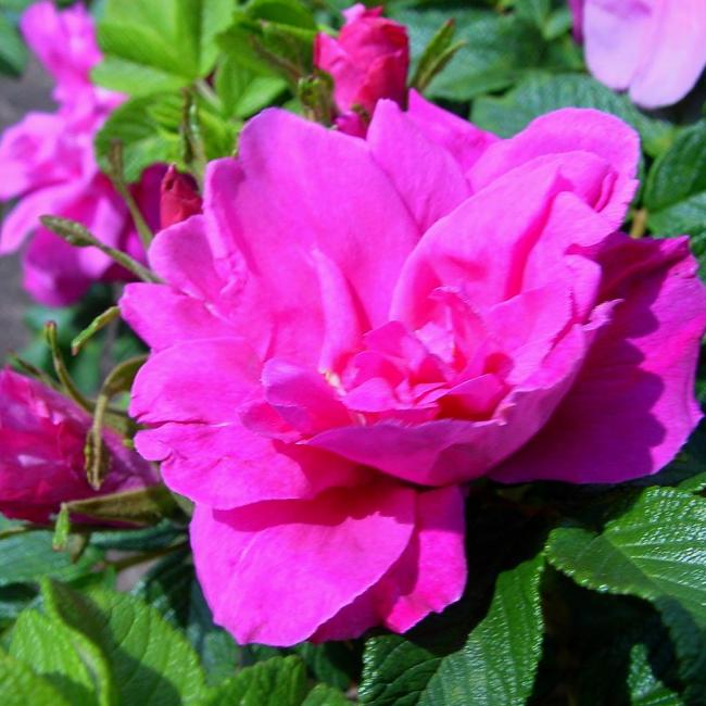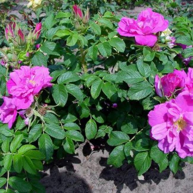 Middelgrote, halfgevulde bloem. De bloemen staan op korte knikkende stelen. Rijke bloei. De opvallende meeldraden zijn goud-geel. na de bloei komen er roze-rode bottels aan die een vlakke kogelvormige vorm hebben. Er zitten veel stekels op de takken. Ver opengaande knoppen. Helder groen blad later donkergroen, middelgroot en smal. Groeit breed en dicht. Op kalkhoudende grond is deze struik gevoelig voor Chlorose. Een sterke zoete geur.