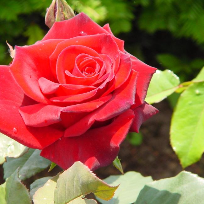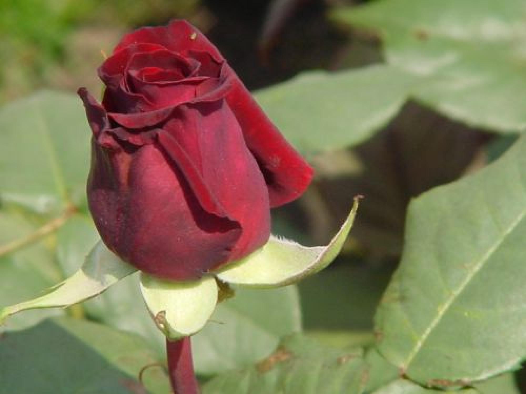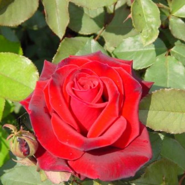 Slanke roos met diep donkerrode gevulde bloemen. Bloemen lijken wel fuweelachtig. De bloemen staan op lange stelen met mat groen leerachtig blad.