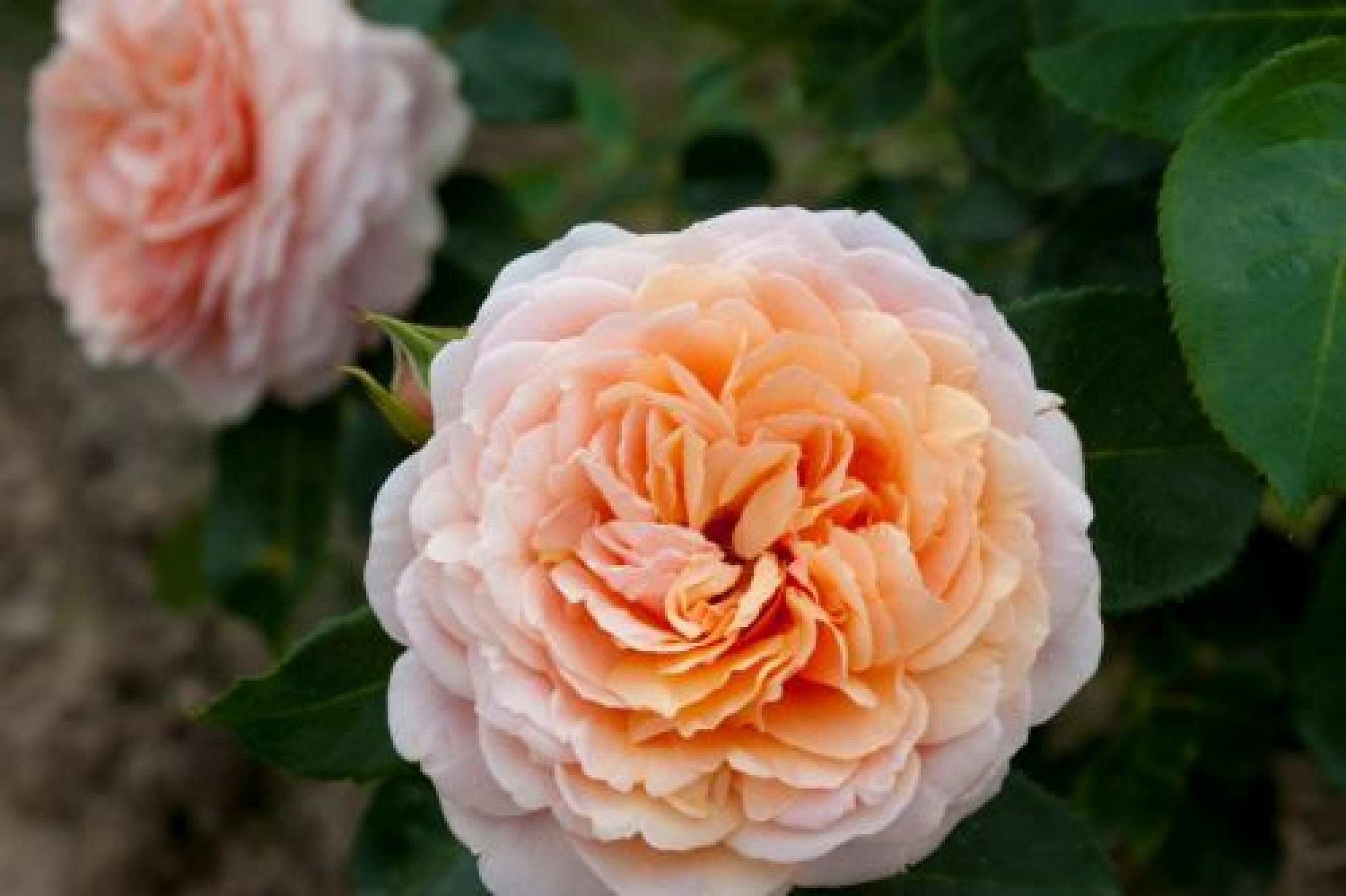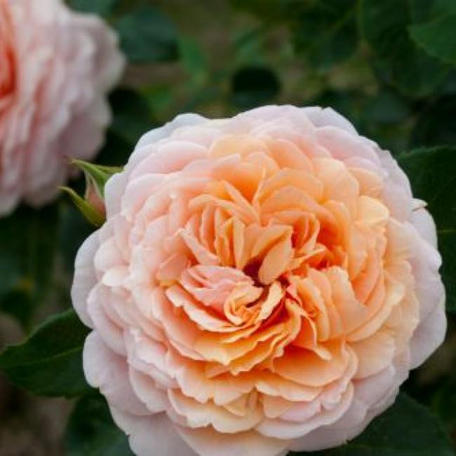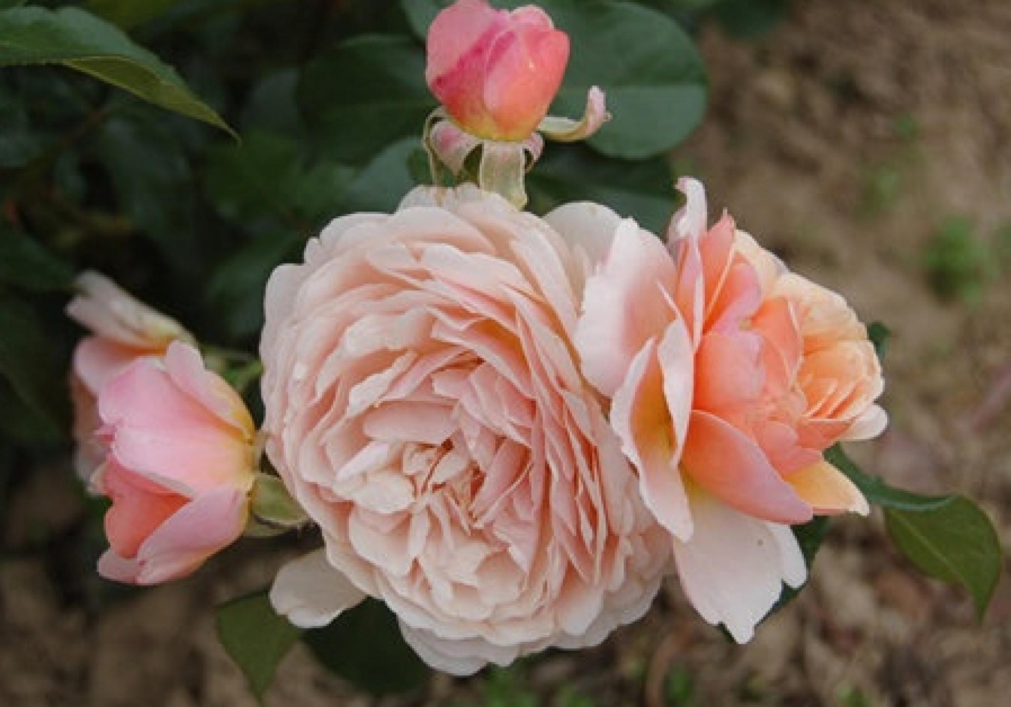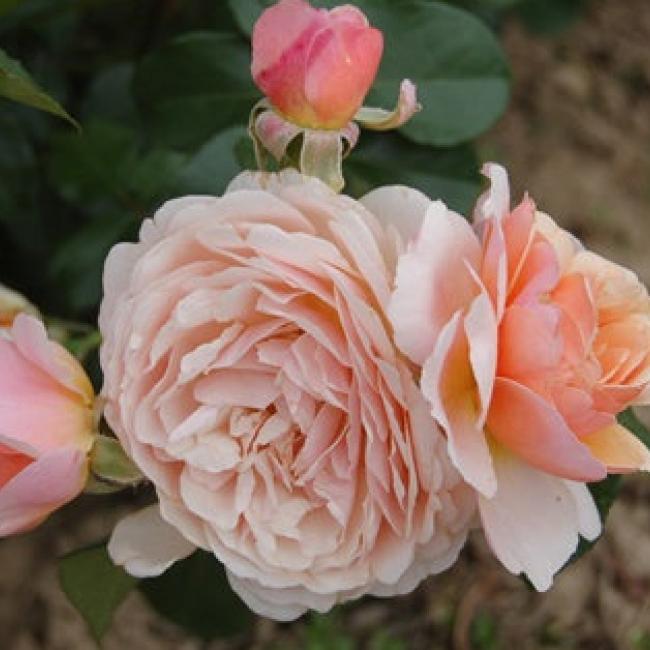 Grote trossen met perzik- zalmroze bloemen. De Bloemen zijn dik gevuld en zien er een beetje Engels/ romantisch uit. Het is een gezonde roos er donkergroen glanzend blad.