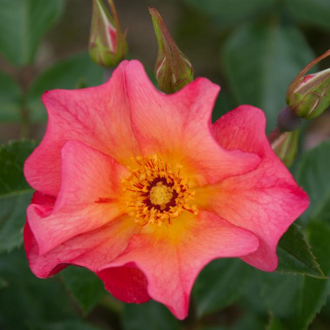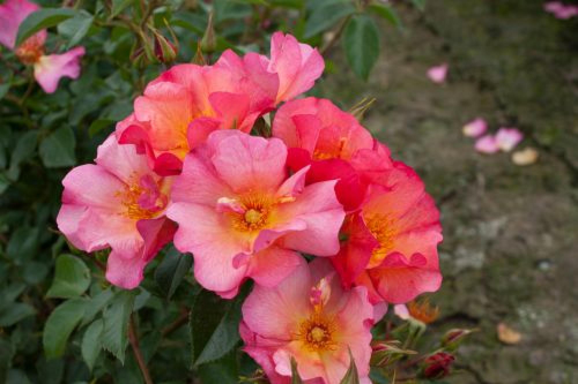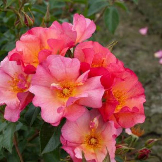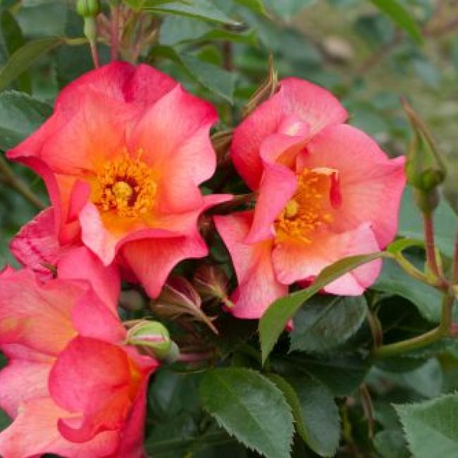Een indrukwekkende en zeer gezonde struikroos. Deze goede doorbloeier heeft bijzonder grote bloemen die zich helemaal openvouwen. De gele meeldraden zijn opvallend groot en passen mooi bij de kleuren van de roos. Perzik geel in het hart en overlopend naar koper-fuchsia roze. Het is een bossige roos met donkergroen glanzend blad die goed tot zijn recht komt in een natuurlijke tuin. Super gezond en als kers op de taart krijgt deze roos ook nog eens prachtige trossen bottels. Een aanrader!!