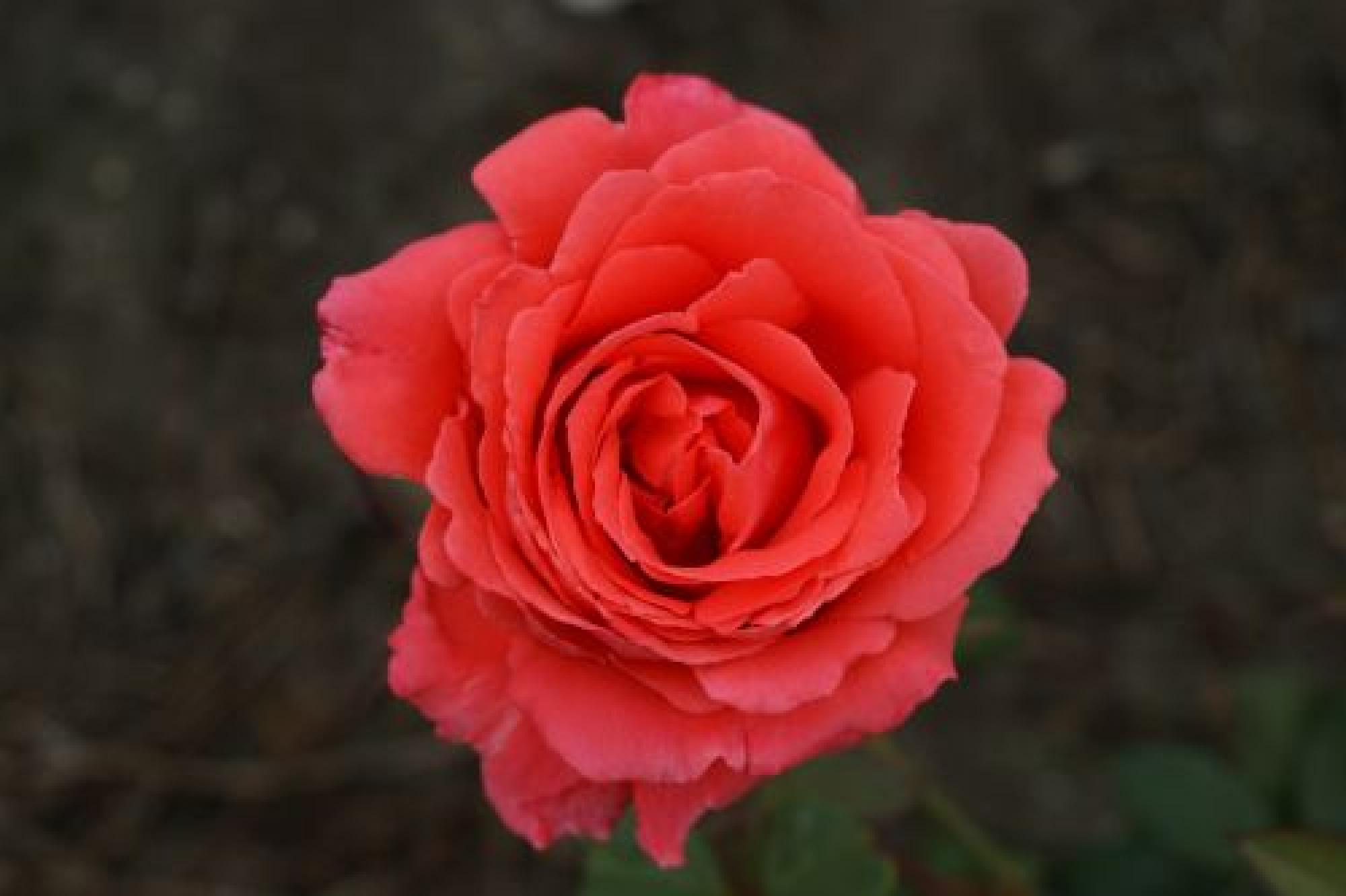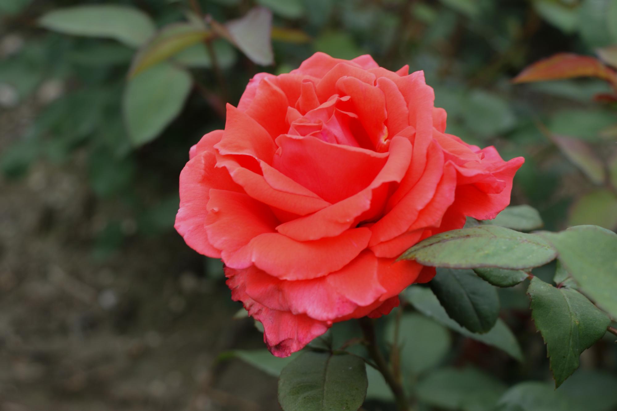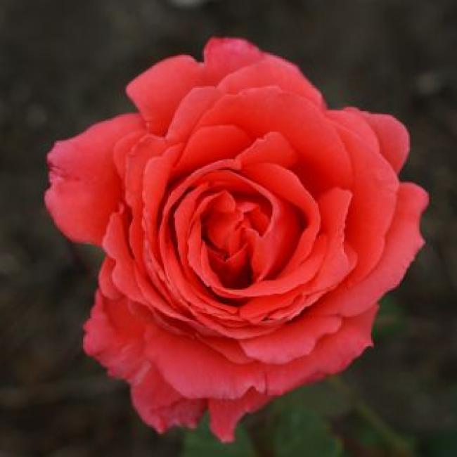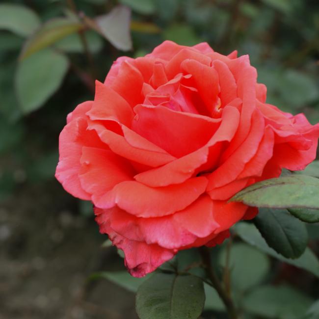 Zalm oranje grootbloemige roos. Mild geurend. Bloeit het hele seizoen.