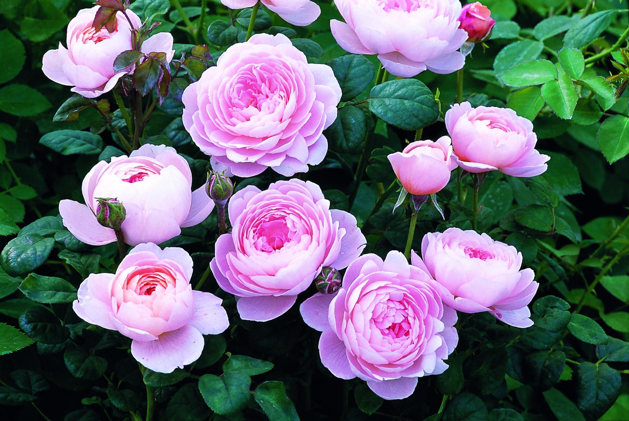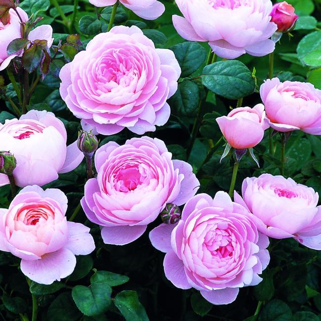 Licht roze bloemen met abikoos kleurige highlights. Is niet geurend, maar heeft verder alles van een typische Engelse roos. Komvormige, gevulde bloemen die in trosjes bloeien.