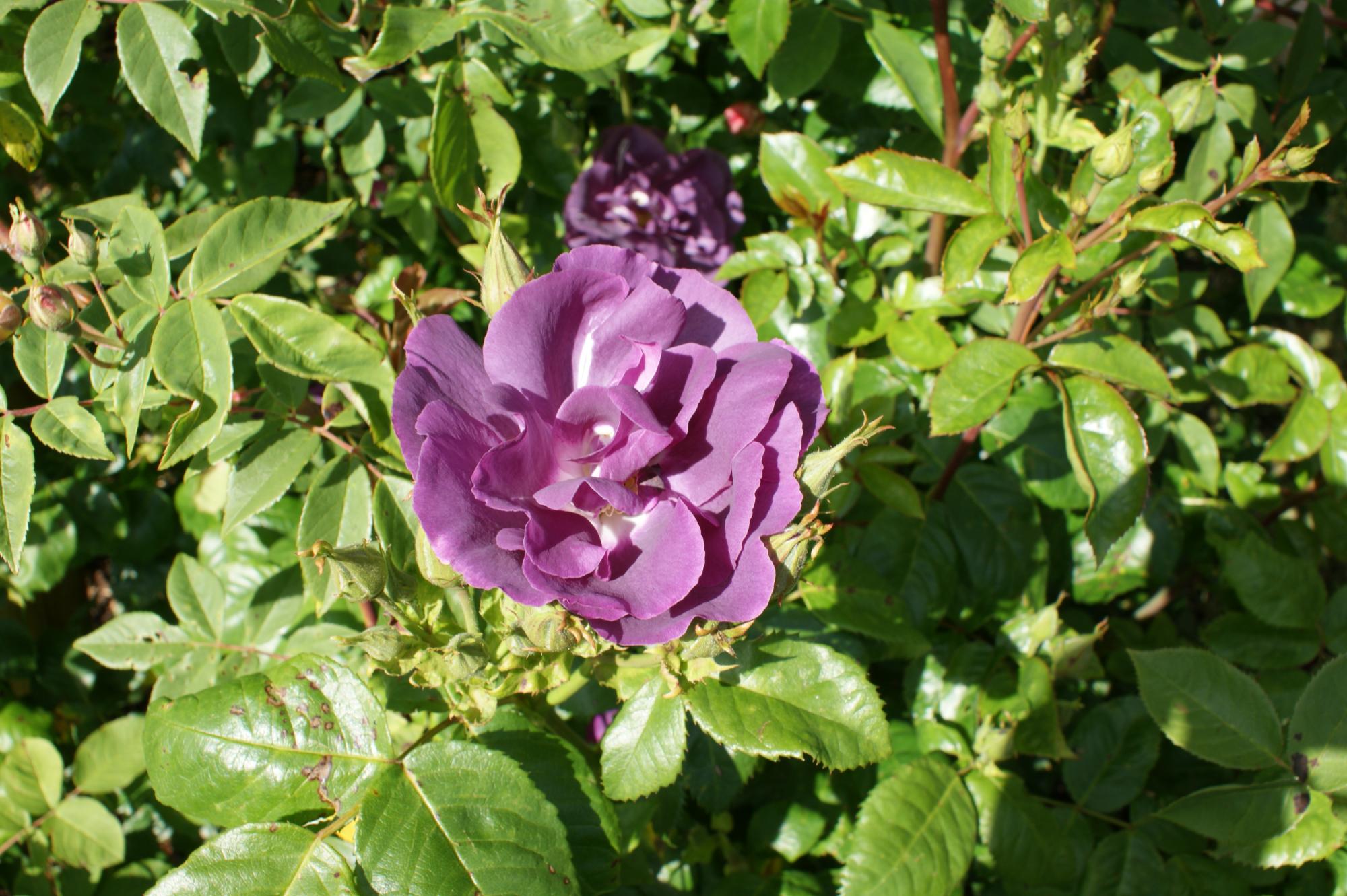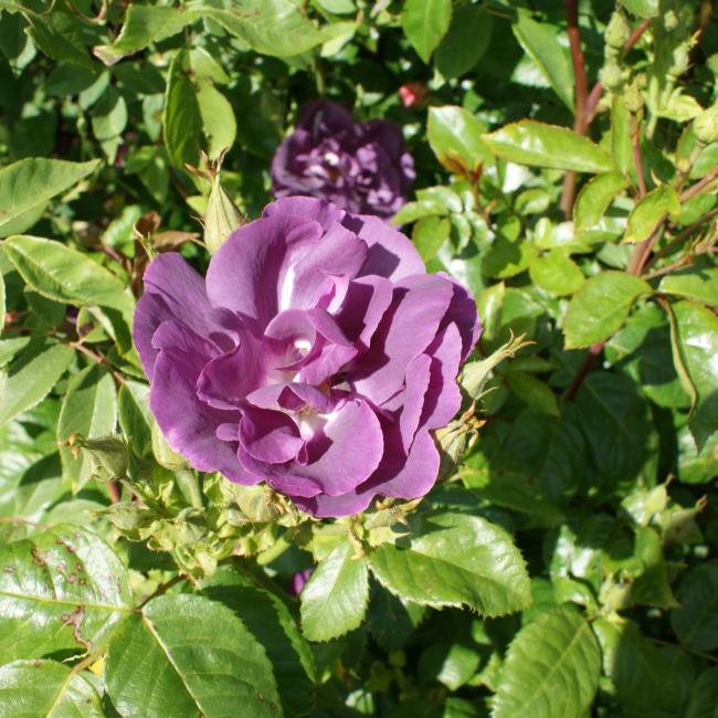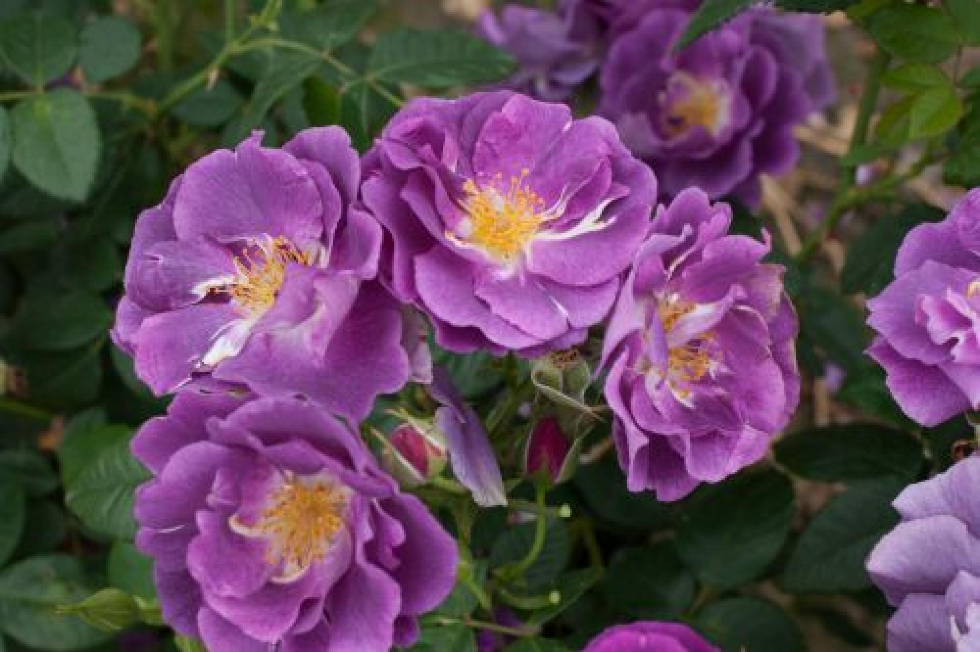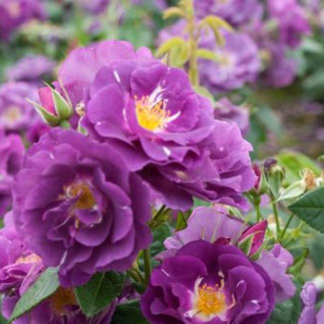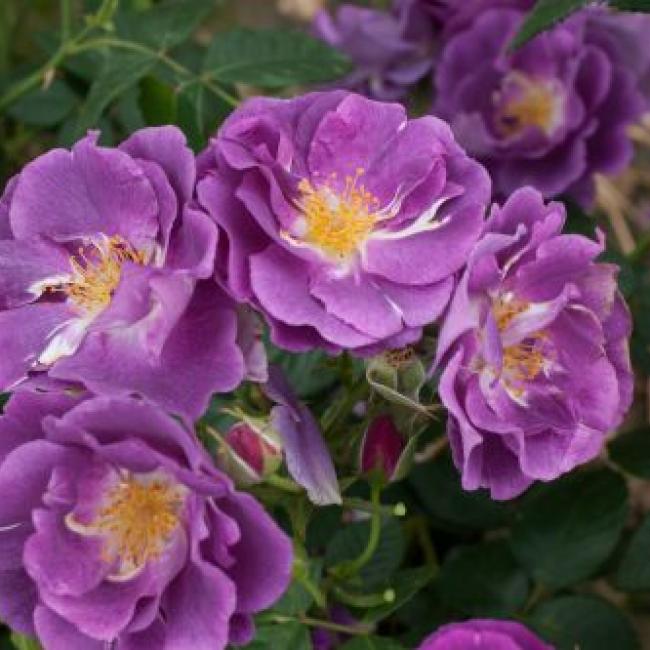 Deze heesterroos bloeit met dikke trossen vol open bloemen. De kleur is werkelijk bijzonder. De pruim paarse bloemen vervagen naar leisteen blauw. Soort smoke- blauw-paarse open bloemen die haar fel gele meeldraden laat zien. Prachtig! Deze roos is sterk geurend , erg gezond en goed doorbloeiend. Een topper!