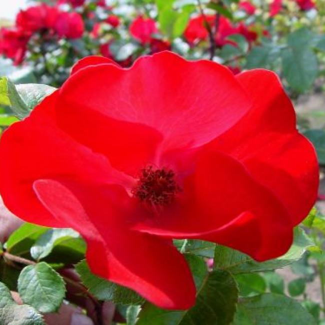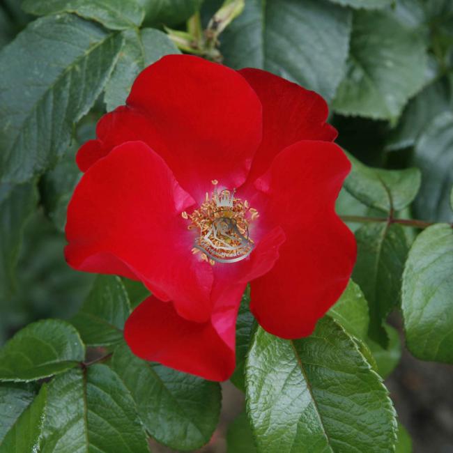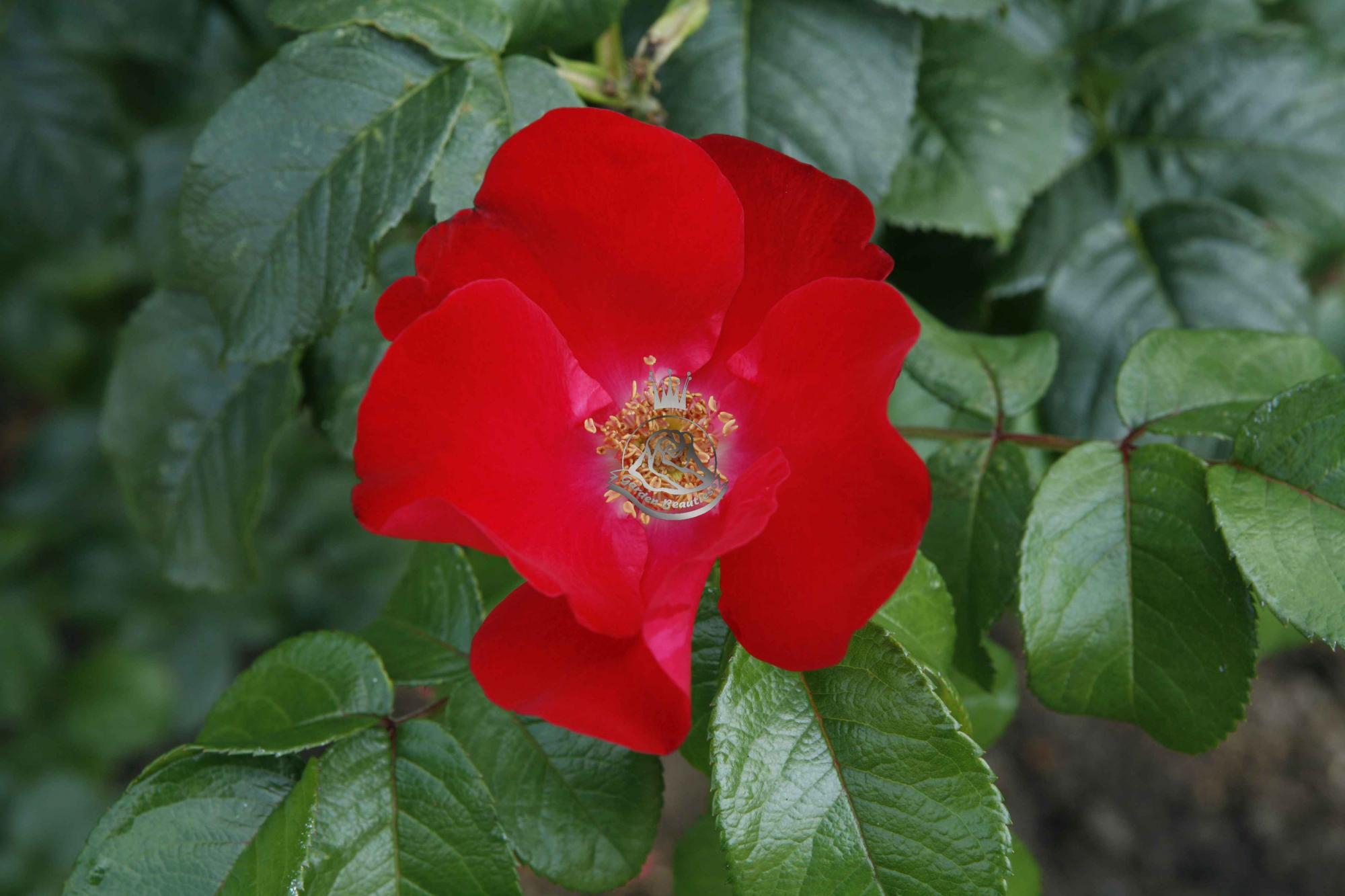 Een sterk groeiende roos met een donker leerachtig blad en dikke stekelige takken. De welriekende enkele bloemen ontvouwen zich tot een kom met vrij gefranjerde blaadjes rond de goudgele meeldraden. De hele zomer rijkbloeiend. Een robuste plant, die tegen de meeste grondsoorten, schaduw en weersomstandigheden kan. Vormt een hele dichte haag. In dat geval moet deze struik 's winters in vorm worden gesnoeid.