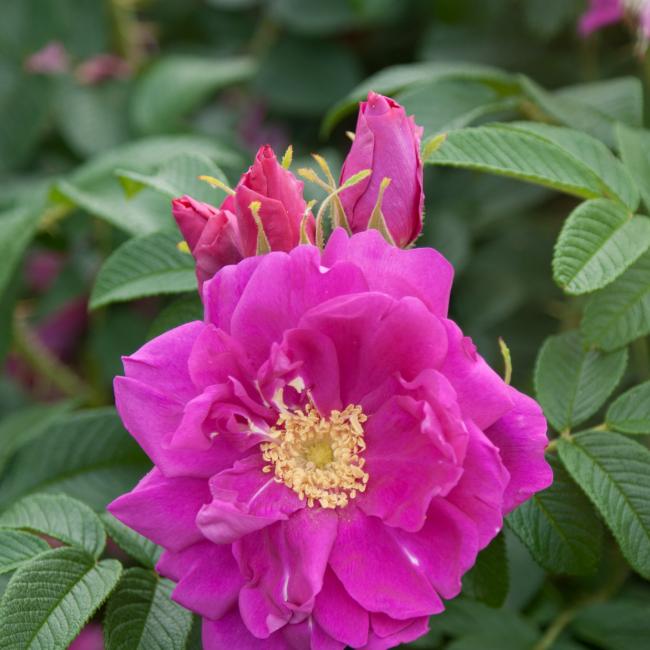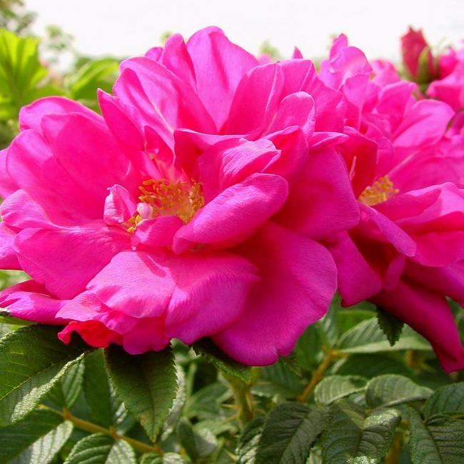 Kleine struikroos met oranje-rood halfgevulde bloemen. Zeer robuuste groei. De bloemen zijn ca 6 cm en komen met 5-7 stuks aan een steel. Per m2 meter 4 rozen planten. Krijgt in de herfst veel ronde vlezige, rode bottels. Zeer dankbaar en gezond.