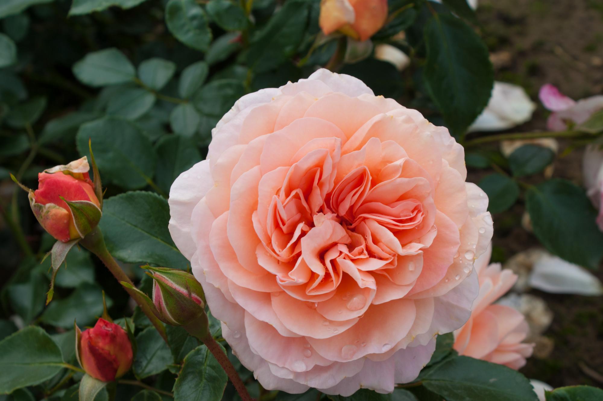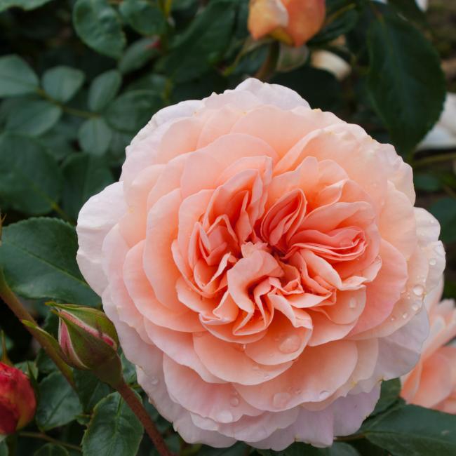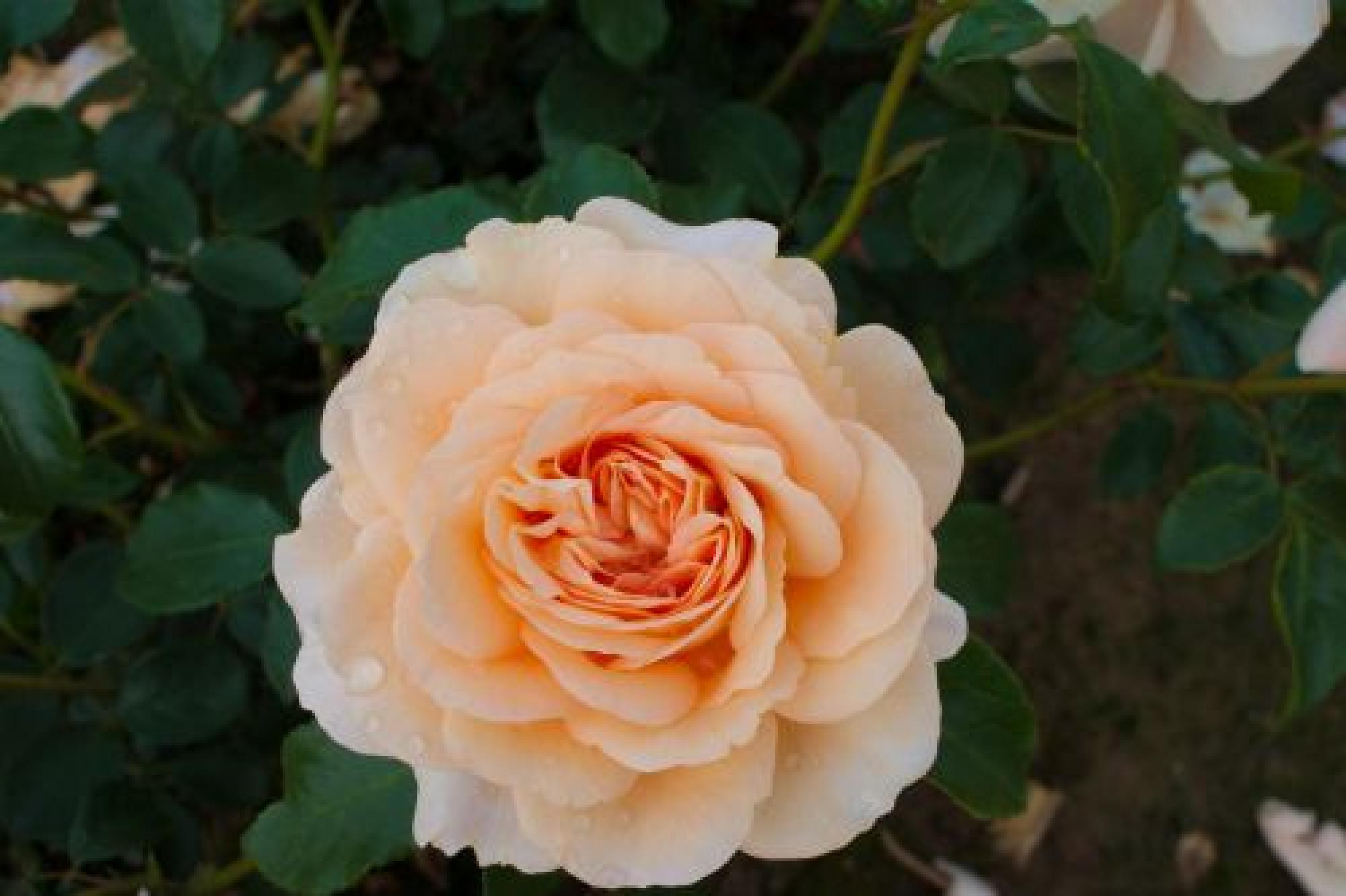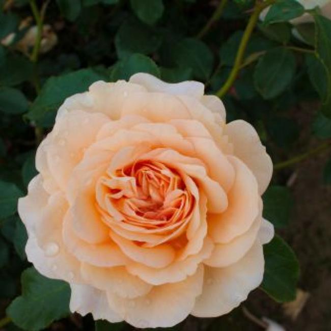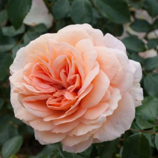 Zacht abrikooskleurige perkroos met een sterke grote rijkelijk gevulde bloemenpracht, die gedurende de bloei langzaam verkleurd naar coupes van een zacht roze.Gedrongen, compacte bossige groei, met sterke vertakkingen, met donkergroen glanzend gezond loof.