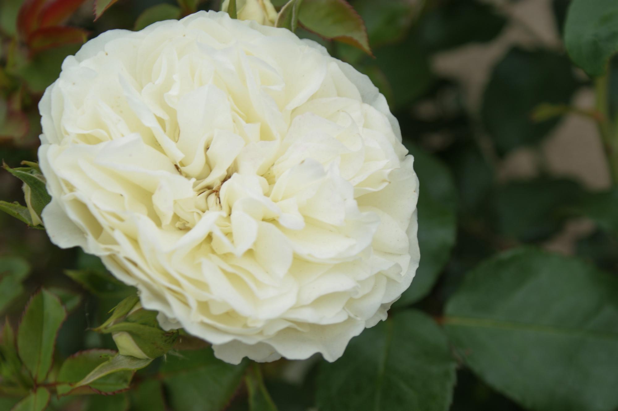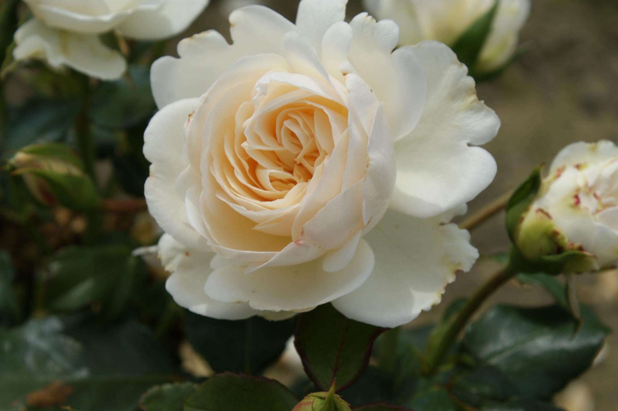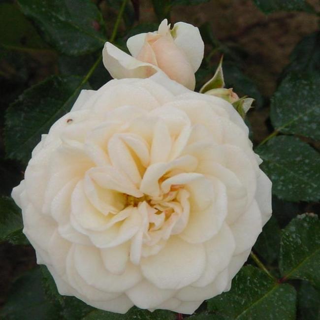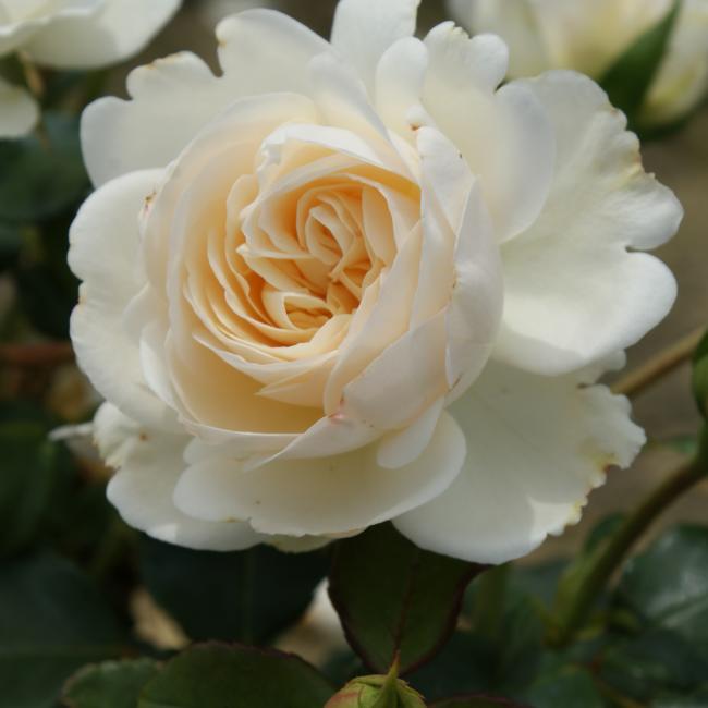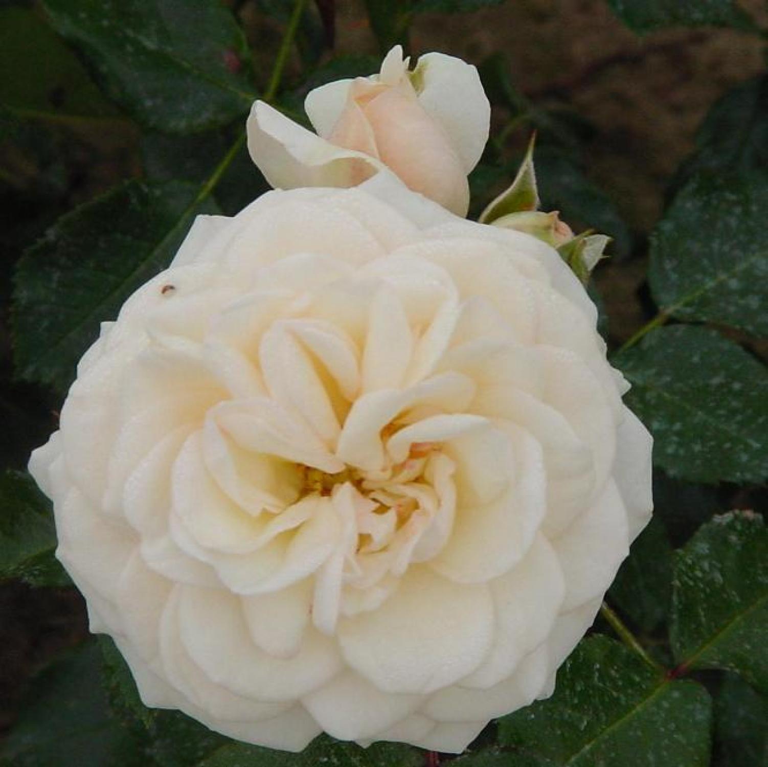 Licht gevulde witte rozen die naar het midden toe gelig worden. Deze roos heeft een iets licht roze gloed. Bloeit in grote trossen met komvormige bloemetjes. Groeit bossig en breed en heeft glanzende bladeren.