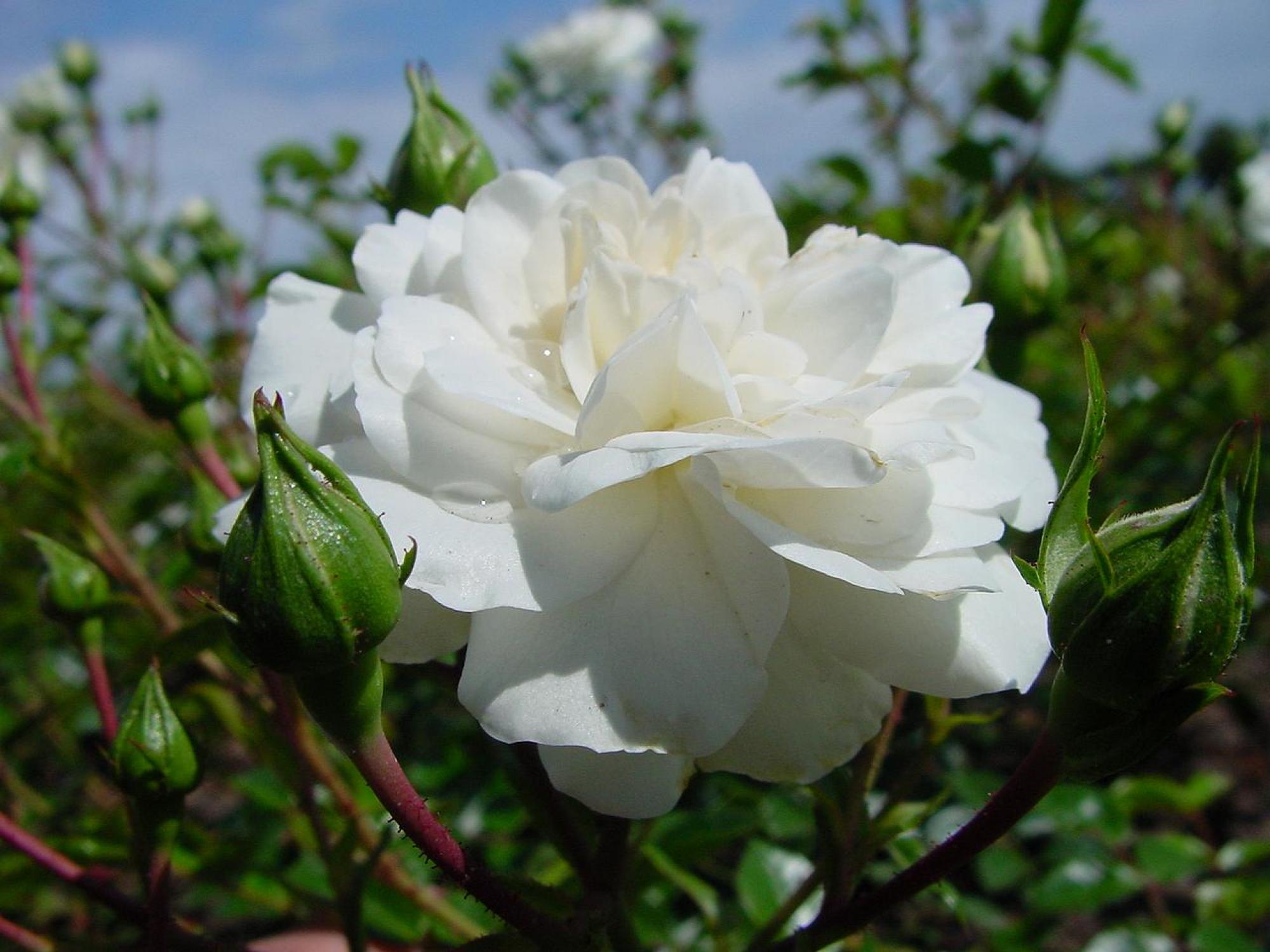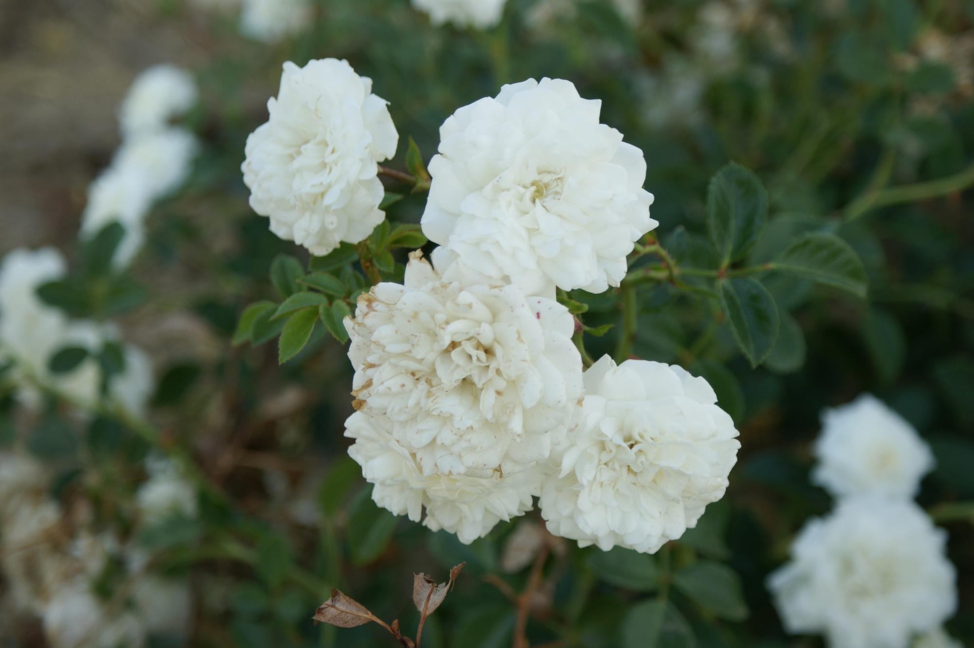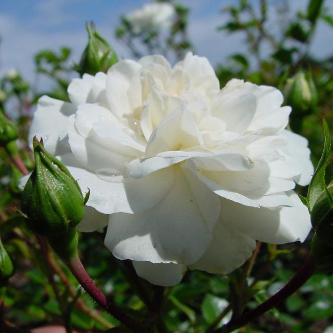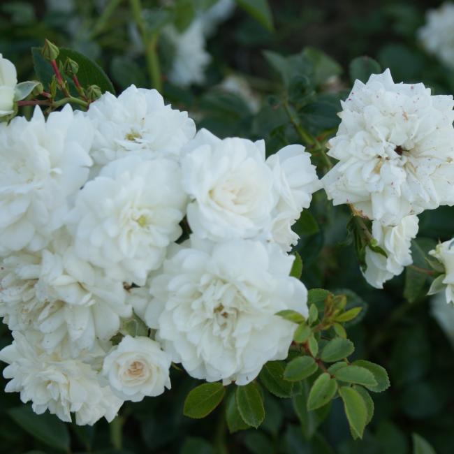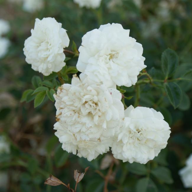 Roos welke uitlopers vormt, waarbij het geheel uitgroeit tot een enigszins hangende struik met crème witte, pompoenachtige bloemen en glanzend groene bladeren.Bloeit de hele zomer tot laat in de herfst. Wordt gebruikt als bodembedekker.